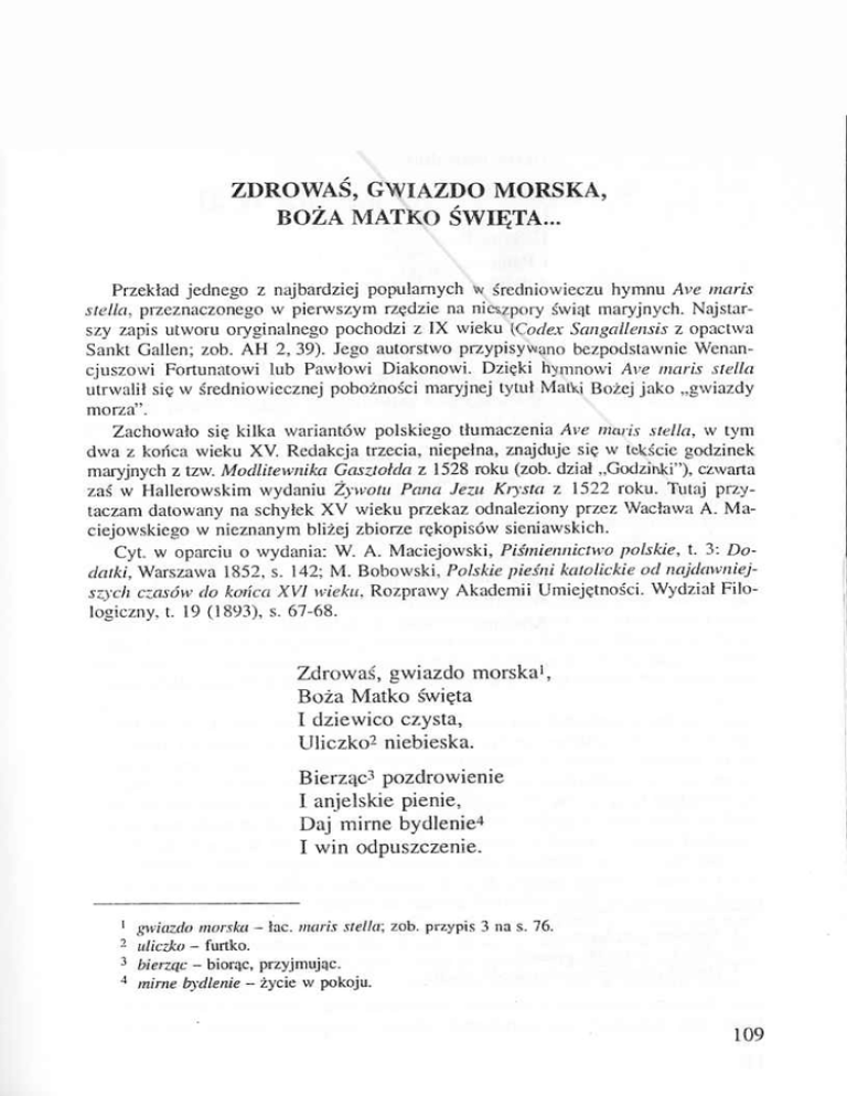 ZDROWAŚ, GWIAZDO MORSKA, BOŻA MATKO ŚWIĘTA… P rz e k ła d je d n e g o z n a jb a rd z ie j p o p u la rn y c h w ś re d n io w ie c z u h y m n u A ve m aris stella, p rz e z n a c z o n e g o w p ie rw s z y m rz ę d z ie n a n ieszp o ry św iąt m a ry jn y c h . N a jsta r sz y zap is u tw o ru o ry g in a ln e g o p o c h o d z i z IX w ie k u (C odex Sangallensis z o p a c tw a S a n k t G a lle n ; z o b . A H 2 , 39). Je g o a u to rstw o p rz y p isy w a n o b e z p o d s ta w n ie W e n a n c ju s z o w i F o rtu n a to w i lu b P a w io w i D ia k o n o w i. D zięk i h y m n o w i A ve m aris s tella u trw a lił się w ś re d n io w ie c z n e j p o b o ż n o ś c i m a ry jn e j ty tu ł M atki B o ż ej ja k o „ g w ia z d y m o rz a ” . Z a c h o w a ło się k ilk a w a ria n tó w p o ls k ie g o tłu m a c z e n ia A ve maris s tella, w ty m d w a z k o ń c a w ie k u XV. R e d a k c ja trz e c ia , n ie p e łn a , z n a jd u je się w tek ście g o d z in e k m ary jn y ch z tzw. M odlitew nika G asztolda z 1528 roku (zob. dział „G odzinki”), czw arta z a ś w H a lle ro w s k im w y d a n iu Ż yw ota P ana Jezu Krysta z 1522 ro k u . T utaj p rz y ta c z a m d a to w a n y n a s c h y łe k X V w ie k u p rz e k a z o d n a le z io n y p rz e z W ac ła w a A. M a c ie jo w s k ie g o w n ie z n a n y m b liż e j z b io rz e rę k o p isó w sie n ia w sk ic h . C y t. w o p a rc iu o w y d a n ia : W . A . M a c ie jo w sk i, P iśm iennictw o polskie, t. 3: D o datki, W a rsz a w a 1852, s. 142; M . B o b o w s k i, Polskie pieśni katolickie o d najdaw niej szych czasów do końca X V I wieka. R o z p ra w y A k a d e m ii U m ie ję tn o śc i. W y d z ia ł F ilo lo g ic z n y , t. 19 (1 8 9 3 ), s. 6 7 -6 8 . Zdrowaś, gwiazdo morska1, Boża Matko święta I dziewico czysta, Uliczko2 niebieska. Bierząc3 pozdrowienie I anjelskie pienie, Daj mirne bydlenie4 I win odpuszczenie. 1 2 3 4 gwiazdo morska – łac. maris stella; zob. przypis 3 na s. 76. uliczko – furtko. bierząc – biorąc, przyjm ując. mirne bydlenie – życie w pokoju. 109 Rozwiąży związane, Oświeć zaślepione, Odpędź nasze złości, Uproś nam dobroci Ukaż się nam M atką I miłą rzecznic ą1 U Syna Bożego I Pana naszego. Alleluja. D z ie wico osobna2, N a d wszystki pokorna, Uczyń rozwiązane Nas, czyste i skromne. Daj nam żywot czysty I chodnik przezpieczny2, Jezusa oglądać, W niebie się radować. Bądź cześć Bogu Oćcu I Synu Bożemu I Duchu Świętemu, W Trojcy Jedynemu. Alleluja. 1rzecznicą – orędowniczką. 2 osobna – niezwykła, przednia. 3 chodnik przezpieczny – bezpieczną ścieżkę. 110