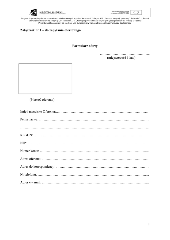 Program aktywizacji społeczno – zawodowej osób bezrobotnych w gminie Naruszewo”, Priorytet VII. „Promocja integracji społecznej”, Działanie 7.1 „Rozwój i upowszechnienie aktywnej integracji”, Poddziałanie 7.1.1 „Rozwój i upowszechnianie aktywnej integracji przez ośrodki pomocy społecznej” Projekt współfinansowany ze środków Unii Europejskiej w ramach Europejskiego Funduszu Społecznego Załącznik nr 1 – do zapytania ofertowego Formularz oferty …………………………………….. (miejscowość i data) (Pieczęć oferenta) Imię i nazwisko Oferenta:……………………………………………………………………… Pełna nazwa: …………………………………………………………………………………… ………………………………………………………………………………………………….. REGON: ……………………………………………………………………………………….. NIP: ……………………………………………………………………………………………. Numer konta: …………………………………………………………………………………... Adres oferenta: ………………………………………………………………………………… Adres do korespondencji: ……………………………………………………………………… Nr telefonu: …………………………………………………………………………………….. Adres e – mail: …………………………………………………………………………………. 1 Program aktywizacji społeczno – zawodowej osób bezrobotnych w gminie Naruszewo”, Priorytet VII. „Promocja integracji społecznej”, Działanie 7.1 „Rozwój i upowszechnienie aktywnej integracji”, Poddziałanie 7.1.1 „Rozwój i upowszechnianie aktywnej integracji przez ośrodki pomocy społecznej” Projekt współfinansowany ze środków Unii Europejskiej w ramach Europejskiego Funduszu Społecznego Skierowana do: GMINNY OŚRODEK POMOCY SPOŁECZNEJ W NARUSZEWIE NARUSZEWO 19 A 09 – 152 NARUSZEWO Nawiązując do zapytania ofertowego z dnia 12.06.2013r dotyczącego szkolenia warsztatowego wraz z indywidualnymi konsultacjami z doradcą zawodowym i psychologiem dla uczestników projektu „Program aktywizacji społeczno – zawodowej osób bezrobotnych w gminie Naruszewo” realizowanego w ramach Priorytetu VII „Promocja integracji społecznej”, Działanie 7.1 „Rozwój i upowszechnianie aktywnej integracji”, Poddziałanie 7.1.1 „Rozwój i upowszechnianie aktywnej integracji przez ośrodki pomocy społecznej”. Projekt współfinansowany ze środków Unii Europejskiej w ramach Europejskiego Funduszu Społecznego. Przedmiotem oferty jest realizacja usługi szkoleniowej dla 11 uczestników (Beneficjentów Ostatecznych) projektu polegającej na organizacji szkolenia warsztatowego w ilości łącznej 84 godziny tj. 40 godzin zajęć dydaktycznych (w tym jedna godzina poświęcona równości szans kobiet i mężczyzn) plus 33 godziny indywidualnych konsultacji z doradcą zawodowym (tj. po trzy godziny dla każdego uczestnika) i 11 godzin indywidualnych konsultacji z psychologiem (tj. po jednej godzinie dla każdego uczestnika). Usługa ponadto będzie obejmować: zapewnienie uczestnikom materiałów szkoleniowych adekwatnych do tematyki szkolenia (plus jeden zestaw materiałów dla zleceniodawcy); catering w tym obiad dla uczestników szkolenia; ubezpieczenie Beneficjentów Ostatecznych od NNW na czas udziału w szkoleniu warsztatowym oraz indywidualnych konsultacjach z doradcą zawodowym i psychologiem; zwrot kosztów dojazdu uczestnikom szkolenia warsztatowego - na/z zajęcia (zwrot kosztów obowiązuje również podczas indywidualnych konsultacji z doradcą zawodowym i psychologiem); wydanie uczestnikom zaświadczenia potwierdzającego ukończenie szkolenia; miejsce realizacji szkolenia (sala) oraz materiały szkoleniowe będą oznakowane aktualnymi logotypami Unii Europejskiej oraz Programu Operacyjnego Kapitał Ludzki. I. W imieniu firmy szkoleniowej oświadczam, że: 1. Spełnienie przedmiotu zamówienia nastąpi za cenę brutto1 w kwocie: …………………………………………………………zł. słownie………..………………………………………………………………………… .………………………………………………………………………………………….. 1 Cena brutto podana przez Oferenta obejmuje całkowity koszt zorganizowania i przeprowadzenia szkolenia warsztatowego wraz z indywidualnymi konsultacjami z uwzględnieniem podatku VAT. 2 Program aktywizacji społeczno – zawodowej osób bezrobotnych w gminie Naruszewo”, Priorytet VII. „Promocja integracji społecznej”, Działanie 7.1 „Rozwój i upowszechnienie aktywnej integracji”, Poddziałanie 7.1.1 „Rozwój i upowszechnianie aktywnej integracji przez ośrodki pomocy społecznej” Projekt współfinansowany ze środków Unii Europejskiej w ramach Europejskiego Funduszu Społecznego 2. Realizacja przedmiotu zamówienia nastąpi w terminie tj. od ………………..do …………………. 3. Szkolenie zostanie przeprowadzone ……………………………………………….… ……..………………………………………………………………………………………. (dokładny adres miejsca realizacji szkolenia) 4. W cenie oferty zostały uwzględnione wszystkie koszty wykonania zamówienia i realizacji przedmiotu zamówienia. 5. Posiadamy niezbędną wiedzę, doświadczenie oraz potencjał techniczny. 6. Zajęcia będą prowadzone przez trenerów praktyków z adekwatnym wykształceniem i doświadczeniem zawodowym, których dokumenty zostały dołączone do niniejszej oferty. 7. Oświadczamy, iż szkolenie zostanie przeprowadzone zgodnie z zasadą równości szans kobi