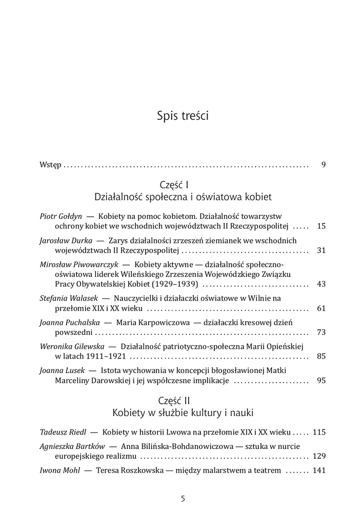 Spis treści Wstęp . . . . . . . . . . . . . . . . . . . . . . . . . . . . . . . . . . . . . . . . . . . . . . . . . . . . . . . . . . . . . . . . . . . . . . . 9 Część I Działalność społeczna i oświatowa kobiet Piotr Gołdyn — Kobiety na pomoc kobietom. Działalność towarzystw ochrony kobiet we wschodnich województwach II Rzeczypospolitej . . . . . 15 Jarosław Durka — Zarys działalności zrzeszeń ziemianek we wschodnich województwach II Rzeczypospolitej . . . . . . . . . . . . . . . . . . . . . . . . . . . . . . . . . . . . . 31 Mirosław Piwowarczyk — Kobiety aktywne — działalność społecznooświatowa liderek Wileńskiego Zrzeszenia Wojewódzkiego Związku Pracy Obywatelskiej Kobiet (1929–1939) . . . . . . . . . . . . . . . . . . . . . . . . . . . . . . . 43 Stefania Walasek — Nauczycielki i działaczki oświatowe w Wilnie na przełomie XIX i XX wieku . . . . . . . . . . . . . . . . . . . . . . . . . . . . . . . . . . . . . . . . . . . . . . . 61 Joanna Puchalska — Maria Karpowiczowa — działaczki kresowej dzień powszedni . . . . . . . . . . . . . . . . . . . . . . . . . . . . . . . . . . . . . . . . . . . . . . . . . . . . . . . . . . . . . . 73 Weronika Gilewska — Działalność patriotyczno-społeczna Marii Opieńskiej w latach 1911–1921 . . . . . . . . . . . . . . . . . . . . . . . . . . . . . . . . . . . . . . . . . . . . . . . . . . . . 85 Joanna Lusek — Istota wychowania w koncepcji błogosławionej Matki Marceliny Darowskiej i jej współczesne implikacje . . . . . . . . . . . . . . . . . . . . . . 95 Część II Kobiety w służbie kultury i nauki Tadeusz Riedl — Kobiety w historii Lwowa na przełomie XIX i XX wieku . . . . . 115 Agnieszka Bartków — Anna Bilińska-Bohdanowiczowa — sztuka w nurcie europejskiego realizmu . . . . . . . . . . . . . . . . . . . . . . . . . . . . . . . . . . . . . . . . . . . . . . . . . 129 Iwona Mohl — Teresa Roszkowska — między malarstwem a teatrem . . . . . . . 141 5 Spis treści Maciej Droń — Erazma Kopaczyńska-Janowicz (1894–1975). Sopran w służbie plebiscytu . . . . . . . . . . . . . . . . . . . . . . . . . . . . . . . . . . . . . . . . . . . . . 149 Joanna Januszewska-Jurkiewicz — „Kochałam to miasto jak człowieka...” Wilno i regionalizm wileński w publicystyce Heleny Romer-Ochenkowskiej w latach 20. XX w. . . . . . . . . . . . . . . . . . . . . . . . . . . . . . . . 163 Dorota Malczewska-Pawelec — Lwów i Kresy Łucji Charewiczowej . . . . . . . . . . 177 Jan Kopiec — Prof. Karolina Lanckorońska (1898–2002) — w służbie Ojczyzny, kultury i nauki . . . . . . . . . . . . . . . . . . . . . . . . . . . . . . . . . . . . . . . . . . . . . . . . 193 Część III Losy kobiet na zesłaniu i w czasie wojny Anita Magowska — Ewa Felińska i inne Sybiraczki w latach 1831–1914 . . . . . 205 Barbara Kubis — Życie codzienne kresowych kobiet w okresie wojny i okupacji radzieckiej (1939–1945) w świetle literatury dokumentu osobistego . . . . . . . . . . . . . . . . . . . . . . . . . . . . . . . . . . . . . . . . . . . . . . . . . . . . . . . . . . . . . . 219 Paweł Polian — Dwa getta — dwa pamiętniki — dwa światy. Notatki Tamary Lazerson z Kowna i Maszy Rolnikaite z Wilna jako źródło historyczne . . . . 235 Mariusz Patelski — „Minister oświaty” ze Stalagu VI C Oberlangen. Szkic do biogra ii Cecylii Jordan Rozwadowskiej (1903–1946) . . . . . . . . . . . 253 Maria Elżbieta Kempa — Dr Halina Maria Jankowska (1890–1944), zasłużona lekarka psychiatra, uczestniczka powstania warszawskiego . . . 269 Jolanta Załęczny — Zo ia Romanowiczówna — lwowska aktywistka z powstańczym rodowodem . . . . . . . . . . . . . . . . . . . . . . . . . . . . . . . . . . . . . . . . . . . . 277 Zbigniew Bereszyński — Przeciwko dwóm okupantom. Stanisława Runiewicz ps. „Kalina” — komendantka Wojskowej Służby Kobiet w Okręgu Tarnopolskim Armii Krajowej i eksterytorialnym Okręgu Tarnopolskim Zrzeszenia „Wolność i Niezawisłość” . . . . . . . . . . . . . . . . . . . . . . 287 Spis ilustracji . . . . . . . . . . . . . . . . . . . . . . . . . . . . . . . . . . . . . . . . . . . . . . . . . . . . . . . . . . . . . . . . 297 Indeks osobowy . . . . . . . . . . . . . . . . . . . . . . . . . . . . . . . . . . . . . . . . . . . . . . . . . . . . . . . . . . . . . 299 Indeks miejscowy . . . . . . . . . . . . . . . . . . . . . . . . . . . . . . . . . . . . . . . . . . . . . . . . . . . . . . . . . . . 312 Table of Contents Introduction . . . . . . . . . . . . . . . . . . . . . . . . . . . . . . . . . . . . . . . . . . . . . . . . . . . . . . . . . . . . . . . . 9 Part 1 Female social and educational activity Piotr Gołdyn — Female security associations activities in eastern voivodeships of Second Polish Republic . . . . . . . . . . . . . . . . . . . . . . . . . . . . . . . . . 29 Jarosław Durka — Female land owner unions in eastern voivodeships of Second Polish Republic . . . . . . . . . . . . . . . . . . . . . . . . . . . . . . . . . . . . . . . . . . . . . . . 42 Mirosław Piwowarczyk — Active women — the social and educational activities of Vilnius Union of Voivodship Female Civic Work Association . . . 60 Stefania Walasek — Teachers and education activists in Vilnius at the turn of the 19th and 20th century . . . . . . . . . . . . . . . . . . . . . . . . . . . . . . . . . . . . . . . . . . . . . . 72 Joanna Puchalska — Maria Karpowiczowa — An ordinary day in the life of an Eastern Borderlands’ activist . . . . . . . . . . . . . . . . . . . . . . . . . . . . . . . . . . . . . . 84 Weronika Gilewska — The patriotic and community activities of Maria Opieńska . . . . . . . . . . . . . . . . . . . . . . . . . . . . . . . . . . . . . . . . . . . . . . . . . . . . . . . . . . . . . . . 93 Joanna Lusek — The essence of upbringing in Blessed Mother Marcelina Darowska’s concept and its modern implications . . . . . . . . . . . . . . . 