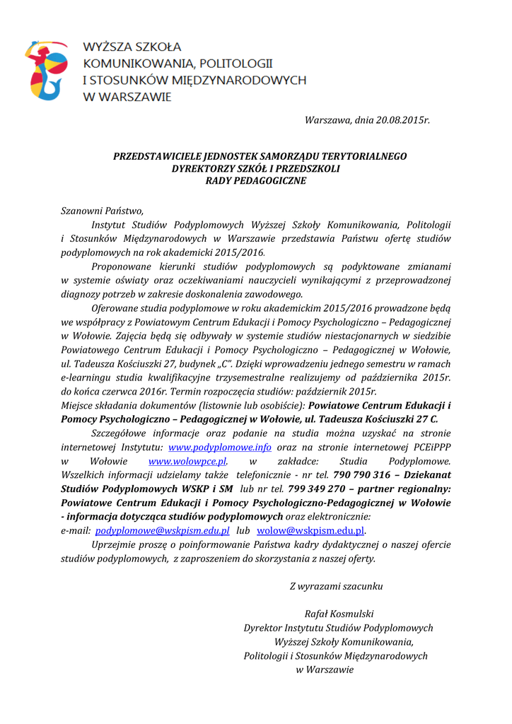 Warszawa, dnia 20.08.2015r. PRZEDSTAWICIELE JEDNOSTEK SAMORZĄDU TERYTORIALNEGO DYREKTORZY SZKÓŁ I PRZEDSZKOLI RADY PEDAGOGICZNE Szanowni Państwo, Instytut Studiów Podyplomowych Wyższej Szkoły Komunikowania, Politologii i Stosunków Międzynarodowych w Warszawie przedstawia Państwu ofertę studiów podyplomowych na rok akademicki 2015/2016. Proponowane kierunki studiów podyplomowych są podyktowane zmianami w systemie oświaty oraz oczekiwaniami nauczycieli wynikającymi z przeprowadzonej diagnozy potrzeb w zakresie doskonalenia zawodowego. Oferowane studia podyplomowe w roku akademickim 2015/2016 prowadzone będą we współpracy z Powiatowym Centrum Edukacji i Pomocy Psychologiczno – Pedagogicznej w Wołowie. Zajęcia będą się odbywały w systemie studiów niestacjonarnych w siedzibie Powiatowego Centrum Edukacji i Pomocy Psychologiczno – Pedagogicznej w Wołowie, ul. Tadeusza Kościuszki 27, budynek „C”. Dzięki wprowadzeniu jednego semestru w ramach e-learningu studia kwalifikacyjne trzysemestralne realizujemy od października 2015r. do końca czerwca 2016r. Termin rozpoczęcia studiów: październik 2015r. Miejsce składania dokumentów (listownie lub osobiście): Powiatowe Centrum Edukacji i Pomocy Psychologiczno – Pedagogicznej w Wołowie, ul. Tadeusza Kościuszki 27 C. Szczegółowe informacje oraz podanie na studia można uzyskać na stronie internetowej Instytutu: www.podyplomowe.info oraz na stronie internetowej PCEiPPP w Wołowie www.wolowpce.pl. w zakładce: Studia Podyplomowe. Wszelkich informacji udzielamy także telefonicznie - nr tel. 790 790 316 – Dziekanat Studiów Podyplomowych WSKP i SM lub nr tel. 799 349 270 – partner regionalny: Powiatowe Centrum Edukacji i Pomocy Psychologiczno-Pedagogicznej w Wołowie - informacja dotycząca studiów podyplomowych oraz elektronicznie: e-mail: [email protected] lub [email protected]. Uprzejmie proszę o poinformowanie Państwa kadry dydaktycznej o naszej ofercie studiów podyplomowych, z zaproszeniem do skorzystania z naszej oferty. Z wyrazami szacunku Rafał Kosmulski Dyrektor Instytutu Studiów Podyplomowych Wyższej Szkoły Komunikowania, Politologii i Stosunków Międzynarodowych w Warszawie