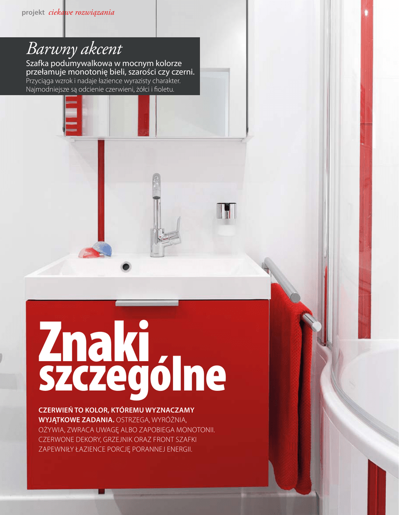 projekt ciekawe rozwiązania Barwny akcent Szafka podumywalkowa w mocnym kolorze przełamuje monotonię bieli, szarości czy czerni. Przyciąga wzrok i nadaje łazience wyrazisty charakter. Najmodniejsze są odcienie czerwieni, żółci i fioletu. Znaki szczególne CZERWIEŃ TO KOLOR, KTÓREMU WYZNACZAMY WYJĄTKOWE ZADANIA. OSTRZEGA, WYRÓŻNIA, OŻYWIA, ZWRACA UWAGĘ ALBO ZAPOBIEGA MONOTONII. CZERWONE DEKORY, GRZEJNIK ORAZ FRONT SZAFKI ZAPEWNIŁY ŁAZIENCE PORCJĘ PORANNEJ ENERGII. Lustrzane fronty szafki wiszącej zostały podświetlone taśmami ledowymi, które zapewniają dobre oświetlenie twarzy podczas codziennej toalety. Czerwone, pionowe pasy dekoracyjne przechodzą ze ścian na obudowę wanny. Czerwone pasy – motyw przewodni aranżacji – zastosowano z wyjątkową konsekwencją. Taki ozdobnik znalazł się nawet na wykonanych na zamówienie drzwiach. NIEWIELKA, ale wygodna i funkcjonalna. Nowoczesna, ale przytulna i ponadczasowa. Urządzona z przewagą bieli i szarości lecz ożywiona czerwienią. Ta łazienka przygotowana jest na lata użytkowania. Można korzystać z kąpieli w wannie, a także wziąć prysznic, ponieważ wannę skompletowano z dedykowanym parawanem. To rozwiązanie proste, wygodne i nie zajmuje miejsca. Półokrągły profil szklanej tafli jest idealnie dopasowany do kształtu wanny, co zapewnia wygodę i nie ogranicza ruchów podczas kąpieli pod natryskiem. Zadbano także o wybór źródła wody. Strumień z deszczownicy zmywa stres i zmęczenie, z kolei słuchawka prysznicowa zapewnia wygodę. Poza strefą kąpielową funkcjonalnością odznacza się także strefa przechowywania. Szafki i schowki zostały zamknięte lustrzanymi frontami – to praktyczny sposób na lustro w łazience. Szafka nad umywalką z podświetleniem taśmą ledową zapewnia komfortowe warunki dla porannej i wieczornej toalety. Z kolei wnęka nad pralką to idealne miejsce do przechowywania m.in. detergentów. Przestrzeń łazienki została podzielona w sposób klarowny i prosty, a tym samym gwarantujący wygodne poruszanie się. Na prawo od wejścia strefa kąpielowa, na lewo – sanitarna i kącik prania, pośrodku natomiast szafka z umywalką. Czerwony kolor frontu akcentuje jej centralną lokalizację, dzięki czemu jest widoczna od wejścia i koncentruje uwagę. A wzrok korzystających z łazienki podąża za kolejnymi czerwonymi akcentami. Grzejnik dekoracyjny, czerwone listwy ceramiczne, dodatki poddały się barwnej gorączce i skutecznie zdynamizowały wnętrze. Trzeba też przyznać, że czerwień trafiła tu na podatny grunt: białe wyposażenie i okładziny ścienne oraz szary gres na podłodze to idealne tło dla kolorowych elementów wyposażenia. ■ TEKST I STYLIZACJA : ANNA USAKIEWICZ ZDJĘCIA: BARTOSZ JAROSZ w w w. d ob r zemieszk a j.pl ■ 1/2014 65 WYPOSAŻENIE I MATERIAŁY ceramika sanitarna: umywalka – z konglomeratu; sedes – Roca baterie: umywalkowa – Hansgrohe; wannowa – Tres „Loft”; deszczownica – Omnires; rączka prysznicowa – Hansgrohe wanna z parawanem: Riho meble: na zamówienie ściany: płytki „Artline Bianco” z oferty sklepu Arcer podłoga: Ceramika Paradyż „Masto Grys” grzejnik: Terma podtynkowy system spłukujący: Geberit INFORMACJE O PROJEKCIE autorka projektu: proj. Iza Szewc; Fabryka Nastroju powierzchnia: ok. 3,5 m2 więcej projektów: Wanna z dedykowanym parawanem to praktyczne rozwiązanie: do wyboru tradycyjna kąpiel albo natrysk. Sterowanie wodą oraz wybór strumienia – z deszczownicy lub rączki prysznicowej – umożliwia bateria podtynkowa. Okładziny ścienne z białych płytek dekorują czerwone listwy szklane ułożone pionowo. Wtórują im poziome kolektory czerwonego grzejnika oraz oryginalny pas na drzwiach. 66 1 /2014 ■ w w w.dob r ze m i e sz k aj. p l Szara deska sedesu dobrze komponuje się z kolorem podłogi wykończonej gresem. Dzięki szarości oraz czerwonym akcentom strefa sanitarna nie sprawia wrażenia nazbyt sterylnej.