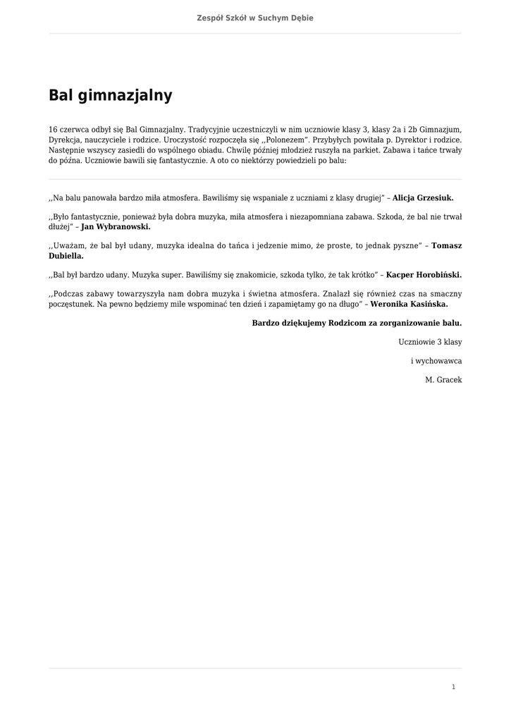 Zespół Szkół w Suchym Dębie Bal gimnazjalny 16 czerwca odbył się Bal Gimnazjalny. Tradycyjnie uczestniczyli w nim uczniowie klasy 3, klasy 2a i 2b Gimnazjum, Dyrekcja, nauczyciele i rodzice. Uroczystość rozpoczęła się ,,Polonezem”. Przybyłych powitała p. Dyrektor i rodzice. Następnie wszyscy zasiedli do wspólnego obiadu. Chwilę później młodzież ruszyła na parkiet. Zabawa i tańce trwały do późna. Uczniowie bawili się fantastycznie. A oto co niektórzy powiedzieli po balu: ,,Na balu panowała bardzo miła atmosfera. Bawiliśmy się wspaniale z uczniami z klasy drugiej” – Alicja Grzesiuk. ,,Było fantastycznie, ponieważ była dobra muzyka, miła atmosfera i niezapomniana zabawa. Szkoda, że bal nie trwał dłużej” – Jan Wybranowski. ,,Uważam, że bal był udany, muzyka idealna do tańca i jedzenie mimo, że proste, to jednak pyszne” – Tomasz Dubiella. ,,Bal był bardzo udany. Muzyka super. Bawiliśmy się znakomicie, szkoda tylko, że tak krótko” – Kacper Horobiński. ,,Podczas zabawy towarzyszyła nam dobra muzyka i świetna atmosfera. Znalazł się również czas na smaczny poczęstunek. Na pewno będziemy mile wspominać ten dzień i zapamiętamy go na długo” – Weronika Kasińska. Bardzo dziękujemy Rodzicom za zorganizowanie balu. Uczniowie 3 klasy i wychowawca M. Gracek 1