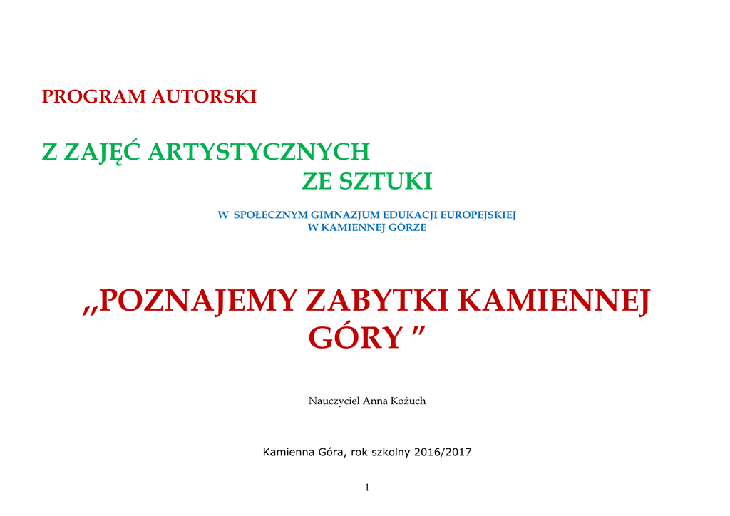 PROGRAM AUTORSKI Z ZAJĘĆ ARTYSTYCZNYCH ZE SZTUKI W SPOŁECZNYM GIMNAZJUM EDUKACJI EUROPEJSKIEJ W KAMIENNEJ GÓRZE ,,POZNAJEMY ZABYTKI KAMIENNEJ GÓRY ” Nauczyciel Anna Kożuch Kamienna Góra, rok szkolny 2016/2017 1 I. Wstęp Zajęcia artystyczne w szkole gimnazjalnej są ważnym elementem w edukacji młodzieży. Pogłębiają i rozwijają wiedzę o sztuce, a także rozbudzają wrodzone, manualne zdolności uczniów. Kultura estetyczna i artystyczna niesie ze sobą system wartości niezbędnych do ogólnego rozwoju osobowości uczniów. Zrozumienie dzieł wielkich mistrzów jak i twórczości innych ludzi powinno być poparte własną twórczością plastyczna, ze zrozumieniem środków artystycznego przekazu tj.; barwa, przestrzeń, faktura, linia, kompozycja itd. Uczniowie zdobywając wiedzę i umiejętności mogą wnikliwiej odbierać i analizować prace plastyczne. Program ,, Poznajemy zabytki Kamiennej Góry” zawiera istotne treści, pozwalające poznać zabytki własnego regionugłównie zabytki Kamiennej Góry. Przedstawia również wybrane zagadnienia plastyczne, prezentuje różne rodzaje technik plastycznych i wykorzystywanych materiałów. Uczniowie – przyszli odbiorcy sztuki- sami stają wobec próby tworzenia, mogą osobiście przekazać własne emocje, które często nie rozładowane we właściwy sposób stają się źródłem problemów. Zmagania z własną twórczością, radość tworzenia, wzruszenia towarzyszące dostrzeganiu piękna w otaczającym świecie stają się niezwykle istotnym elementem budującym osobowość młodego człowieka. Program obejmuje treści realizowane w ramach zajęć artystycznych Zajęcia odbywać się będą w wymiarze dwóch godzin tygodniowo i są przeznaczone dla uczniów kl I gimnazjum. Celem nadrzędnym jaki został wyznaczony jest nauczenie młodzieży czerpania radości z tworzenia i zapoznanie się z pięknem najbliższej okolicy- Kamiennej Góry oraz poznanie głównych zabytków miasta. 2 II. Cele edukacyjne I. Cele ogólne: - przyswojenie przez uczniów podstawowych umiejętności twórczego działania; - rozwijanie wyobraźni i ekspresji twórczej; - wdrażanie do samodzielnego tworzenia; - zapoznanie uczniów ze sztuką we wszystkich jej przejawach (zarówno pod względem teoretycznym jak i praktycznym); - umiejętność analizowania i interpretowania dzieł sztuki; - umożliwienie bezpośredniego kontaktu uczniów z twórczością plastyczną; - zapoznanie uczniów z najważniejszymi zabytkami Kamiennej Góry; II. Cele szczegółowe: - kształcenie umiejętności rysowania i malowania w stopniu uzależnionym od wrodzonych predyspozycji uczniów - rozbudzanie i rozwijanie indywidualnych zainteresowań uczniów; - przyswajanie terminów i pojęć plastycznych oraz swobodne i prawidłowe używanie ich w swoich wypowiedziach; - kształcenie umiejętności posługiwania się środkami plastycznymi dla wyrażania własnych przeżyć, przedstawiania określonych treści; - rozwijanie wyobraźni artystycznej uczniów; - rozwijanie percepcji i ekspresji twórczej – dostrzeganie i odbiór oraz rozumienie i przeżywanie wartości wizualnych w sztuce i otaczającym świecie; - umiejętność swobodnego wypowiadania się na temat sztuki; - kształcenie wrażliwości estetycznej; - wyrabianie umiejętności rozumienia ekspresji innych; - interpretowanie dzieł pod względem treści i formy; - wyrabianie nawyku i potrzeby świadomego uczestniczenia w kontakcie ze sztuką poprzez oglądanie wystaw; 3 - kształcenie kultury plastycznej (wrażliwości na piękno, umiejętności odróżniania sztuki o wartościach artystycznych od kiczu i masowej tandety); - kształcenie postawy tolerancji wobec zjawisk artystycznych; - umiejętność organizowania pracy oraz celowego doboru metod w działaniach plastycznych; III. Główne założenia programowe: - działalność twórcza uczniów; - budzenie zainteresowania sztuką dawną i współczesną; - umiejętność wykorzystywania wiadomości teoretycznych w praktyce; - wyrabianie szacunku do pracy własnej i innych; - twórczość regionalna; - główne zabytki w mieście i najbliższej okolicy; - charakterystyka warsztatu artysty; - techniki i materiały plastyczne; - środki wyrazu artystycznego IV. Charakterystyka materiału nauczania , osiągnięcia uczniów. Materiał w programie nauczania zajęć artystycznych w gimnazjum został podzielony na cztery części, które są złożone z mniejszych sekwencji. Dzięki temu – w zależności od tempa przerabianego materiału – nauczyciel może omawiać poszczególne wątki tematyczne, rozbudowując je lub ograniczając. 4 1.Część pierwsza. Działalność plastyczna uczniów – kompozycje płaskie; - twórczość indywidualna, grupowa, zespołowa; - malowanie i rysowanie w oparciu o naturę lub wyobraźnię z omówieniem środków wyrazu plastycznego tj.: barwa, światłocień, kontrast, perspektywa, kompozycja itd.; - czerpanie inspiracji z przyrody, dzieł wielkich artystów, własnego otoczenia; - zdobywanie i wykorzystywanie wiedzy o tradycyjnych i nowatorskich technikach plastycznych; Osiągnięcia uczniów: Uczeń: - potrafi wykonywać szkice rysunkowe i malarskie z natury i wyobraźni; - umie dobierać odpowiednie środki wyrazu plastycznego do wykonania własnej pracy malarskiej, rysunkowej; - rozróżnia rodzaje kompozycji, perspektywy, barwy, linii itd.; - potrafi posługiwać się określoną techniką malarską, rysunkową; 2.Część druga. Wykorzystanie technologii informacyjnej w nauczaniu zajęć artystycznych; - oglądanie filmów o sztuce, slajdów; - oglądanie filmów o zabytkach Kamiennej Góry; - analiza obrazów na podstawie reprodukcji; 5 Osiągnięcia uczniów: Uczeń: - wyróżnia elementy analizy obrazu (autor, tytuł, data, dziedzina, gatunek); - omawia lub opisuje dzieło sztuki na poziomie dosłownym, podając treść (co lub kogo przedstawia) i zastosowane środki wyrazu plastycznego (kompozycja, plany w o