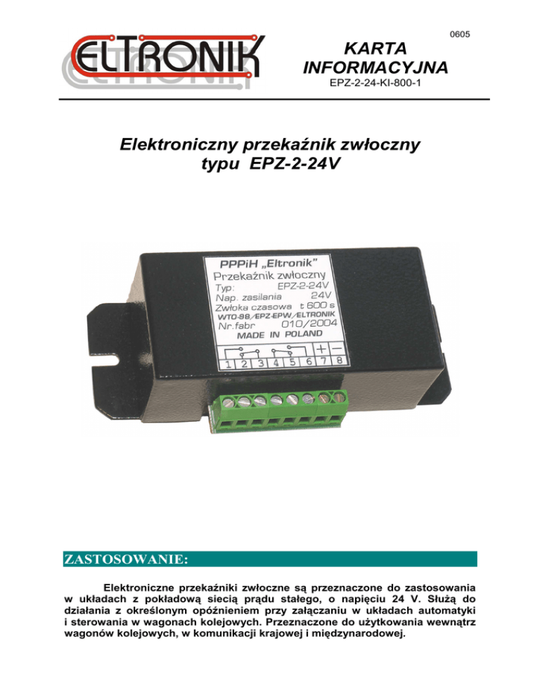 0605 KARTA INFORMACYJNA EPZ-2-24-KI-800-1 Elektroniczny przekaźnik zwłoczny typu EPZ-2-24V ZASTOSOWANIE: Q Elektroniczne przekaźniki zwłoczne są przeznaczone do zastosowania w układach z pokładową siecią prądu stałego, o napięciu 24 V. Służą do działania z określonym opóźnieniem przy załączaniu w układach automatyki i sterowania w wagonach kolejowych. Przeznaczone do użytkowania wewnątrz wagonów kolejowych, w komunikacji krajowej i międzynarodowej. 0605 OPIS: Przekaźnik zwłoczny jest wykonany z wykorzystaniem cyfrowych układów scalonych serii CMOS. Napięcie zasilania jest dostarczane do układu stabilizatora zapewniającego stałe warunki zasilania, niezależne od wahań napięcia zasilania wagonu i temperatury otoczenia. Układ zasilania jest zabezpieczony przed uszkodzeniem wskutek przyłączenia zasilania o polaryzacji przeciwnej. Elementem wykonawczym jest przekaźnik elektromagnetyczny. Na obudowie są umieszczone zaciski do przyłączenia zasilania i obwodów wykonawczych. Oznaczenie zacisków podano na obudowie i przedstawiono na rysunku Ustawienia styków przedstawiono w sytuacji, gdy przekaźnik nie jest zasilany. W przekaźniku EPZ ze zwłoką czasową przy załączeniu, po przyłączeniu do zacisków „+” i „-” napięcia zasilania po upływie czasu zwłoki przełącza styki wykonawcze. 37.0 92.0 120.0 47.0 105.0 DANE TECHNICZNE: • • • • • • • • • • • znamionowe napięcie zasilania ……………………….……...24 V d.c. dopuszczalny zakres zmian napięcia zasilani.…. (od 0,6 do 1,25) UN znamionowy prąd obciążania styków ………….……………16 A/24 V zwłoka czasowa …………………………………….…. wg zamówienia dokładność realizowania zwłoki czasowej .…………………… ± 10 % pobór prądu zasilania ……………….………………………….. < 0.2 A obciążalność obwodów ………………………….………………….. 8 A zewnętrzna temperatura pracy ... klasa T3 wg PN-EN 50155 p. 2.1.2 masa ………………………………….………..…………………….200 g wymiary ……………………….…………....120 mm x 48 mm x 61 mm Warunki Techniczne Wykonania i Odbioru …………EPZ-WTO-800-1 PPPiH ELTRONIK Sp. z o.o. ul. Lelewela 4B 61-409 POZNAŃ tel. +48 (0) 61 830 42 01, 061 839 92 44, 061 839 92 49, fax. 061 830 65 02 http://www.eltronik.pl e-mail: [email protected]