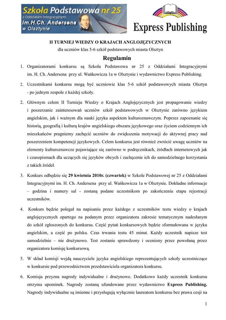 II TURNIEJ WIEDZY O KRAJACH ANGLOJĘZYCZNYCH dla uczniów klas 5-6 szkół podstawowych miasta Olsztyn Regulamin 1. Organizatorami konkursu są Szkoła Podstawowa nr 25 z Oddziałami Integracyjnymi im. H. Ch. Andersena przy ul. Wańkowicza 1a w Olsztynie i wydawnictwo Express Publishing. 2. Uczestnikami konkursu mogą być uczniowie klas 5-6 szkół podstawowych miasta Olsztyn - po jednym zespole z kaŜdej szkoły. 2. Głównym celem II Turnieju Wiedzy o Krajach Anglojęzycznych jest propagowanie wiedzy i poszerzanie zainteresowań uczniów szkół podstawowych w Olsztynie zarówno językiem angielskim, jak i waŜnym dla nauki języka aspektem kulturoznawczym. Poprzez zapoznanie się historią, geografią i kulturą krajów angielskiego obszaru językowego oraz Ŝyciem codziennym ich mieszkańców pragniemy zachęcić uczniów do zwiększenia motywacji do aktywnej pracy nad poszerzeniem kompetencji językowych. Celem konkursu jest równieŜ zwrócić uwagę uczniów na elementy kulturoznawcze pojawiające się zarówno w podręcznikach, źródłach internetowych jak i czasopismach dla uczących się języków obcych i zachęcenie ich do samodzielnego korzystania z takich źródeł. 3. Konkurs odbędzie się 29 kwietnia 2010r. (czwartek) w Szkole Podstawowej nr 25 z Oddziałami Integracyjnymi im. H. Ch. Andersena przy ul. Wańkowicza 1a w Olsztynie. Dokładne informacje – godzina i numery sal - zostaną podane uczestnikom po zakończeniu etapu rejestracji uczestników. 4. Konkurs będzie polegał na napisaniu przez kaŜdego z uczestników testu wiedzy o krajach anglojęzycznych opartego na podanym przez organizatora zakresie tematycznym nadesłanym do szkół zgłoszonych do konkursu. Część pytań konkursowych będzie sformułowana w języku angielskim, a część po polsku. Czas trwania testu 45 minut. KaŜdy uczestnik napisze test samodzielnie – nie druŜynowo. Test zostanie sprawdzony i oceniony przez powołaną przez organizatora komisję konkursową. 5. W skład komisji wejdą nauczyciele języka angielskiego reprezentujących szkoły uczestniczące w konkursie pod przewodnictwem przedstawiciela organizatora konkursu. 6. Komisja przyzna nagrody indywidualne i druŜynowe. Dodatkowo kaŜdy uczestnik konkursu otrzyma upominek. Nagrody zostaną ufundowane przez wydawnictwo Express Publishing. Nagrody indywidualne są imienne i przysługują wyłącznie laureatom konkursu bez prawa cesji na 1 rzecz osób trzecich. Nagrody rzeczowe nie mogą być zamienione na ekwiwalent pienięŜny. 7. O klasyfikacji końcowej szkoły decyduje suma liczby punktów trzech uczestników druŜyny z tej szkoły. Ogłoszenie wyników i nagrodzenie laureatów nastąpi w dniu konkursu. 8. W trakcie trwania konkursu zapraszamy opiekunów - nauczycieli języka angielskiego na szkolenie metodyczne. 9. KaŜda z druŜyn zgłoszonych do udziału w konkursie w ramach przygotowania do konkursu powinna samodzielnie przygotować kalendarz, w którym będą zaznaczone i zilustrowane święta obchodzone w wybranych krajach angielskiego obszaru językowego. Kalendarze powinny być dostarczone organizatorowi do godz. 12.00 dnia 28 kwietnia 2010r (środa). Prace zostaną zaprezentowane na wystawie, a najciekawsza z nich zostanie nagrodzona. 10. Nauczyciel opiekun druŜyny szkolnej wypełnia załączoną kartę zgłoszenia druŜyn z dopiskiem KONKURS SP25 i przesyła faksem na numer Szkoły Podstawowej nr 25 z Oddziałami Integracyjnymi im. H. Ch. Andersena w Olsztynie, tel./fax: (089) 542 67 06 lub zeskanowane i podpisane karty zgłoszeniowe drogą elektroniczną na [email protected]. Zgłoszenie do konkursu druŜyny trzyosobowej szkoła przesyła organizatorowi w terminie do 21 kwietnia 2010r (czwartek). 11. Szczegółowe informacje na temat konkursu zostaną umieszczone na stronie internetowej http://sp25.zso3.olsztyn.pl/ 12. Pytania dotyczące konkursu prosimy kierować na [email protected]. 2