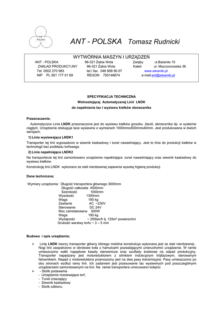ANT - POLSKA Tomasz Rudnicki WYTWÓRNIA MASZYN I URZĄDZEŃ ANT - POLSKA ZAKŁAD PRODUKCYJNY Tel. 0502 270 983 NIP PL 951 177 01 69 96-321 Żabia Wola 96-321 Żabia Wola tel./ fax. 046 858 90 07 REGON 750146674 Zaręby Kaleń ul.Bażanta 15 ul. Mszczonowska 36 www.siewniki.pl e-mail:[email protected] SPECYFIKACJA TECHNICZNA Wolnostojącej Automatycznej Linii LNDK do napełniania tac i wysiewu kiełków słonecznika Przeznaczenie; Automatyczna Linia LNDK przeznaczona jest do wysiewu kiełków groszku ,fasoli, słonecznika itp. w systemie ciągłym. Urządzenie obsługuje tace wysiewne o wymiarach 1000mmx500mmx40mm. Jest produkowana w dwóch wersjach; 1) Linia wysiewająca LNDK1 Transporter tej linii wyposażono w siewnik kaskadowy i tunel nawadniający. Jest to linia do produkcji kiełków w technologii bez podkładu torfowego. 2) Linia napełniająca LNDK2 Na transporterze tej linii zamontowano urządzenie napełniające ,tunel nawadniający oraz siewnik kaskadowy do wysiewu kiełków. Konstrukcję linii LNDK wykonano ze stali nierdzewnej zapewnia wysoką higienę produkcji. Dane techniczne; Wymiary urządzenia: Długość transportera głównego 3000mm Długość całkowita 4500mm Szerokość 1000mm Wysokość 1300mm Waga 190 kg Zasilanie AC ~230V Sterowanie DC 24V Moc zainstalowana 500W Waga 190 kg Wydajność ~ 250tac/h tj. 125m² powierzchni Grubość warstwy torfu ~ 3 – 5 mm Budowa i opis urządzenia; Linię LNDK tworzy transporter główny którego mobilna konstrukcja wykonana jest ze stali nierdzewnej . Nogi linii zaopatrzono w obrotowe koła z hamulcami pozwalającymi unieruchomić urządzenie. W ramie umieszczono wałki napędowe kasety sterownicze oraz szuflady ściekowe na odpad produkcyjny. Transporter napędzany jest motoreduktorem z silnikiem indukcyjnym trójfazowym, sterowanym falownikiem. Napęd z motoreduktora przenoszony jest na dwa pasy transmisyjne. Pasy umieszczono po obu stronach wzdłuż ramy linii. Ich zadaniem jest przesuwanie tac wysiewnych pod poszczególnymi urządzeniami zamontowanymi na linii. Na ramie transportera umocowano kolejno: - Stolik podawania - Urządzenie rozsiewające torf, - Tunel zraszający - Siewnik kaskadowy - Stolik odbioru. Urządzenie napełniające wykonano zostanie ze stali nierdzewnej . Funkcją urządzenia napełniającego jest ułożenie cienkiej warstwy torfu ok. 3-4mm na całej powierzchni tacy . Będzie ona tworzyć środowisko dla ukorzenienia się siewek. Integralną częścią urządzenia jest mini transporter wyposażony w zębaty pas zabierająco-dozujący umieszczony poziomo nad tacami wysiewnymi. Z zawieszonej na pasem komory o poj.~40l, mielony torf jest wygarniany i wysypywany na tace. Dla bardziej wyrównanego ułożenia warstwy torfu na tacy w urządzeniu zastosowano zintegrowaną z przesuwającym się pasem obrotową szczotkę wymiatającą. Urządzenie napędzane jest motoreduktorem z silnikiem trójfazowym asynchronicznym i sterowane falownikiem. Dalej na środku linii zainstalowano tunel nawadniający . Jego funkcją jest silne nawilżenie tac przed wysiewem nasion. W tunelu zainstalowano zraszacze drobnokropliste których celem jest zroszenie substratu i wysianych nasion. Praca zraszaczy jest regulowana elektrozaworem. Tunel wyposażono w rynnę odprowadzającą nadmiar wody . Integralną część urządzenia stanowi siewnik kaskadowy do wysiewu podkiełkowanych nasion. Siewnik rozsypuje równomiernie skiełkowane mokre nasiona po powierzchni tacy. Zamontowane na początku i końcu linii stoliki ułatwiają podawanie o odbiór tac Wszystkie urządzenia uzbrojono w płynny rozruch ,regulację prędkości pracy, pełną synchronizację urządzeń oraz system zabezpieczeń. Zasada działania; Linia LNDK tworzy najprostszy ciąg technologiczny obejmujący procesy; - napełnienia tac torfem - nawodnienia tac . oraz siewu podkiełkowanych nasion Podawanie tac odbywa się ręczne Transportowane tace trafiają pod urządzenie rozsiewające torf .Regulowana jest prędkość przesuwania się tac i prędkość podawania torfu Napełnione cienką (3mm )warstwą torfu tace trafiają następnie pod tunel nawadniający gdzie substrat zostaje zwilżony Następnie taca przesuwana jest pod siewnik kaskadowy wysiewający równomiernie podkiełkowane nasiona na powierzchni substratu Odbiór tac jest ręczny. Opis; . Linia jest prosta w obsłudze. Start linii odbywa się w sposób płynny. W każdej chwili urządzenie można zatrzymać i uruchomić ponownie bez zaburzenia procesu siewu. Transporter, urządzenie napełniające, zraszanie i siewnik są zsynchronizowane. Jednocześnie dla utrzymania wysokiej precyzji siewu prędkości poszczególnych urządzeń można na bieżąco regulować. Do obsługi linii wymagane są trzy osoby – operator (osoba przeszkolona ,znająca urządzenie) i dwóch pomocników . _______________________________________________________________________________ Uwagi; Urządzenie spełnia normy CE Gwarancja: 24 miesiące