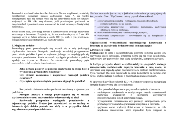 Trudno dziś wyobrazić sobie świat bez Internetu. Nie ma wątpliwości, że stał się Nie bez znaczenia jest też to, z jakimi oczekiwaniami przystępujemy do nieodłącznym elementem naszego codziennego życia. A jak bardzo korzystania z Sieci. Wyróżniono cztery typy takich oczekiwań: nieodłącznym? Jeśli nie możesz obejść się bez sprawdzenia maila lub statusów · oczekiwania interpersonalne – wzbogacenia relacji międzyludzkich, znajomych na FB kilka razy dziennie, jeśli przesiadujesz godzinami na poznanie i zbliżenie się do innych, imageboardach i youtubach, może to oznaczać, że jesteś związany z Siecią bliżej niż myślisz.. · oczekiwania pragmatyczne – ułatwienie komunikacji, zdobywania informacji, rozwoju osobistego, Rośnie liczba osób, które mają problem z kontrolowaniem swojego zachowania · oczekiwania hedonistyczne – zmiany nastroju, rozrywki, związanego z Internetem. Przyjmuje się, że ten problem dotyczy od 3 do 14% · oczekiwania kompensacyjne – oswobodzenie się od kompleksów i populacji, czyli w Polsce mówimy o około 400 tys. osób z tym problemem. zahamowań. Istnieje duże prawdopodobieństwo, że liczba ta wzrasta. 1. Magiczne pudełko Prowadzący prosi prowadzących aby wczuli się w rolę (młodego) użytkownika internetu. Następnie przekazuje wcześniej przygotowane przez siebie pudełko i prosi o wybranie jednego ze znajdujących się wewnątrz przedmiotów. Zanim uczestnik wyciągnie przedmiot z pudełka zgaduje, co trzyma w dłoniach. Po zakończeniu prowadzący pyta uczestników o ich wrażenia i spostrzeżenia. – – – Najsilniejszymi wyznacznikami uzależniającego korzystania Internetu są oczekiwania hedonistyczne i kompensacyjne. z 2.Definicje i teoria Uzależnienie to silna i niekontrolowana potrzeba robienia czegoś czy zażywania jakiejś substancji. Uzależnić można się nie tylko od alkoholu, narkotyków czy papierosów, lecz także od telewizji, komputera czy gier. W każdym przypadku chodzi o szybkie zdobycie „nagrody”: dobrego samopoczucia, rozładowania napięcia, kontaktu z inną osobą. W Jakie uczucia pojawiły się podczas oczekiwania na swoją kolej i internecie taką nagrodą są też: poczucie bycia w centrum zainteresowania, wyjmowania przedmiotów z pudełka? bycia ważnym (bo ktoś odpowiada na moje komentarze na forum) oraz Czy element zaskoczenia i niepewności wzmagał państwa nowe, szybkie relacje z osobami o podobnych zainteresowaniach. ciekawość? Czy chętnie spróbowalibyście ponownie sięgnąć do pudełka? W oparciu o klasyfikację chorób ICD-10, Woronowicz przyjął następujące kryteria diagnostyczne dla siecioholizmu: Korzystanie z internetu można porównać do zabawy z tajemniczym pudełkiem. Mnogość przeżyć i emocji pojawiających się w trakcie użytkowania internetu, może utrudniać oderwanie się od sieci. Surfowanie przypomina wyciąganie przedmiotów z tajemniczego pudełka. Trudno jest przewidzieć, na co trafimy w internecie (jak daleko poniesie nas sieć). A w przypadku dzieci zagrożeniem są nieodpowiednie treści. • silna potrzeba lub poczucie przymusu korzystania z Internetu, • subiektywne przekonanie o zmniejszonym stopniu samokontroli zachowań związanych z Internetem dotyczących powstrzymywania się od korzystania z sieci, • występowanie rozdrażnienia czy gorszego samopoczucia, przy próbach przerwania lub ograniczenia korzystania z Internetu, • spędzanie coraz większej ilości czasu w Internecie, w celu uzyskania zadowolenia, które poprzednio było osiągane w znacznie krótszym czasie, 4. Fazy uzależnienia od internetu • postępujące zaniedbywanie innych źródeł przyjemności lub (Potrzebne 3 osoby) dotychczasowych zainteresowań na rzecz Internetu, · używanie • korzystanie z zasobów Sieci pomimo szkodliwych następstw Nasz użytkownik poznaje internet. Racjonalne oraz efektywnie (fizycznych, psychicznych i społecznych), o których wiadomo, że wykorzystuje Internet. W tej fazie użytkownik ma raczej mają związek ze spędzaniem czasu w Internecie. okazjonalny kontakt z wirtualną rzeczywistością, która staje się Aby dokonać pełnego rozpoznania, to spośród wymienionych objawów w źródłem zainteresowania, wiedzy i rozrywki; Użytkownik jest ciągu ostatniego roku muszą pojawić się minimum trzy. wesoły, jest wolny, (chodzi po klasie, może poruszać rękami i nogami) – ma swoje zainteresowania i pasje, utrzymuje kontakty z bliskimi i znajomymi (może przywitać się z kimś w Uzależnienie to proces, który ma swoje fazy oraz specyficzne zjawiska, grupie) które postaramy się teraz omówić. Niestety nasz internauta zbyt mocną dał się wciągnąć internetowi · uzależnienie – etap ten zaczyna się w momencie, gdy pojawia się 3. Mechanizm zaprzeczeń (w sieci zaprzeczeń) wzmożona (nawykowa) potrzeba korzystania z zasobów Sieci, Początkowo nawet jest mu przyjemnie, robi to co lubi, zaspakaja swoje potrzeby, Razem zawsze raźniej. Jednak coraz Potrzebna 1 osoba częściej ich drogi się rozchodzą. Uzależnienie przejmuję Podobnie jak w przypadku uzależnienia od substancji psychoaktywnych kontrolę. Nasz internauta porzuca inne źródła zainteresowania, osoba tracąca kontrolę nad korzystaniem z internetu wpada w pułapkę uzależnienie odciąga go od rodziny, znajomych. Gdy jest w mechanizmu zaprzeczeń, który w skuteczny sposób zniekształca stanie ograniczonego dostępu on-line, skutkuje to obsesyjnym spostrzeganie rzeczywistości przez osobę. myśleniem na temat Internetu oraz wywołuje przygnębienie i lęk; W czasie omawiania tego ćwiczenia należy zwrócić uwagę uczniom, że · destrukcja – użytkownik w bardzo wyraźny sposób ogranicza bez pomocy osoby z zewnątrz, osoba uzależniona (mająca problem z (lub nie podejmuje w ogóle) działania związane z używaniem) nie może sama sobie pomóc} funkcjonowaniem na polu rodzinnym, zawodowym, rekreacyjnym, uczestniczy jedynie w
