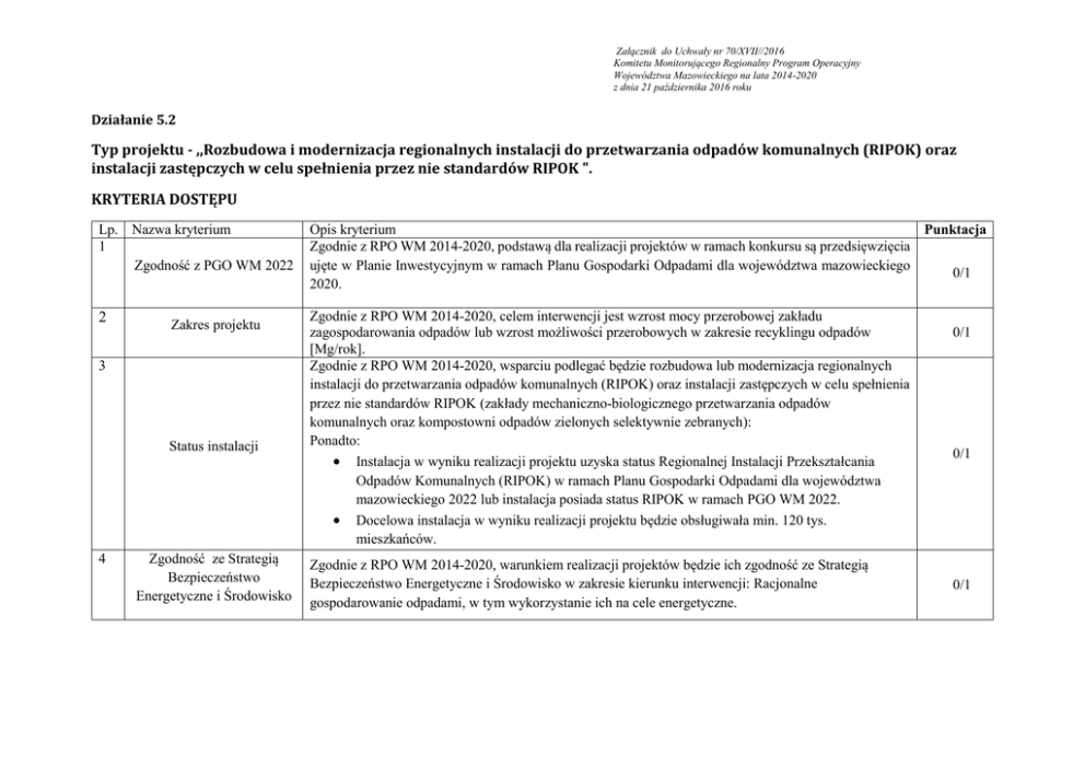 Załącznik do Uchwały nr 70/XVII//2016 Komitetu Monitorującego Regionalny Program Operacyjny Województwa Mazowieckiego na lata 2014-2020 z dnia 21 października 2016 roku Działanie 5.2 Typ projektu - ,,Rozbudowa i modernizacja regionalnych instalacji do przetwarzania odpadów komunalnych (RIPOK) oraz instalacji zastępczych w celu spełnienia przez nie standardów RIPOK ". KRYTERIA DOSTĘPU Lp. Nazwa kryterium 1 Zgodność z PGO WM 2022 Opis kryterium Punktacja Zgodnie z RPO WM 2014-2020, podstawą dla realizacji projektów w ramach konkursu są przedsięwzięcia ujęte w Planie Inwestycyjnym w ramach Planu Gospodarki Odpadami dla województwa mazowieckiego 0/1 2020. 2 Zgodnie z RPO WM 2014-2020, celem interwencji jest wzrost mocy przerobowej zakładu zagospodarowania odpadów lub wzrost możliwości przerobowych w zakresie recyklingu odpadów [Mg/rok]. Zgodnie z RPO WM 2014-2020, wsparciu podlegać będzie rozbudowa lub modernizacja regionalnych instalacji do przetwarzania odpadów komunalnych (RIPOK) oraz instalacji zastępczych w celu spełnienia przez nie standardów RIPOK (zakłady mechaniczno-biologicznego przetwarzania odpadów komunalnych oraz kompostowni odpadów zielonych selektywnie zebranych): Ponadto: Instalacja w wyniku realizacji projektu uzyska status Regionalnej Instalacji Przekształcania Odpadów Komunalnych (RIPOK) w ramach Planu Gospodarki Odpadami dla województwa mazowieckiego 2022 lub instalacja posiada status RIPOK w ramach PGO WM 2022. Docelowa instalacja w wyniku realizacji projektu będzie obsługiwała min. 120 tys. mieszkańców. Zakres projektu 3 Status instalacji 4 Zgodność ze Strategią Bezpieczeństwo Energetyczne i Środowisko Zgodnie z RPO WM 2014-2020, warunkiem realizacji projektów będzie ich zgodność ze Strategią Bezpieczeństwo Energetyczne i Środowisko w zakresie kierunku interwencji: Racjonalne gospodarowanie odpadami, w tym wykorzystanie ich na cele energetyczne. 0/1 0/1 0/1 5 Zgodność z wymogami tzw. ramowej dyrektywy o odpadach Zgodnie z RPO WM 2014-2020, warunkiem realizacji projektów będzie ich zgodność z wymogami Dyrektywy Parlamentu Europejskiego i Rady 2008/98/WE z dnia 19 listopada 2008 r. w sprawie odpadów oraz uchylająca niektóre dyrektywy. 0/1 KRYTERIA MERYTROYCZNO-SZCZEGÓŁOWE L.p. Kryterium Efektywność kosztowa Opis kryterium Zgodnie z RPO WM 14-20, wskaźnik: „Dodatkowe możliwości przerobowe w zakresie recyklingu odpadów (CI 17) [tony/rok]” będzie służył KE do oceny realizacji celów RPO WM. Kryterium jest liczone zgodnie z poniższym wzorem: Punktacja Maksymalna liczba punktów Średnia wartość dofinansowania UE w przeliczeniu na 1 tonę/rok mocy przerobowych w zakresie recyklingu odpadów w projekcie: Wartość dofinansowania UE projektu (euro) 1 < 1228 euro Wartości docelowa wskaźnika w ramach projektu: „Dodatkowe możliwości przerobowe w zakresie recyklingu odpadów (CI 17) [tony/rok]” Wartość dofinansowania UE wsparcia w przeliczeniu na 1 tonę/rok mocy przerobowych w zakresie recyklingu odpadów nie może przekroczyć kwoty 1228 euro. Koszt należy przeliczyć kursem euro podanym w regulaminie konkursu. poniżej 1000 euro – 8 pkt poniżej 1228 euro – 5 pkt; Brak spełnienia wyżej wymienionych warunków lub brak informacji w tym zakresie – 0 pkt. Koszt należy przeliczyć kursem Jako wartość wskaźnika „Dodatkowe możliwości przerobowe w zakresie recyklingu euro podanym w regulaminie odpadów” należy podać roczną moc przerobową nowych instalacji do recyklingu konkursu. odpadów na podstawie dokumentacji projektowej. W przypadku rozbudowy istniejących instalacji należy podać jedynie wartość wynikającą z różnicy pomiędzy stanem po zakończeniu realizacji inwestycji a stanem bazowym. 8 Efektywność kosztowa W przypadku, gdy wspierane zakłady zagospodarowania odpadów nie będą bezpośrednio realizowały procesu recyklingu odpadów, liczona będzie masa odpadów poddana odzyskowi, które zostaną skierowane do wyspecjalizowanych zakładów zajmujących się recyklingiem, tzw. ostatecznego recyklera (co musi być potwierdzone w osobnych dokumentach). Zgodnie z RPO WM 14-20, wskaźnik: „Moc przerobowa zakładu Średnia wartość zagospodarowania odpadów [Mg/rok]” będzie służył KE do oceny realizacji celów dofinansowania UE w RPO WM. przeliczeniu na 1 tonę/rok nowej mocy przerobowej odpadów w projekcie: Kryterium jest liczone zgodnie z poniższym wzorem: Wartość dofinansowania UE projektu (euro) < 63 euro Wartości docelowa wskaźnika w ramach projektu: „Moc przerobowa zakładu zagospodarowania odpadów [Mg/rok]” Wartość dofinansowania UE wsparcia w przeliczeniu na 1 tonę/rok nowej mocy przerobowej odpadów nie może przekroczyć kwoty 63 euro. Koszt należy przeliczyć kursem euro podanym w regulaminie konkursu. 2 Jako wartość wskaźnika „Moc przerobowa zakładu zagospodarowania odpadów” należy podać masę odpadów, jaką może przyjąć do odzysku i/lub unieszkodliwiania w ciągu roku zakład zagospodarowania odpadów (ZZO) na podstawie dokumentacji projektowej, który otrzymał wsparcie w ramach dofinansowanego projektu. W przypadku projektu dotyczącego rozbudowy ZZO, moc przerobowa oznacza różnicę, pomiędzy stanem po zakończeniu realizacji inwestycji a stanem bazowym, masy odpadów, jakie zakład ma możliwości przerobienia w ciągu jednego roku przy założeniu 100% wydajności pracy instalacji. W ramach kryterium oceniany będzie stan przygotowania projektu do realizacji. 3 Gotowość projektu do realizacji poniżej 53 euro – 3 pkt; poniżej 63 euro – 1 pkt; Brak spełnienia wyżej wymienionych warunków lub brak informacji w tym zakresie – 0 pkt. 3 Koszt należy przeliczyć kursem euro podanym w regulaminie konkursu. Punkty przyznawane są w następujący sposób: w stosunku do projektu została wydana ostateczna decyzja o 6 Certyfikaty środowiskowe 4 pozwolenie na budowę i na decyzję nie została wniesio