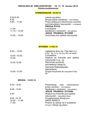 REKOLEKCJE WIELKOPOSTNE 10, 11, 12 marzec 2014 Szkoła podstawowa PONIEDZIAŁEK 10.03.14 8.30-9.25 9.30 9.40 – 11.00 11.00 11.15 – 12.30 12.30 – 13.00 Lekcje wg planu Rozpoczęcie rekolekcji – hol szkolny Praca plastyczno-techniczna uczniów pod kierunkiem nauczycieli – w klasach DROGA ŻYCIA II śniadanie Spotkanie z siostrami – hol szkolny JEZUS PRAWDĄ I ŻYCIEM Uczniowie pod opieką nauczycieli WTOREK 11.03.14 8.30 – 10.00 Oglądanie filmu św. Filip Neri cz.I kl.3p – 6p, kl.1p -2p inny film lub lekcje 10.00 -10.20 10.20 10.40 12.00 12.00 -13.00 II śniadanie Wyjście do kościoła pod opieką nauczycieli kl.3p – 6p Rachunek sumienia SPOWIEDŹ ŚWIĘTA, Adoracja Najświętszego Sakramentu Droga Krzyżowa dla wszystkich klas SP ŚRODA 12.03.14 8.30 – 8.45 8.45 – 9.45 9.45 9.55 -10.15 10.20 – 11.00 11.00 Prezentacja prac wykonanych przez uczniów - hol szkolny Spotkanie z siostrami – hol szkolny JEZUS PRAWDĄ I ŻYCIEM Wyjście do kościoła pod opieką nauczycieli – wszystkie klasy Przygotowanie liturgiczne MSZA ŚWIĘTA Powrót do szkoły na II śniadanie (II tura) i lekcje wg planu