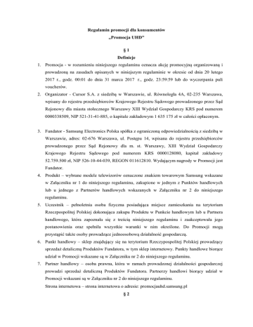 Regulamin promocji dla konsumentów „Promocja UHD” §1 Definicje 1. Promocja - w rozumieniu niniejszego regulaminu oznacza akcję promocyjną organizowaną i prowadzoną na zasadach opisanych w niniejszym regulaminie w okresie od dnia 20 lutego 2017 r., godz. 00:01 do dnia 31 marca 2017 r., godz. 23:59:59 lub do wyczerpania puli voucherów. 2. Organizator - Cursor S.A. z siedzibą w Warszawie, ul. Równoległa 4A, 02-235 Warszawa, wpisany do rejestru przedsiębiorców Krajowego Rejestru Sądowego prowadzonego przez Sąd Rejonowy dla miasta stołecznego Warszawy XIII Wydział Gospodarczy KRS pod numerem 0000338509, NIP 521-31-41-885, o kapitale zakładowym 1 635 175 zł w całości opłaconym. 3. Fundator - Samsung Electronics Polska spółka z ograniczoną odpowiedzialnością z siedzibą w Warszawie, adres: 02-676 Warszawa, ul. Postępu 14, wpisana do rejestru przedsiębiorców prowadzonego przez Sąd Rejonowy dla m. st. Warszawy, XIII Wydział Gospodarczy Krajowego Rejestru Sądowego pod numerem KRS 0000128080, kapitał zakładowy 52.759.500 zł, NIP 526-10-44-039, REGON 011612810. Wydającym nagrody w Promocji jest Fundator. 4. Produkt – wybrane modele telewizorów oznaczone znakiem towarowym Samsung wskazane w Załączniku nr 1 do niniejszego regulaminu, zakupione w jednym z Punktów handlowych lub u jednego z Partnerów handlowych wskazanych w Załączniku nr 2 do niniejszego regulaminu. 5. Uczestnik – pełnoletnia osoba fizyczna posiadająca miejsce zamieszkania na terytorium Rzeczpospolitej Polskiej dokonująca zakupu Produktu w Punkcie handlowym lub u Partnera handlowego, która zapoznała się z treścią niniejszego regulaminu i zaakceptowała jego postanowienia oraz spełniła wszystkie warunki w nim określone. Do Promocji mogą przystąpić także osoby prowadzące jednoosobową działalność gospodarczą. 6. Punkt handlowy – sklep znajdujący się na terytorium Rzeczypospolitej Polskiej prowadzący sprzedaż detaliczną Produktów Fundatora, w tym sklep internetowy. Punkty handlowe biorące udział w Promocji wskazane są w Załączniku nr 2 do niniejszego regulaminu. 7. Partner handlowy – osoba prawna, która w ramach prowadzonej działalności gospodarczej prowadzi sprzedaż detaliczną Produktów Fundatora. Partnerzy handlowi biorący udział w Promocji wskazani są w Załączniku nr 2 do niniejszego regulaminu. Strona internetowa – strona internetowa o adresie: promocjauhd.samsung.pl §2 Postanowienia ogólne 1. Niniejszy regulamin (dalej jako: „Regulamin Promocji”) określa: warunki uczestnictwa w Promocji, czas trwania Promocji, sposób informowania o Promocji i jej warunkach, sposób składania reklamacji związanych z Promocją. 2. Promocja prowadzona jest na terytorium Rzeczypospolitej Polskiej w Punktach Handlowych oraz u Partnerów Handlowych w okresie od dnia 20 lutego 2017 r., godz. 00:01 do dnia 31 marca 2017 r., godz. 23:59:59 (termin zakupu Produktu w Promocji) - decyduje data i godzina zakupu Produktu, w tym wysłania zamówienia na serwer sklepu lub do wyczerpania puli kodów dostępu i ma na celu zwiększenie sprzedaży Produktów Fundatora. 3. W Promocji nie mogą uczestniczyć osoby będące pracownikami Organizatora oraz Fundatora, a także członkowie rodzin tych pracowników. Za członków rodziny uznaje się małżonka, wstępnych, zstępnych, rodzeństwo oraz osoby pozostające w stosunku przysposobienia. 4. Promocja nie łączy się z innymi promocjami ogłaszanymi przez Organizatora i Fundatora. 5. O wyczerpaniu puli voucherów Organizator poinformuje poprzez zamieszczenie odpowiedniego komunikatu na Stronie internetowej. §3 Zasady uczestnictwa w Promocji 1. Warunkiem przystąpienia do Promocji jest zakup przez Uczestnika w Punkcie handlowym lub u Partnera handlowego Produktu oraz dokonanie rejestracji na zasadach określonych poniżej. 2. Szczegółowe zestawienie Produktów objętych Promocją, poprzez wskazanie ich modeli zawiera Załącznik nr 1 do niniejszego Regulaminu. 3. Celem wzięcia udziału w Promocji Uczestnik powinien: a) dokonać zakupu Produktu w okresie trwania Promocji w Punkcie handlowym lub u Partnera handlowego, b) przesłać za pośrednictwem Strony internetowej prawidłowo wypełniony formularz zgłoszenia wraz z dołączonym skanem dowodu zakupu w postaci paragonu dokumentującego nabycie Produktu w Punkcie handlowym lub u Partnera handlowego. Dowód zakupu powinien zawierać pełną nazwę Produktu (numer modelu), pod rygorem nieważności zgłoszenia. Zgłoszenie z dowodem zakupu, który nie zawiera pełnej nazwy Produktu zostanie odrzucone, jeśli Uczestnik nie potwierdzi Organizatorowi właściwego numeru modelu. 4. Data i godzina zakupu Produktu, widniejąca na skanie dołączonego dowodu zakupu Produktu nie może być późniejsza niż data rejestracji formularza zgłoszeniowego za pośrednictwem Strony internetowej. 5. Za zakup Produktu w okresie trwania Promocji oraz spełnienie zasad określonych w niniejszym Regulaminie, Uczestnikowi przysługiwać będzie voucher w postaci kodu umożliwiającego dostęp do aplikacji HBO GO przez okres 3 miesięcy o wartości 119,70 zł brutto (słownie: sto dziewiętnaście złotych siedemdziesiąt groszy). 6. Liczba voucherów w Promocji jest ograniczona i wynosi: 700 sztuk. O uzyskaniu vouchera decydować będzie kolejność dokonania zgłoszenia w Promocji, zaś w przypadku takiej samej daty kolejność otrzymania zgłoszenia. W przypadku wyczerpania puli voucherów rejestracja w Promocji nie będzie możliwa. 7. Organizator poinformuje na Stronie internetowej o wyczerpaniu puli voucherów, o której mowa powyżej. 8. Vouchery należy aktywować w terminie do dnia 31 grudnia 2017r. , do godz. 23:59. Po upływie tego terminu, aktywacja vouchera nie będzie możliwa. Korzystanie z aplikacji HBO odbywać się będzie na zasadach określonych przez dostawcę tej aplikacji. 9. Wartość vouchera jest zwolniona z podatku dochodowego od osób fizycznych na podsta