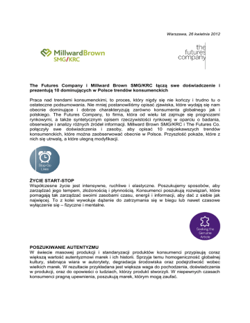 Warszawa, 26 kwietnia 2012 The Futures Company i Millward Brown SMG/KRC łączą swe doświadczenie i prezentują 10 dominujących w Polsce trendów konsumenckich Praca nad trendami konsumenckimi, to proces, który nigdy się nie kończy i trudno tu o ostateczne podsumowania. Nie mniej postanowiliśmy opisać zjawiska, które wydają się nam obecnie dominujące i dobrze charakteryzują zarówno konsumenta globalnego jak i polskiego. The Futures Company, to firma, która od wielu lat zajmuje się prognozami rynkowymi, a także syntetycznym opisem rzeczywistości rynkowej w oparciu o badania, obserwacje i analizy różnych źródeł informacji. Millward Brown SMG/KRC i The Futures Co. połączyły swe doświadczenia i zasoby, aby opisać 10 najciekawszych trendów konsumenckich, które można zaobserwować obecnie w Polsce. Przyszłość pokaże, które z nich się utrwalą, a które ulegną modyfikacji. ŻYCIE START-STOP Współczesne życie jest intensywne, ruchliwe i elastyczne. Poszukujemy sposobów, aby zarządzać jego tempem, złożonością i płynnością. Konsumenci poszukują rozwiązań, które pomagają tak zarządzać swoimi zasobami czasu, energii i informacji, aby dać z siebie jak najwięcej. To z kolei wywołuje dążenie do zatrzymania się w biegu lub nawet czasowe wyłączenie się – fizyczne i mentalne. POSZUKIWANIE AUTENTYZMU W świecie masowej produkcji i standaryzacji produktów konsumenci przypisują coraz większą wartość autentyzmowi marek i ich historii. Sprzyja temu homogeniczność globalnej kultury, słabnąca wiara w autorytety, degradacja środowiska oraz podejrzliwość wobec wielkich marek. W rezultacie przykładana jest większa waga do pochodzenia, doświadczenia w produkcji, oraz do opowieści o ludziach, którzy produkt stworzyli. W niepewnych czasach konsumenci pragną upewnienia, poszukują marek, którym mogą zaufać. ROZWAŻNI KONSUMENCI Jak nigdy przenikliwi i inteligentni konsumenci podejmują decyzje zakupowe z co raz większą rozwagą. Wartość nie sprowadza się do ceny. W coraz większym stopniu uwzględnia ocenę trwałości, jakości i niezawodności. Ograniczenia finansowe prowadzą do takich nowych wzorów konsumpcji i handlu, jak np. współfinansowanie lub współużytkowanie zakupów. ŻYCIE W ATMOSFERZE ZAGROŻENIA Konsumenci są coraz bardziej świadomi rozmaitych zagrożeń ze strony współczesnego świata. Chcą podejmować działania, które ograniczą niepewność i chronić osoby i rzeczy, które są dla nich cenne. Dzięki globalnej sieci lokalne zagrożenia zyskują globalną widoczność. Czujemy, że tradycyjne instytucje nie zapewniają już bezpieczeństwa i pewności. Zastanawiamy się komu możemy zaufać. TOŻSAMOŚĆ W TRÓJWYMIARZE Wzrastające napięcia związane z tożsamością płciową, pokoleniową i kulturową. Wzmocnienie kobiecości w wymiarze wpływu na społeczeństwo i rynek bywa źródłem konfliktu z żywiołem męskości. Starsze pokolenia, dzięki coraz lepszej opiece medycznej oraz posiadanym środkom finansowym, zmieniają sens starości. I przejmują część tożsamości, która wcześniej była przypisana młodszym generacjom. Jednocześnie wzrasta poczucie pewności, z jaką wyrażamy swoją tożsamość na rozmaite sposoby. MAŁA-WIELKA RÓŻNICA Pragnienie i poczucie odpowiedzialności, aby uczynić świat lepszym, oszczędzając energię i środowisko. Deficyt surowców i marnotrawstwo związane z nadmierną konsumpcją stwarzają wyzwania dla zdrowia naszego i naszej planety. Teraz te wysiłki zyskały dodatkowy praktyczny wymiar - oszczędność. Konsumenci chcą mieć na to wpływ – na miarę swoich możliwości. Im bardziej sami od siebie wymagają, tym więcej oczekują od korporacji. STEROWANIE DOBROSTANEM Wzrasta presja otoczenia, aby wziąć większą odpowiedzialność za kierowanie swoim dobrostanem i zdrowiem. System opieki zdrowotnej nie jest w stanie obsłużyć wszystkich potrzeb rosnącej i starzejącej się populacji, a państwo przerzuca ciężar odpowiedzialności na jednostki. Dbałość o zdrowie wykracza poza regularne wizyty u lekarza, przybierając holistyczny charakter, który obejmuje zarówno ciało, jak i ducha. Nauka i technologia podsuwają nowe możliwości na wyciągnięcie ręki. Ale w przypadku zdrowia posiadanie więcej wiedzy i więcej możliwości może też paraliżować. WSPÓLNOTY SIECIOWE Podczas gdy wiele tradycyjnych struktur i hierarchii społecznych ulega erozji, idea networkingu nadaje nowy sens życiu społeczności i jednostek. Poczucie łączności i uczestnictwa cechuje się tu wzajemnością. Zwłaszcza na rozwijających się rynkach panuje entuzjazm wynikający z możliwości jakie daje sieć i wspólnota sieciowa. Chociaż Wspólnoty Sieciowe są zasilane technologiami – zwłaszcza penetracją smartphone’ów i innych narzędzi sieciowych - to decyzja o tym, jak integrować życie w realu i życie w sieci należy do ludzi. POSZUKIWANIE DOZNAŃ Wzbogacanie codziennego życia przyjemnościami, które stanowią antidotum na presję współczesnego życia. Poszukiwanie doświadczeń, które pociągają za sobą ryzyko lub koszty, zyskuje w kryzysie mniej zwolenników. Wzbogacenie istniejących produktów i usług o nowe doznania zmysłowe stwarza okazję do wzbogacenia konsumenckiego doświadczenia. WALUTY OSOBISTE Obietnica wciąż rosnącego dobrobytu odeszła w przeszłość. Zmienia się sens pojęcia sukcesu i tego co w życiu istotne. Także rządy państw poszukują innych miar postępu niż jedynie wskaźniki ekonomiczne. Dobra materialne wciąż mają ogromną siłę przyciągania w rozwijającym się świecie. Status i sukces pozostają ważne, ale tylko wówczas gdy nie towarzyszy im utrata twarzy lub alienacja. Wyłania się nowy zestaw miar, wedle których ludzie oceniają siebie – i chcą być oceniani przez innych. Kontakt: [email protected] [email protected] MillwardBrown SMG/KRC Instytut Badania Rynku i Opinii 