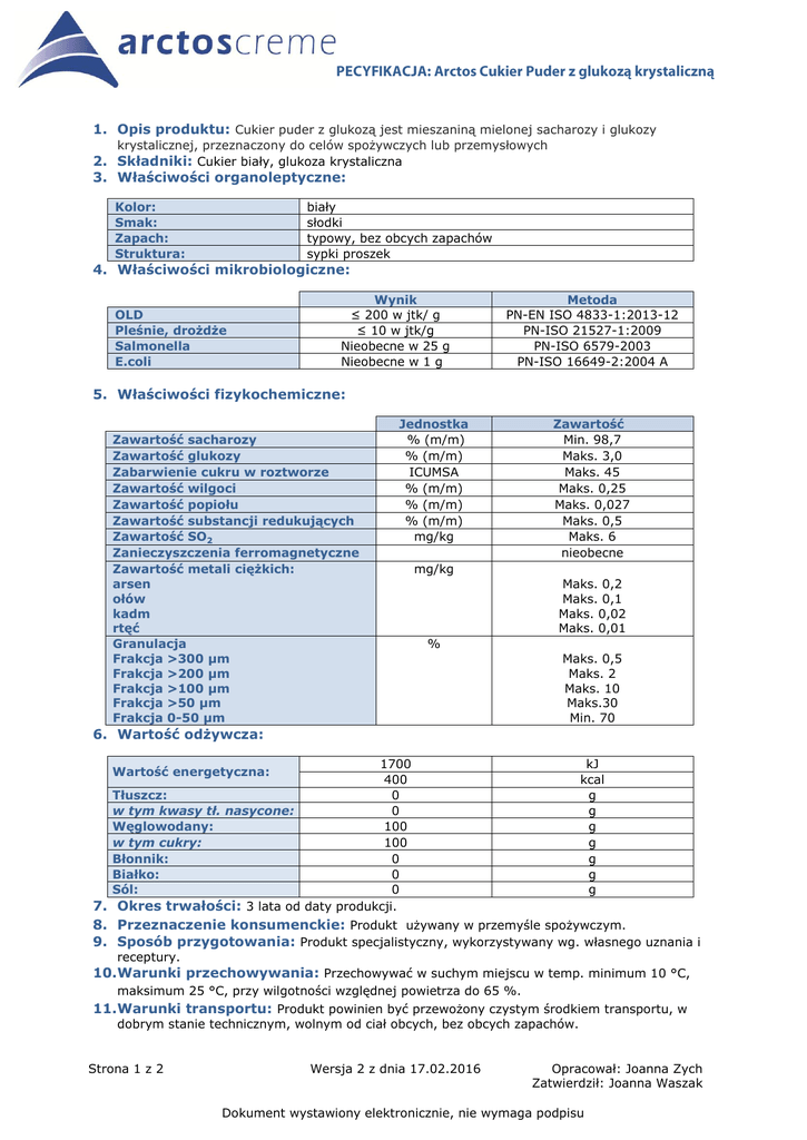 1. Opis produktu: Cukier puder z glukozą jest mieszaniną mielonej sacharozy i glukozy krystalicznej, przeznaczony do celów spożywczych lub przemysłowych 2. Składniki: Cukier biały, glukoza krystaliczna 3. Właściwości organoleptyczne: Kolor: Smak: Zapach: Struktura: biały słodki typowy, bez obcych zapachów sypki proszek 4. Właściwości mikrobiologiczne: OLD Pleśnie, drożdże Salmonella E.coli Wynik ≤ 200 w jtk/ g ≤ 10 w jtk/g Nieobecne w 25 g Nieobecne w 1 g Metoda PN-EN ISO 4833-1:2013-12 PN-ISO 21527-1:2009 PN-ISO 6579-2003 PN-ISO 16649-2:2004 A 5. Właściwości fizykochemiczne: Zawartość sacharozy Zawartość glukozy Zabarwienie cukru w roztworze Zawartość wilgoci Zawartość popiołu Zawartość substancji redukujących Zawartość SO2 Zanieczyszczenia ferromagnetyczne Zawartość metali ciężkich: arsen ołów kadm rtęć Granulacja Frakcja >300 µm Frakcja >200 µm Frakcja >100 µm Frakcja >50 µm Frakcja 0-50 µm Jednostka % (m/m) % (m/m) ICUMSA % (m/m) % (m/m) % (m/m) mg/kg Zawartość Min. 98,7 Maks. 3,0 Maks. 45 Maks. 0,25 Maks. 0,027 Maks. 0,5 Maks. 6 nieobecne mg/kg Maks. 0,2 Maks. 0,1 Maks. 0,02 Maks. 0,01 % Maks. 0,5 Maks. 2 Maks. 10 Maks.30 Min. 70 6. Wartość odżywcza: 1700 400 Tłuszcz: 0 w tym kwasy tł. nasycone: 0 Węglowodany: 100 w tym cukry: 100 Błonnik: 0 Białko: 0 Sól: 0 7. Okres trwałości: 3 lata od daty produkcji. kJ kcal g g g g g g g Wartość energetyczna: 8. Przeznaczenie konsumenckie: Produkt używany w przemyśle spożywczym. 9. Sposób przygotowania: Produkt specjalistyczny, wykorzystywany wg. własnego uznania i receptury. 10.Warunki przechowywania: Przechowywać w suchym miejscu w temp. minimum 10 °C, maksimum 25 °C, przy wilgotności względnej powietrza do 65 %. 11.Warunki transportu: Produkt powinien być przewożony czystym środkiem transportu, w dobrym stanie technicznym, wolnym od ciał obcych, bez obcych zapachów. Strona 1 z 2 Wersja 2 z dnia 17.02.2016 Opracował: Joanna Zych Zatwierdził: Joanna Waszak Dokument wystawiony elektronicznie, nie wymaga podpisu 12.Pakowanie: Produkt zapakowany w worki papierowe. Opakowanie jednostkowe: Opakowanie zbiorcze: 13.Alergeny: brak worek o masie netto 10 kg, 25 kg Paleta o masie netto 800, 1000 kg 14.GMO: Zgodnie z deklaracją producentów składniki użyte do produkcji cukru nie są modyfikowane genetycznie. Strona 2 z 2 Wersja 2 z dnia 17.02.2016 Opracował: Joanna Zych Zatwierdził: Joanna Waszak Dokument wystawiony elektronicznie, nie wymaga podpisu
