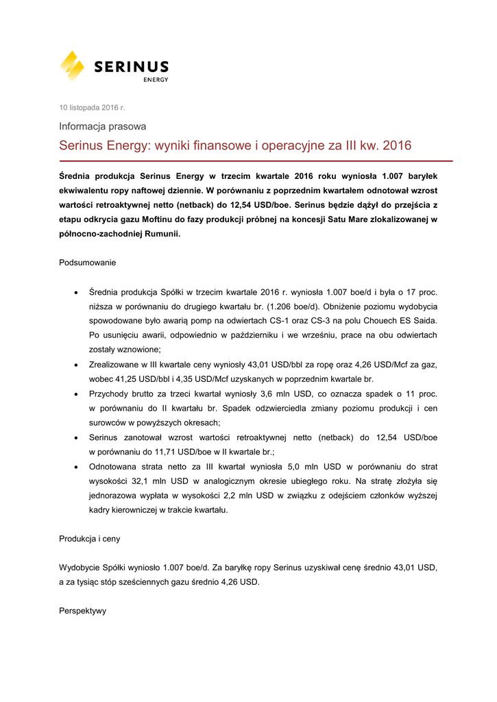 10 listopada 2016 r. Informacja prasowa Serinus Energy: wyniki finansowe i operacyjne za III kw. 2016 Średnia produkcja Serinus Energy w trzecim kwartale 2016 roku wyniosła 1.007 baryłek ekwiwalentu ropy naftowej dziennie. W porównaniu z poprzednim kwartałem odnotował wzrost wartości retroaktywnej netto (netback) do 12,54 USD/boe. Serinus będzie dążył do przejścia z etapu odkrycia gazu Moftinu do fazy produkcji próbnej na koncesji Satu Mare zlokalizowanej w północno-zachodniej Rumunii. Podsumowanie Średnia produkcja Spółki w trzecim kwartale 2016 r. wyniosła 1.007 boe/d i była o 17 proc. niższa w porównaniu do drugiego kwartału br. (1.206 boe/d). Obniżenie poziomu wydobycia spowodowane było awarią pomp na odwiertach CS-1 oraz CS-3 na polu Chouech ES Saida. Po usunięciu awarii, odpowiednio w październiku i we wrześniu, prace na obu odwiertach zostały wznowione; Zrealizowane w III kwartale ceny wyniosły 43,01 USD/bbl za ropę oraz 4,26 USD/Mcf za gaz, wobec 41,25 USD/bbl i 4,35 USD/Mcf uzyskanych w poprzednim kwartale br. Przychody brutto za trzeci kwartał wyniosły 3,6 mln USD, co oznacza spadek o 11 proc. w porównaniu do II kwartału br. Spadek odzwierciedla zmiany poziomu produkcji i cen surowców w powyższych okresach; Serinus zanotował wzrost wartości retroaktywnej netto (netback) do 12,54 USD/boe w porównaniu do 11,71 USD/boe w II kwartale br.; Odnotowana strata netto za III kwartał wyniosła 5,0 mln USD w porównaniu do strat wysokości 32,1 mln USD w analogicznym okresie ubiegłego roku. Na stratę złożyła się jednorazowa wypłata w wysokości 2,2 mln USD w związku z odejściem członków wyższej kadry kierowniczej w trakcie kwartału. Produkcja i ceny Wydobycie Spółki wyniosło 1.007 boe/d. Za baryłkę ropy Serinus uzyskiwał cenę średnio 43,01 USD, a za tysiąc stóp sześciennych gazu średnio 4,26 USD. Perspektywy Po wznowieniu wydobycia z odwiertów CS-1 i CS-3, od początku IV kwartału 2016 do chwili obecnej, średnia produkcja dzienna (przypadająca na udziały operacyjne Serinus) wynosi ok. 1.226 boe/d, w tym 919 baryłki ropy i 52,1 tysiąca m. sześc. gazu ziemnego dziennie. Tunezja Serinus zamierza nadal koncentrować się na ograniczaniu kosztów przy jednoczesnym utrzymywaniu obecnego poziomu wydobycia w Tunezji. Budżet będzie na bieżąco weryfikowany. Wznowienie prac wiertniczych uzależnione jest od uzyskania przez Zarząd przekonania, że obecne ceny ropy mogą się utrzymać oraz od tego czy dostępne będzie finansowania wznowienia prac. Rumunia Rumuńska Narodowa Agencja Zasobów Mineralnych ostatecznie zatwierdziła Aneks dotyczący zgody na przedłużenie o Etap 3 Koncesji Satu Mare znajdującej się w północno-zachodniej Rumunii. Serinus będzie dążył do przejścia z etapu odkrycia gazu Moftinu do fazy produkcji próbnej. W tym celu Spółka przeprowadziła określone badania inżynieryjne oraz wykonała wstępne prace projektowe adekwatne dla potrzebnej infrastruktury naziemnej i odwiertów produkcyjnych. Serinus poprzez swoją w pełni zależną spółkę Winstar Satu Mare S.A. posiada 60-proc. udział w Satu Mare. Właściciel pozostałych 40 proc., podjął decyzję o nie uczestniczeniu w dalszych pracach. Jednocześnie ponieważ jest obecnie zaangażowany w spór prawny z rumuńskimi władzami, kwestia przeniesienia jego udziałów na Serinus nie jest rozwiązana. Serinus podejmuje starania, aby zapewnić sobie ostateczne objęcie wspomnianego 40-proc. pakietu udziałów. W tym celu prowadzone są rozmowy z instytucjami finansowymi oraz Narodową Agencją Zasobów Mineralnych Spółka analizuje szereg możliwości finansowania dalszego zagospodarowania złóż w Rumunii i w Tunezji.