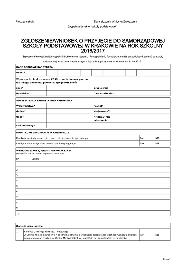 Pieczęć szkoły Data złożenia Wniosku/Zgłoszenia (wypełnia dyrektor szkoły podstawowej) ZGŁOSZENIE/WNIOSEK O PRZYJĘCIE DO SAMORZĄDOWEJ SZKOŁY PODSTAWOWEJ W KRAKOWIE NA ROK SZKOLNY 2016/2017 Zgłoszenie/wniosek należy wypełnić drukowanymi literami. Po wypełnieniu formularza, należy go podpisać i zanieść do szkoły podstawowej wskazanej na pierwszym miejscu listy priorytetów w terminie do 31.03.2016 r. DANE OSOBOWE KANDYDATA PESEL* W przypadku braku numeru PESEL - seria i numer paszportu lub innego dokumntu potwierdzającgo tożsamość Imię* Drugie Imię Nazwisko* Data urodzenia* ADRES MIEJSCA ZAMIESZKANIA KANDYDATA Województwo* Powiat* Gmina* Miejscowość* Ulica* Nr domu*/Nr mieszkania Kod pocztowy* DODATKOWE INFORMACJE O KANDYDACIE Kandydat posiada orzeczenie o potrzebie kształcenia specjalnego TAK NIE Kandydat chce uczęszczać do oddziału integracyjnego TAK NIE TAK NIE WYBRANE SZKOŁY/ GRUPY REKRUTACYJNE* (kolejność szkół jest istotna w procesie rekrutacji) LP Szkoła 1. 2. 3. 4. 5. 6. 7. 8. 9. 10. Kryteria rekrutacyjne 1 Kandydat, którego rodzice[2] mieszkają w Gminie Miejskiej Kraków i w rocznym zeznaniu o wysokości osiągniętego dochodu wskazują miejsce zamieszkania na terytorium Gminy Miejskiej Kraków, osobiście lub za pośrednictwem płatnika Strona 1 1. .................................... Kryteria rekrutacyjne 1 Kandydat ubiega się o przyjęcie do szkoły[1], której uczniem jest w bieżącym roku szkolnym oraz będzie w przyszłym roku szkolnym jego brat lub siostra TAK NIE 2 Szkoła na liście preferencji we wniosku rekrutacyjnym została wskazana na pierwszym miejscu TAK NIE 3 Szkoła znajduje się najbliżej miejsca pracy jednego z rodziców kandydata TAK NIE 4 Kandydat ubiega się o przyjęcie do szkoły[1], w której realizuje roczne przygotowanie przedszkolne TAK NIE 5 Szkoła ma siedzibę na terenie Dzielnicy Miasta Krakowa, w której mieszka kandydat TAK NIE 2. .................................... Kryteria rekrutacyjne 1 Kandydat ubiega się o przyjęcie do szkoły[1], której uczniem jest w bieżącym roku szkolnym oraz będzie w przyszłym roku szkolnym jego brat lub siostra TAK NIE 2 Szkoła znajduje się najbliżej miejsca pracy jednego z rodziców kandydata TAK NIE 3 Kandydat ubiega się o przyjęcie do szkoły[1], w której realizuje roczne przygotowanie przedszkolne TAK NIE 4 Szkoła ma siedzibę na terenie Dzielnicy Miasta Krakowa, w której mieszka kandydat TAK NIE 3. .................................... Kryteria rekrutacyjne 1 Kandydat ubiega się o przyjęcie do szkoły[1], której uczniem jest w bieżącym roku szkolnym oraz będzie w przyszłym roku szkolnym jego brat lub siostra TAK NIE 2 Szkoła znajduje się najbliżej miejsca pracy jednego z rodziców kandydata TAK NIE 3 Kandydat ubiega się o przyjęcie do szkoły[1], w której realizuje roczne przygotowanie przedszkolne TAK NIE 4 Szkoła ma siedzibę na terenie Dzielnicy Miasta Krakowa, w której mieszka kandydat TAK NIE 4. .................................... Kryteria rekrutacyjne 1 Kandydat ubiega się o przyjęcie do szkoły[1], której uczniem jest w bieżącym roku szkolnym oraz będzie w przyszłym roku szkolnym jego brat lub siostra TAK NIE 2 Szkoła znajduje się najbliżej miejsca pracy jednego z rodziców kandydata TAK NIE 3 Kandydat ubiega się o przyjęcie do szkoły[1], w której realizuje roczne przygotowanie przedszkolne TAK NIE 4 Szkoła ma siedzibę na terenie Dzielnicy Miasta Krakowa, w której mieszka kandydat TAK NIE 5. .................................... Kryteria rekrutacyjne 1 Kandydat ubiega się o przyjęcie do szkoły[1], której uczniem jest w bieżącym roku szkolnym oraz będzie w przyszłym roku szkolnym jego brat lub siostra TAK NIE 2 Szkoła znajduje się najbliżej miejsca pracy jednego z rodziców kandydata TAK NIE 3 Kandydat ubiega się o przyjęcie do szkoły[1], w której realizuje roczne przygotowanie przedszkolne TAK NIE 4 Szkoła ma siedzibę na terenie Dzielnicy Miasta Krakowa, w której mieszka kandydat TAK NIE 6. .................................... Kryteria rekrutacyjne 1 Kandydat ubiega się o przyjęcie do szkoły[1], której uczniem jest w bieżącym roku szkolnym oraz będzie w przyszłym roku szkolnym jego brat lub siostra TAK NIE 2 Szkoła znajduje się najbliżej miejsca pracy jednego z rodziców kandydata TAK NIE Strona 2 3 Kandydat ubiega się o przyjęcie do szkoły[1], w której realizuje roczne przygotowanie przedszkolne TAK NIE 4 Szkoła ma siedzibę na terenie Dzielnicy Miasta Krakowa, w której mieszka kandydat TAK NIE 7. .................................... Kryteria rekrutacyjne 1 Kandydat ubiega się o przyjęcie do szkoły[1], której uczniem jest w bieżącym roku szkolnym oraz będzie w przyszłym roku szkolnym jego brat lub siostra TAK NIE 2 Szkoła znajduje się najbliżej miejsca pracy jednego z rodziców kandydata TAK NIE 3 Kandydat ubiega się o przyjęcie do szkoły[1], w której realizuje roczne przygotowanie przedszkolne TAK NIE 4 Szkoła ma siedzibę na terenie Dzielnicy Miasta Krakowa, w której mieszka kandydat TAK NIE 8. .................................... Kryteria rekrutacyjne 1 Kandydat ubiega się o przyjęcie do szkoły[1], której uczniem jest w bieżącym roku szkolnym oraz będzie w przyszłym roku szkolnym jego brat lub siostra TAK NIE 2 Szkoła znajduje się najbliżej miejsca pracy jednego z rodziców kandydata TAK NIE 3 Kandydat ubiega się o przyjęcie do szkoły[1], w której realizuje roczne przygotowanie przedszkolne TAK NIE 4 Szkoła ma siedzibę na terenie Dzielnicy Miasta Krakowa, w której mieszka kandydat TAK NIE 9. .................................... Kryteria rekrutacyjne 1 Kandydat ubiega się o przyjęcie do szkoły[1], której uczniem jest w bieżącym roku szkolnym oraz będzie w przyszłym roku szkolnym jego brat lub siostra TAK NIE 2 Szkoła znajduje się najbliżej miejsca pracy jednego z rodziców kandydata TAK NIE 3 Kandydat ubiega się o przyjęcie do szko