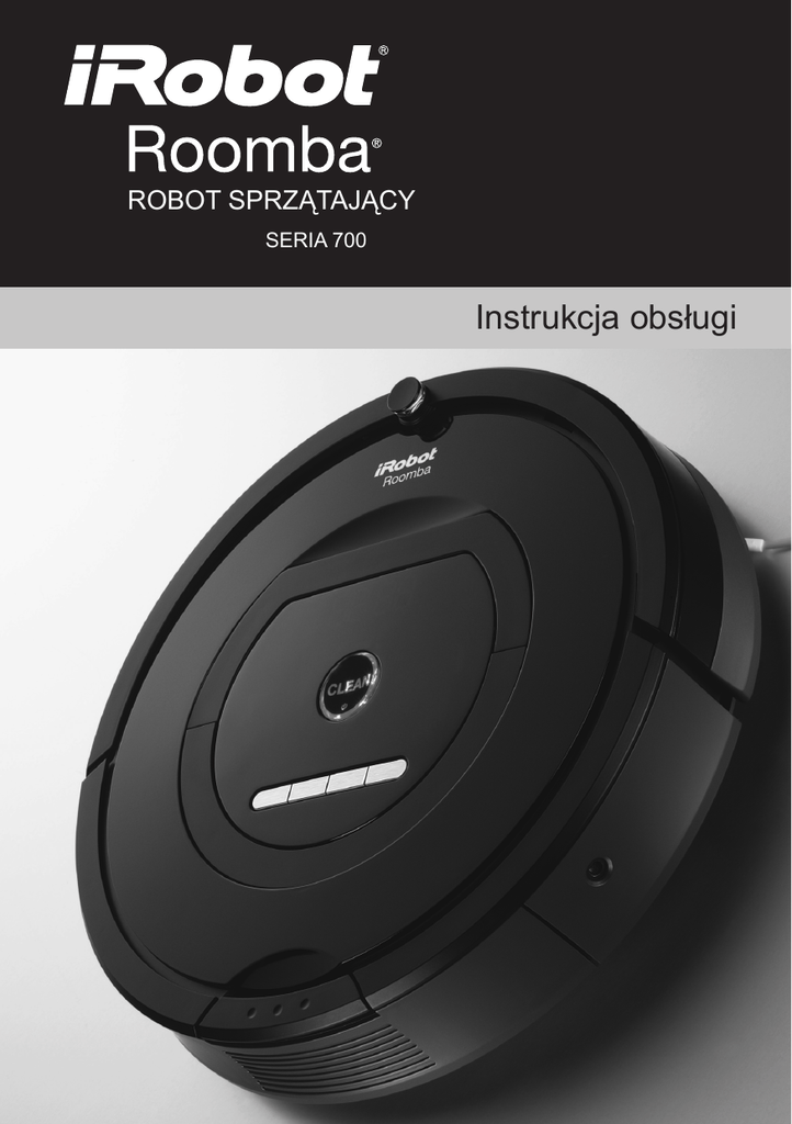 ROBOT SPRZĄTAJĄCY SERIA 700 Instrukcja obsługi SERIA 700 Edycja 201206 © DLF Sp. z o.o. Szanowni posiadacze iRobota Roomba Witajcie w świecie iRobot! Dziękujemy za wybór iRobota Roomba - robota odkurzającego najnowszej generacji. W ten sposób dołączyli Państwo do wyjątkowego, liczącego ponad 7 milionów i stale rozrastającego się grona osób, które odkrywają, jak pożyteczny, wygodny i prosty w obsłudze jest nasz robot odkurzający. Niektórzy do tego stopnia lubią swoje iRoboty Roomba, że wręcz nadają im imiona. My również kochamy swoje roboty. Nie powinno to nikogo dziwić zważywszy, iż produkcja robotów stanowi nasze jedyne zajęcie od ponad 20 lat. Teraz mogą Państwo korzystać z życia, ciesząc się wolnym czasem, który daje Państwu iRobot Roomba. Choć zapewne nie mogą się Państwo już doczekać, aby wypróbować iRobota Roomba, prosimy o zapoznanie się z niniejszą instrukcją obsługi przed uruchomieniem robota. Życzymy wielu przyjemnych doświadczeń w pracy z robotem Roomba i w imieniu zespołu dziękujemy za wybór produktu firmy iRobot. Serdecznie pozdrawiam Colin Angle Współtwórca Dyrektor Generalny iRobot Corporation Spis treści Ważne wskazówki przed pierwszym uruchomieniem ...................... 8 Budowa iRobota Roomba ....................................................... 9 Sposób sprzątania ..............................................................11 System sprzątania..............................................................12 Metody sprzątania .............................................................13 Ustawianie języka komunikatów głosowych ...............................13 Obsługa akumulatora ..........................................................14 Pojemniki AeroVac II ...........................................................16 Akcesoria dodatkowe ..........................................................17 Wirtualna ściana (Virtual Wall®) ...........................................17 Wirtualna latarnia (Virtual Wall® Lighthouses™) ........................19 Stacja dokująca (Home Base®) ............................................21 Pilot............................................................................22 Programowanie iRobota Roomba ............................................23 Czyszczenie i konserwacja ...................................................25 Wyjmowanie akumulatora ....................................................29 Często zadawane pytania (FAQ) .............................................30 Wykrywanie i usuwanie usterek .............................................31 Ważne instrukcje bezpieczeństwa ..........................................33 Ograniczenia pracy iRobota Roomba ........................................34 Deklaracja zgodności z normami Unii Europejskiej.......................35 7 Ważne wskazówki przed pierwszym uruchomieniem Zanim użyjesz iRobota Roomba musisz najpierw go uaktywnić. W tym celu odwróć robota i wyjmij zabezpieczenia: wkładkę zabezpieczającą pojemnika na brud i akumulatora. Jeśli napotkasz trudność z wyjęciem zabezpieczenia akumulatora poluźnij śruby pokrywy akumulatora. Pociągnij za taśmę zabezpieczającą. Po wyciągnięciu zabezpieczenia, śruby należy dokręcić. Usuń zabezpieczenie akumulatora Usuń zabezpieczenie pojemnika na brud Pierwsze uruchomienie iRobota Roomba Przy pierwszym użyciu bez względu na początkowy poziom naładowania akumulatora należy go rozładować poprzez uruchomienie robota w cyklu sprzątania, aż do uzyskania czerwonego podświetlenia kontrolki akumulatora i samoistnego zatrzymania się, o którym Roomba poinformuje emitując odpowiedni dźwięk. Następnie należy rozpocząć ładowanie robota podłączonego bezpośrednio do zasilacza (z pominięciem stacji dokującej) przez całą noc (minimum 12 godzin). Żywotność akumulatora Aby przedłużyć żywotność akumulatora, iRobot zaleca ciągłe utrzymywanie robota podłączonego do zasilania (ładowarki lub stacji dokującej) w czasie gdy nie sprząta. Spowoduje to, że iRobot Roomba będzie zawsze gotów do pracy i nie dojdzie do uszkodzenia akumulatora przez jego głębokie rozładowanie. Włączanie i wyłączanie iRobota Roomba • Roomba nie posiada typowego przycisku „ON-OFF” lub „POWER”. • Aby uruchomić robota, naciśnij przycisk CLEAN. Usłyszysz dźwięk informujący o gotowości do pracy, a przycisk CLEAN będzie podświetlony. • Aby rozpocząć cykl sprzątający, naciśnij przycisk CLEAN jeszcze raz. Robot zacznie sprzątać. • Aby przerwać pracę robota, naciśnij przycisk CLEAN. • Aby wznowić pracę robota, naciśnij ponownie przycisk CLEAN. • Aby całkowicie wyłączyć robota, naciśnij przycisk CLEAN i przytrzymaj do czasu aż kontrolki zgasną. Dla lepszej wydajności • Robot sprzątający Roomba jest bardzo skuteczny w zbieraniu włosów. Sprawdzaj stopień zabrudzenia szczotek i czyść je po każdym sprzątaniu. • Opróżniaj pojemnik na brud oraz czyść filtr po każdym sprzątaniu. • Zastosuj wirtualne ściany, aby utrzymać iRobota Roomba w miejscach, w których chcesz, aby sprzątał. • iRobot Roomba osiąga najwyższą wydajność, gdy jest często używany. iRobot Roomba zawiera części elektroniczne. Czyść go wyłącznie suchą tkaniną. Nie polewaj robota wodą ani nie używaj płynów lub rozpylaczy do jego czyszczenia. Chroń iRobota Roomba przed zalaniem. 8 iRobot Roomba Seria 700 Budowa iRobota Roomba Czujnik wirtualnej ściany i stacji dokującej Widok z góry Złącze serwisowe ukryte pod uchwytem, powinno być używane tylko przez wykwalifikowanego serwisanta Pokrywa górna Uchwyt Przycisk zwalniania pojemnika na brud Pojemnik na brud Gniazdo ładowarki akumulatora Przyciski i kontrolki Główny przycisk włączania sprzątania Przycisk funkcji dokowania (DOCK) Przycisk funkcji sprzątania miejscowego (SPOT) Zegar (CLOCK) Ikona Wskaźnik naładowania akumu