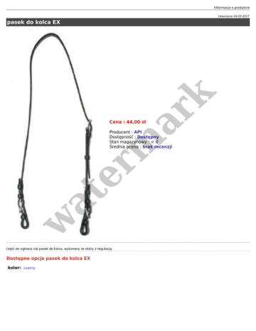 Informacje o produkcie Utworzono 04-03-2017 er m ar k pasek do kolca EX Cena : 44,00 zł w at Producent : API Dostępność : Dostępny Stan magazynowy : < 0 Średnia ocena : brak recenzji część do ogłowia lub pasek do kolca, wykonany ze skóry z regulacją . Dostępne opcje pasek do kolca EX kolor: czarny.
