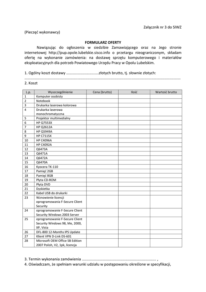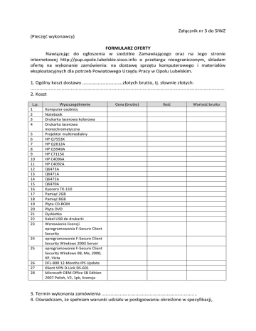 Załącznik nr 3 do SIWZ (Pieczęć wykonawcy) FORMULARZ OFERTY Nawiązując do ogłoszenia w siedzibie Zamawiającego oraz na Jego stronie internetowej http://pup.opole.lubelskie.sisco.info o przetargu nieograniczonym, składam ofertę na wykonanie zamówienia: na dostawę sprzętu komputerowego i materiałów eksploatacyjnych dla potrzeb Powiatowego Urzędu Pracy w Opolu Lubelskim. 1. Ogólny koszt dostawy ...............................złotych brutto, tj. słownie złotych: ..................................................................................................................................................... 2. Koszt L.p. 1 2 3 4 5 6 7 8 9 10 11 12 13 14 15 16 17 18 19 20 21 22 23 24 25 26 27 28 Wyszczególnienie Komputer osobisty Notebook Drukarka laserowa kolorowa Drukarka laserowa monochromatyczna Projektor multimedialny HP Q7553X HP Q2612A HP Q5949A HP C7115X HP C4096A HP C4092A Q6473A Q6471A Q6472A Q6470A Kyocera TK-110 Pamięć 2GB Pamięć 8GB Płyta CD-ROM Płyta DVD Dyskietka Kabel USB do drukarki Wznowienie licencji oprogramowania F-Secure Client Security oprogramowanie F-Secure Client Security Windows 2003 Server oprogramowanie F-Secure Client Security Windows 98, Me, 2000, XP, Vista DFL-800 12-Months IPS Update Klient VPN D-Link DS-601 Microsoft OEM Office SB Edition 2007 Polish, V2, 1pk, licencja Cena (brutto) Ilość Wartość brutto 3. Termin wykonania zamówienia ....................................................................... , 4. Oświadczam, że spełniam warunki udziału w postępowaniu określone w specyfikacji, 5. Oświadczam, że akceptuję warunki specyfikacji i nie wnoszę do nich uwag, 6. Oświadczam, że uważam się za związanego niniejszą ofertą na czas wskazany w specyfikacji, 7. Oświadczamy, że wzór umowy stanowiący załącznik Nr 4 do SIWZ został przez nas zaakceptowany i zobowiązujemy się w przypadku wyboru naszej oferty do zawarcia umowy w miejscu i terminie wskazanym przez Zamawiającego. 8. Załącznikami do niniejszej oferty stanowiącymi jej integralną część są zgodnie z SIWZ następujące dokumenty i oświadczenia: 1. ……………………………………………………………………………………… 2. ……………………………………………………………………………………… 3. ……………………………………………………………………………………… 4. ……………………………………………………………………………………… ............................. ,dnia ................................ ............................................................................................. (podpis i pieczęć upoważnionego /ych przedstawicieli Wykonawcy)