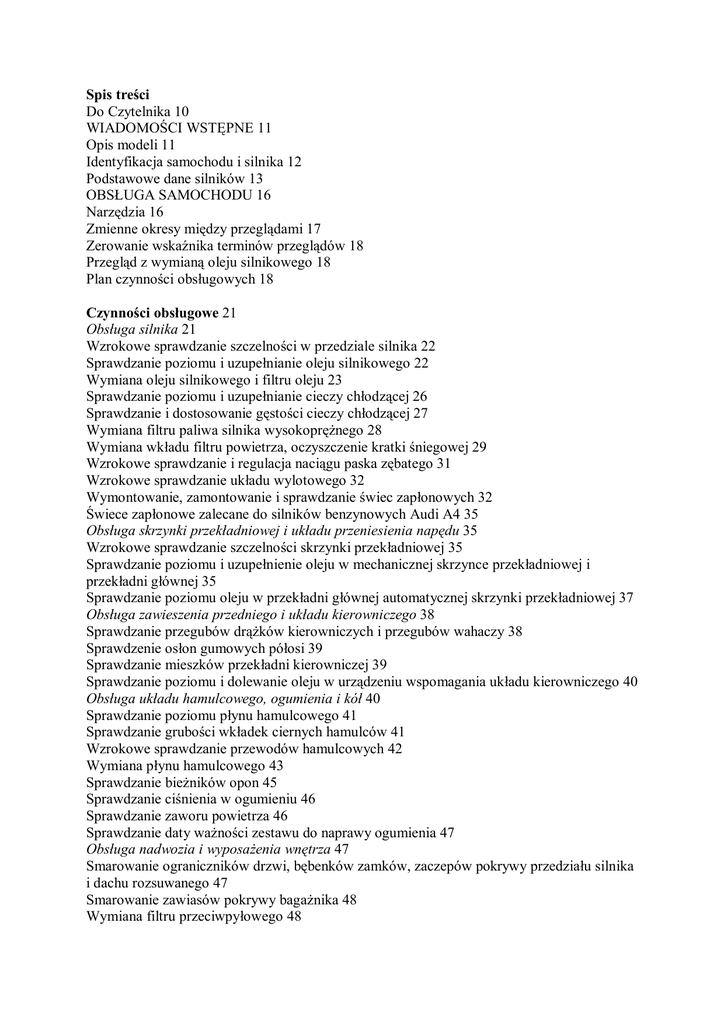 Spis treści Do Czytelnika 10 WIADOMOŚCI WSTĘPNE 11 Opis modeli 11 Identyfikacja samochodu i silnika 12 Podstawowe dane silników 13 OBSŁUGA SAMOCHODU 16 Narzędzia 16 Zmienne okresy między przeglądami 17 Zerowanie wskaźnika terminów przeglądów 18 Przegląd z wymianą oleju silnikowego 18 Plan czynności obsługowych 18 Czynności obsługowe 21 Obsługa silnika 21 Wzrokowe sprawdzanie szczelności w przedziale silnika 22 Sprawdzanie poziomu i uzupełnianie oleju silnikowego 22 Wymiana oleju silnikowego i filtru oleju 23 Sprawdzanie poziomu i uzupełnianie cieczy chłodzącej 26 Sprawdzanie i dostosowanie gęstości cieczy chłodzącej 27 Wymiana filtru paliwa silnika wysokoprężnego 28 Wymiana wkładu filtru powietrza, oczyszczenie kratki śniegowej 29 Wzrokowe sprawdzanie i regulacja naciągu paska zębatego 31 Wzrokowe sprawdzanie układu wylotowego 32 Wymontowanie, zamontowanie i sprawdzanie świec zapłonowych 32 Świece zapłonowe zalecane do silników benzynowych Audi A4 35 Obsługa skrzynki przekładniowej i układu przeniesienia napędu 35 Wzrokowe sprawdzanie szczelności skrzynki przekładniowej 35 Sprawdzanie poziomu i uzupełnienie oleju w mechanicznej skrzynce przekładniowej i przekładni głównej 35 Sprawdzanie poziomu oleju w przekładni głównej automatycznej skrzynki przekładniowej 37 Obsługa zawieszenia przedniego i układu kierowniczego 38 Sprawdzanie przegubów drążków kierowniczych i przegubów wahaczy 38 Sprawdzenie osłon gumowych półosi 39 Sprawdzanie mieszków przekładni kierowniczej 39 Sprawdzanie poziomu i dolewanie oleju w urządzeniu wspomagania układu kierowniczego 40 Obsługa układu hamulcowego, ogumienia i kół 40 Sprawdzanie poziomu płynu hamulcowego 41 Sprawdzanie grubości wkładek ciernych hamulców 41 Wzrokowe sprawdzanie przewodów hamulcowych 42 Wymiana płynu hamulcowego 43 Sprawdzanie bieżników opon 45 Sprawdzanie ciśnienia w ogumieniu 46 Sprawdzanie zaworu powietrza 46 Sprawdzanie daty ważności zestawu do naprawy ogumienia 47 Obsługa nadwozia i wyposażenia wnętrza 47 Smarowanie ograniczników drzwi, bębenków zamków, zaczepów pokrywy przedziału silnika i dachu rozsuwanego 47 Smarowanie zawiasów pokrywy bagażnika 48 Wymiana filtru przeciwpyłowego 48 Obsługa wyposażenia elektrycznego 49 Sprawdzanie odbiorników energii elektrycznej 50 Sprawdzanie akumulatora 50 Regulacja ramion wycieraków szyby 52 Wymiana awaryjnych baterii zasilających w urządzeniu teleinformatycznym 53 ZABIEGI KONSERWACYJNE I POMOCNICZE 55 Mycie samochodu 55 Pielęgnacja samochodu 55 Ochrona antykorozyjna spodu nadwozia i przestrzeni zamkniętych 57 Pielęgnacja i czyszczenie obić tapicerskich 57 Uruchamianie silnika z zastosowaniem akumulatora pomocniczego 57 Unoszenie i podpieranie samochodu 59 WYPOSAŻENIE ELEKTRYCZNE 61 Wiadomości wstępne 61 Dodatkowe wyposażenie elektryczne 62 Poszukiwanie usterek w instalacji elektrycznej 62 Sprawdzanie działania wyłączników 63 Sprawdzanie przekaźników 64 Rozłączanie złącza wtykowego 65 Sprawdzanie ogrzewania szyby tylnej 65 Sprawdzanie świateł hamowania 66 Wymontowanie i zamontowanie sygnału dźwiękowego 66 Wymontowanie i zamontowanie czujników parkowania 67 Wymiana baterii zdalnego sterowania w kluczu wyłącznika zapłonu 68 Wymontowanie i zamontowanie przekaźnika 68 Wymiana bezpieczników 68 Akumulator 69 Wymontowanie i zamontowanie akumulatora 69 Czyszczenie zacisków akumulatora 71 Sprawdzanie akumulatora 72 Ładowanie akumulatora 73 Samorozładowywanie akumulatora 75 Przechowywanie akumulatora 76 Typowe niesprawności akumulatora 76 Alternator 77 Sprawdzanie napięcia alternatora 77 Wymontowanie i zamontowanie alternatora 77 Wymontowanie i zamontowanie regulatora napięcia, wymiana szczotek węglowych 80 Typowe niesprawności alternatora 81 Rozrusznik 81 Wymontowanie i zamontowanie rozrusznika 81 Sprawdzanie elektromagnetycznego wyłącznika rozrusznika 83 Typowe niesprawności rozrusznika 83 Wycieraczki 84 Wymontowanie i zamontowanie gumowego pióra wycieraka 84 Wymontowanie i zamontowanie dysz spryskiwacza szyby przedniej 86 Wymontowanie i zamontowanie dyszy spryskiwacza szyby tylnej 87 Wymontowanie i zamontowanie zbiornika oraz silnika pompki spryskiwaczy szyb 87 Wymontowanie i zamontowanie ramienia wycieraka szyby przedniej 89 Wymontowanie i zamontowanie silnika wycieraczki szyby przedniej 89 Wymontowanie i zamontowanie ramienia wycieraka szyby tylnej 90 Wymontowanie i zamontowanie silnika wycieraczki szyby tylnej 91 Wymontowanie i zamontowanie dyszy spryskiwacza reflektora 91 Typowe niesprawności gumowych piór wybieraków 92 Oświetlenie i sygnalizacja do X 2004 92 Wykaz żarówek 92 Wymiana żarówek reflektora 93 Wymontowanie i zamontowanie reflektora 95 Wymontowanie i zamontowanie reflektora przeciwmgłowego 97 Wymontowanie i zamontowanie lampy kierunkowskazu bocznego 97 Wymontowanie i zamontowanie dodatkowego światła hamowania 98 Wymontowanie i zamontowanie lampy tylnej w samochodzie sedan 99 Wymontowanie i zamontowanie lampy tylnej w samochodzie Avant 100 Wymontowanie i zamontowanie lampy oświetlenia tablicy rejestracyjnej 101 Wymontowanie i zamontowanie lamp oświetlenia wewnętrznego 101 Oświetlenie i sygnalizacja od XI 2004 105 Wymiana żarówek reflektora 105 Wymontowanie i zamontowanie reflektora 109 Wymontowanie i zamontowanie reflektora przeciwmgłowego 110 Wymontowanie i zamontowanie lampy tylnej wewnętrznej 110 Wymontowanie i zamontowanie dodatkowego światła hamowania 111 Wskaźniki, wyłączniki i osprzęt dodatkowy 112 Wymontowanie i zamontowanie zespołu wskaźników 112 Wymontowanie i zamontowanie wyłączników pod kołem kierownicy 113 Wymontowanie i zamontowanie wyłączników w drzwiach przednich 114 Wymontowanie i zamontowanie wyłącznika świateł 116 Wymontowanie i zamontowanie wyłącznika podnoszenia szyby w drzwiach tylnych 116 Wymontowanie i zamontowanie wyłącznika stykowego w zamku bagażnika 117 Wymontowanie i zamontowanie