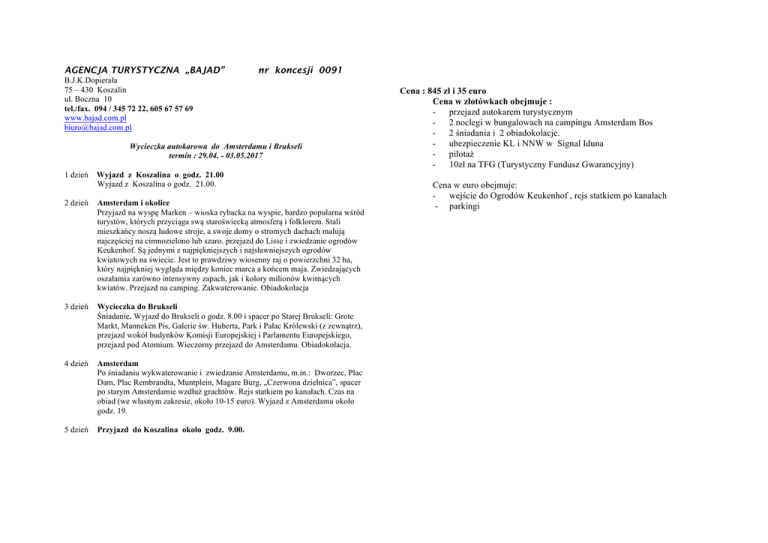 AGENCJA TURYSTYCZNA „BAJAD” nr koncesji 0091 B.J.K.Dopierała 75 – 430 Koszalin ul. Boczna 10 tel./fax. 094 / 345 72 22, 605 67 57 69 www.bajad.com.pl [email protected] Wycieczka autokarowa do Amsterdamu i Brukseli termin : 29.04. - 03.05.2017 1 dzień Wyjazd z Koszalina o godz. 21.00 Wyjazd z Koszalina o godz. 21.00. 2 dzień Amsterdam i okolice Przyjazd na wyspę Marken – wioska rybacka na wyspie, bardzo popularna wśród turystów, których przyciąga swą staroświecką atmosferą i folklorem. Stali mieszkańcy noszą ludowe stroje, a swoje domy o stromych dachach malują najczęściej na cimnozielono lub szaro. przejazd do Lisse i zwiedzanie ogrodów Keukenhof. Są jednymi z najpiękniejszych i najsławniejszych ogrodów kwiatowych na świecie. Jest to prawdziwy wiosenny raj o powierzchni 32 ha, który najpiękniej wygląda między koniec marca a końcem maja. Zwiedzających oszałamia zarówno intensywny zapach, jak i kolory milionów kwitnących kwiatów. Przejazd na camping. Zakwaterowanie. Obiadokolacja 3 dzień Wycieczka do Brukseli Śniadanie. Wyjazd do Brukseli o godz. 8.00 i spacer po Starej Brukseli: Grote Markt, Manneken Pis, Galerie św. Huberta, Park i Pałac Królewski (z zewnątrz), przejazd wokół budynków Komisji Europejskiej i Parlamentu Europejskiego, przejazd pod Atomium. Wieczorny przejazd do Amsterdamu. Obiadokolacja. 4 dzień Amsterdam Po śniadaniu wykwaterowanie i zwiedzanie Amsterdamu, m.in.: Dworzec, Plac Dam, Plac Rembrandta, Muntplein, Magare Burg, „Czerwona dzielnica”, spacer po starym Amsterdamie wzdłuż grachtów. Rejs statkiem po kanałach. Czas na obiad (we własnym zakresie, około 10-15 euro). Wyjazd z Amsterdamu około godz. 19. 5 dzień Przyjazd do Koszalina około godz. 9.00. Cena : 845 zł i 35 euro Cena w złotówkach obejmuje : - przejazd autokarem turystycznym - 2 noclegi w bungalowach na campingu Amsterdam Bos - 2 śniadania i 2 obiadokolacje. - ubezpieczenie KL i NNW w Signal Iduna - pilotaż 10zł na TFG (Turystyczny Fundusz Gwarancyjny) Cena w euro obejmuje: wejście do Ogrodów Keukenhof , rejs statkiem po kanałach - parkingi