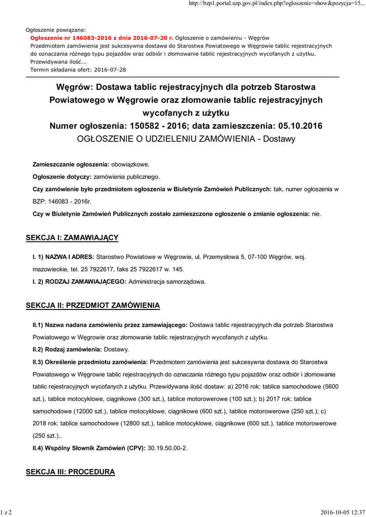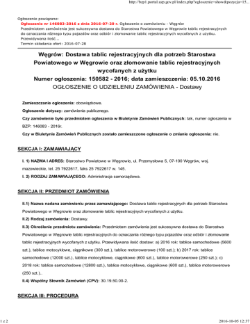 1z2 http://bzp1.portal.uzp.gov.pl/index.php?ogloszenie=show&pozycja=15... Ogłoszenie powiązane: Ogłoszenie nr 146083-2016 z dnia 2016-07-20 r. Ogłoszenie o zamówieniu - Węgrów Przedmiotem zamówienia jest sukcesywna dostawa do Starostwa Powiatowego w Węgrowie tablic rejestracyjnych do oznaczania różnego typu pojazdów oraz odbiór i złomowanie tablic rejestracyjnych wycofanych z użytku. Przewidywana ilość... Termin składania ofert: 2016-07-28 Węgrów: Dostawa tablic rejestracyjnych dla potrzeb Starostwa Powiatowego w Węgrowie oraz złomowanie tablic rejestracyjnych wycofanych z użytku Numer ogłoszenia: 150582 - 2016; data zamieszczenia: 05.10.2016 OGŁOSZENIE O UDZIELENIU ZAMÓWIENIA - Dostawy Zamieszczanie ogłoszenia: obowiązkowe. Ogłoszenie dotyczy: zamówienia publicznego. Czy zamówienie było przedmiotem ogłoszenia w Biuletynie Zamówień Publicznych: tak, numer ogłoszenia w BZP: 146083 - 2016r. Czy w Biuletynie Zamówień Publicznych zostało zamieszczone ogłoszenie o zmianie ogłoszenia: nie. SEKCJA I: ZAMAWIAJĄCY I. 1) NAZWA I ADRES: Starostwo Powiatowe w Węgrowie, ul. Przemysłowa 5, 07-100 Węgrów, woj. mazowieckie, tel. 25 7922617, faks 25 7922617 w. 145. I. 2) RODZAJ ZAMAWIAJĄCEGO: Administracja samorządowa. SEKCJA II: PRZEDMIOT ZAMÓWIENIA II.1) Nazwa nadana zamówieniu przez zamawiającego: Dostawa tablic rejestracyjnych dla potrzeb Starostwa Powiatowego w Węgrowie oraz złomowanie tablic rejestracyjnych wycofanych z użytku. II.2) Rodzaj zamówienia: Dostawy. II.3) Określenie przedmiotu zamówienia: Przedmiotem zamówienia jest sukcesywna dostawa do Starostwa Powiatowego w Węgrowie tablic rejestracyjnych do oznaczania różnego typu pojazdów oraz odbiór i złomowanie tablic rejestracyjnych wycofanych z użytku. Przewidywana ilość dostaw: a) 2016 rok: tablice samochodowe (5600 szt.), tablice motocyklowe, ciągnikowe (300 szt.), tablice motorowerowe (100 szt.); b) 2017 rok: tablice samochodowe (12000 szt.), tablice motocyklowe, ciągnikowe (600 szt.), tablice motorowerowe (250 szt.); c) 2018 rok: tablice samochodowe (12800 szt.), tablice motocyklowe, ciągnikowe (600 szt.), tablice motorowerowe (250 szt.).. II.4) Wspólny Słownik Zamówień (CPV): 30.19.50.00-2. SEKCJA III: PROCEDURA 2016-10-05 12:37 2z2 http://bzp1.portal.uzp.gov.pl/index.php?ogloszenie=show&pozycja=15... III.1) TRYB UDZIELENIA ZAMÓWIENIA: Przetarg nieograniczony III.2) INFORMACJE ADMINISTRACYJNE Zamówienie dotyczy projektu/programu finansowanego ze środków Unii Europejskiej: nie SEKCJA IV: UDZIELENIE ZAMÓWIENIA IV.1) DATA UDZIELENIA ZAMÓWIENIA: 11.08.2016. IV.2) LICZBA OTRZYMANYCH OFERT: 1. IV.3) LICZBA ODRZUCONYCH OFERT: . IV.4) NAZWA I ADRES WYKONAWCY, KTÓREMU UDZIELONO ZAMÓWIENIA: P.P.U.H. NAT-POL Spółka Jawna Sławomir Jaszczuk i Wspólnicy, ul. Władysława Reymonta 11c, 05-120 Legionowo, kraj/woj. mazowieckie. IV.5) Szacunkowa wartość zamówienia (bez VAT): 325000,00 PLN. IV.6) INFORMACJA O CENIE WYBRANEJ OFERTY ORAZ O OFERTACH Z NAJNIŻSZĄ I NAJWYŻSZĄ CENĄ Cena wybranej oferty: 399750,00 Oferta z najniższą ceną: 399750,00 / Oferta z najwyższą ceną: 399750,00 Waluta: PLN . 2016-10-05 12:37