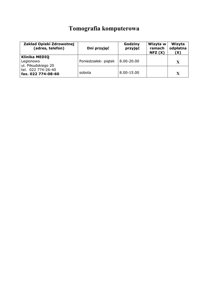 Tomografia komputerowa Zakład Opieki Zdrowotnej (adres, telefon) Klinika MEDIQ Legionowo ul. Piłsudskiego 20 tel. 022 774-26-40 fax. 022 774-08-60 Dni przyjęć Godziny przyjęć Wizyta w Wizyta ramach odpłatna NFZ (X) (X) Poniedziałek- piątek 8.00-20.00 X sobota 8.00-15.00 X