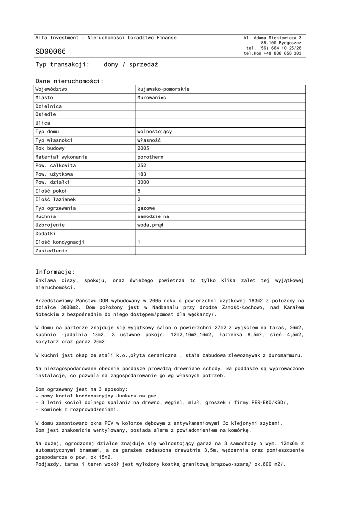Alfa Investment - Nieruchomości Doradztwo Finanse Al. Adama Mickiewicza 3 88-100 Bydgoszcz tel. (56) 664 10 25/26 tel.kom +48 888 658 303 SD00066 Typ transakcji: domy / sprzedaż Dane nieruchomości: Województwo kujawsko-pomorskie Miasto Murowaniec Dzielnica Osiedle Ulica Typ domu wolnostojący Typ własności własność Rok budowy 2005 Materiał wykonania porotherm Pow. całkowita 252 Pow. użytkowa 183 Pow. działki 3000 Ilość pokoi 5 Ilość łazienek 2 Typ ogrzewania gazowe Kuchnia samodzielna Uzbrojenie woda,prąd Dodatki Ilość kondygnacji 1 Zasiedlenie Informacje: Enklawa ciszy, nieruchomości. spokoju, oraz świeżego powietrza to tylko klika zalet tej wyjątkowej Przedstawiamy Państwu DOM wybudowany w 2005 roku o powierzchni użytkowej 183m2 z położony na działce 3000m2. Dom położony jest w Nadkanalu przy drodze Zamość-Łochowo, nad Kanałem Noteckim z bezpośrednim do niego dostępem/pomost dla wędkarzy/. W domu na parterze znajduje się wyjątkowy salon o powierzchni 27m2 z wyjściem na taras, 26m2, kuchnio -jadalnia 18m2, 3 ustawne pokoje: 12m2,16m2,16m2, łazienka 8,5m2, sień 4,5m2, korytarz oraz garaż 26m2. W kuchni jest okap ze stali k.o.,płyta ceramiczna , stała zabudowa,zlewozmywak z duromarmuru. Na niezagospodarowane obecnie poddasze prowadzą drewniane schody. Na poddasze są wyprowadzone instalacje, co pozwala na zagospodarowanie go wg własnych potrzeb. Dom ogrzewany jest na 3 sposoby: - nowy kocioł kondensacyjny Junkers na gaz, - 3 letni kocioł dolnego spalania na drewno, węgiel, miał, groszek / firmy PER-EKO/KSD/, - kominek z rozprowadzeniami. W domu zamontowano okna PCV w kolorze dębowym z antywłamaniowymi 3x klejonymi szybami. Dom jest znakomicie wentylowany, posiada alarm z powiadomieniem na komórkę. Na dużej, ogrodzonej działce znajduje się wolnostojący garaż na 3 samochody o wym. 12mx6m z automatycznymi bramami, a za garażem zadaszona drewutnia 3,5m, wędzarnia oraz pomieszczenie gospodarcze o pow. ok 15m2. Podjazdy, taras i teren wokół jest wyłożony kostką granitową brązowo-szarą/ ok.600 m2/. Wjazd na posesję przez bramę na pilota. Na terenie znajduje się również przydomowa oczyszczalnia ścieków. Serdecznie zapraszam na prezentację, z przyjemnością odpowiem Państwu na wszelkie pytania oraz udzielę dodatkowych informacji. Pośrednik odpowiedzialny zawodowo: Paweł Dawidowicz licencja pośrednika w obrocie nieruchomościami 7432 Andrzej Pamin licencja pośrednika w obrocie nieruchomościami 1145 UWAGA!!! BEZPŁATNIE POMAGAMY W UZYSKANIU KREDYTU NA ZAKUP NIERUCHOMOŚCI. WSPÓŁPRACUJEMY Z WIELOMA BANKAMI. Z NAMI MOŻESZ UZYSKAĆ KREDYT NA 100% WARTOŚCI NIERUCHOMOŚCI. Treść niniejszego ogłoszenia nie stanowi oferty handlowej w rozumieniu przepisów Kodeksu Cywilnego. Cena: 790 000 PLN Dokument wygenerowany ze strony www.alfa-investment.pl Strona 2