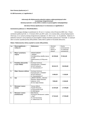 Dom Pomocy Społecznej nr 2 41-200 Sosnowiec, ul. Jagiellońska 2 Informacja dla Wykonawców odnośnie wyboru najkorzystniejszych ofert w przetargu nieograniczonym dostawę żywności w roku 2016 w rozbiciu na poszczególne rodzaje(pakiety) dla Domu Pomocy Społecznej nr 2 w Sosnowcu ul. Jagiellońska 2 Zamówienie publiczne nr DPS/ZP/02/2015 r. Zamawiający działając na podstawie inż. 92 ust.1 i 2 ustawy z dnia 29 stycznia 2004 roku – Prawo zamówień publicznych (Dz. U. z 9 sierpnia 2013 poz.907 z późn. zm.) zwanej dalej „ustawą Pzp)uprzejmie informuje, iż na w/wym przetarg nieograniczony wpłynęło 13 ofert w tym na 21 pakietów. Wybrano 9 pakietów ważnych z ceną najniższą na poszczególne rodzaje artykułów spożywczych. Pozostałe 11 ważnych ofert w ocenie uzyskało poniżej 100 punktów. Jedna oferta (pakiet nr 9) została odrzucona. Wykaz Wykonawców, którzy uzyskali w ocenie 100 punktów. L.p. Wyszczególnienie – rodzaj art. Wykonawca 1. Mięso i przetwory mięsne ZAKŁAD MIĘSNY „HEMAX” H.M.Blachlińscy Spółka Jawna 42-584 Dobieszowice,ul.27Stycznia 76 Hurtowe Centrum Dystrybucyjne „STAWIKI” 40-337 Katowice Ul. Sosnowiecka 17 2. 3. 4. 5. 6. Produkty mleczarskie w tym: Mleko Oleje i tłuszcze roślinne Jaja Warzywa i owoce świeże Warzywa i owoce przetworzone Hurtowe Centrum Dystrybucyjne „STAWIKI” 40-337 Katowice Ul. Sosnowiecka 17 „INVEST-MICHEL „ Mariola Michelis, Marek Michelis Kobierne 44 A 05-311 Dębe Wielkie Tomasz Włoch Handel Obwoźny ul.Chorzowska 3a/9 41-902 Bytom Bała Marian Hurtownia Mrożonek i Lodów „Capri” 41-214 Sosnowiec ul. Jabłoniowa 5 B Wartość brutto oferty w złotych 64 593,06 Kwota przeznaczona na realizację zamówienia 73 561,00 58 613,75 58 650,00 3 694,50 5 150,00 7440,00 8 184,00 15 875,80 17 978,00 17 612,65 17 924,00 7. 8. 9. Ryby i przetwory rybne Produkty przemiału ziarna i skrobi Różne produkty spożywcze F.H.U.”RED-FISH” K. Wiśniewski ul. Zagórska 75 42-500 Będzin Przeds. Prod.Handlowe”POLARIS” Małgorzata Gruszczyńska ul.Żołnierska 20a 62-800 Kalisz Przeds. Prod.Handlowe”POLARIS” Małgorzata Gruszczyńska ul.Żołnierska 20a 62-800 Kalisz ogółem : 6 219,95 6 221,00 3 906,67 4 355,00 16 870,07 17 632,00 194 826,45 208 435,00 Wartość ogółem wybranych ofert wynosi 194 826,45 zł. i nie przekracza kwoty przeznaczonej na realizację zamówienia tj. 208 435,00 zł. Zgodnie z Art.94 ust.1 pkt. 2 umowa w trybie zamówienia publicznego z wybranymi wykonawcami zostanie zawarta po upływie 5 dni od przesłania zawiadomienia o wyborze oferty. Zestawienie nazw i adresów firm pozostałych ofert ważnych złożonych na organizowany przetarg nieograniczony na dostawę artykułów spożywczych, które uzyskały w ocenie poniżej 100 pkt. Nr zamówienia publicznego DPS/ZP/02/2015r. L.p. Wyszczególnie-nie rodzaju artykułu. Wykonawca 1. Oleje i tłuszcze roślinne Przeds. Prod.Handlowe”POLARIS” Małgorzata Gruszczyńska ul.Żołnierska 20a 62-800 Kalisz Jaja 2. Jaja 3. 4. Jaja Przeds. Prod.Handlowe”POLARIS” Małgorzata Gruszczyńska ul.Żołnierska 20a 62-800 Kalisz PHU „Maja” ul swobodna 22 41-200 Sosnowiec Ferma Drobiu Gabriela Skarbek Ogrodzona 169 ,43-426 Dębowiec Wartość (Cena)brutto oferty w zł. 4 610,25 Liczba pkt. 9 920,00 78,02 11 408,00 65,22 7 564,00 98,36 80,14 5. Jaja Hurtowe Centrum Dystrybucyjne „STAWIKI” 40-337 Katowice Ul. Sosnowiecka 17 6. Warzywa i owoce świeże Firma Handlowa „Frut - Pol” Marek Moszczyński Długa 45 300 Olkusz 7. Warzywa i owoce świeże 8. Warzywa i owoce świeże 9. Ryby PHU „Maja” ul swobodna 22 41-200 Sosnowiec Firma Handlowo-Usługowa „Kaprys” Surmański Lesław ul. Bytomska 86 41-940 Piekary Śląskie Firma Handlowa „Anna” ul. Złota 120 42-200 Częstochowa 10. Produkty przemiału ziarna i skrobi Piekarnia „Lipianin” G.W.Lipianin 49-351 Przylesie 32 11. Produkty przemiału ziarna i skrobi PHU „Maja” ul swobodna 22 41-200 Sosnowiec ul. 32- 8 432,00 88,24 16 236,90 97,28 18 646,60 85,14 15 904,10 99,82 7 242,35 85,88 5 994,32 65,17 4 447,80 87,83 Oferta złożona przez : Piekarnia „Lipianin” G.W.Lipianin 49-351 Przylesie 32 na dostawę”Różne produkty spożywcze” pakiet nr „9” z ceną 25 996,82 zł. została odrzucona na podstawie Art.89 ust.1 pkt.6. Pzp. Oferta zawiera bardzo dużo pomyłek rachunkowych, po których poprawieniu nie jesteśmy w stanie obliczyć wartości netto. W związku z tym występuje błąd, którego nie można poprawić z Art. 87 ust. 2 pkt.3. Cena oferty nie mieści się w kwocie przeznaczonej na realizację zamówienia tj. 17.632,- zł. Sosnowiec, 15.12.2015r. Zatwierdził: Dyrektor Domu Pomocy Społecznej Nr 2 w Sosnowcu, ul. Jagiellońska 2 mgr Jadwiga Siodłak