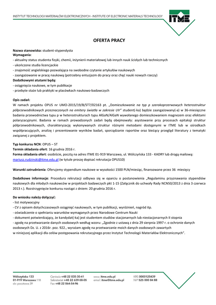 OFERTA PRACY Nazwa stanowiska: student-stypendysta Wymagania: - aktualny status studenta fizyki, chemii, inżynierii materiałowej lub innych nauk ścisłych lub technicznych - ukończone studia licencjackie - znajomość angielskiego pozwalająca na swobodne czytanie artykułów naukowych - zaangażowanie w pracę naukową (potrzebny entuzjazm do pracy oraz chęć nauki nowych rzeczy) Dodatkowymi atutami będą: - osiągnięcia naukowe, w tym publikacje - przebyte staże lub praktyki w placówkach naukowo-badawczych Opis zadań: W ramach projektu OPUS nr UMO-2015/19/B/ST7/02163 pt. „Domieszkowanie na typ p szerokoprzerwowych heterostruktur półprzewodnikowych przeznaczonych na emitery światła w zakresie UV” student(-ka) będzie zaangażowany(-a) w 36-miesięczne badania przewodnictwa typu p w heterostrukturach typu AlGaN/AlGaN wywołanego domieszkowaniem magnezem oraz efektami polaryzacyjnymi. Badania w ramach prowadzonych zadań będą obejmowały: asystowanie przy procesach epitaksji struktur półprzewodnikowych, charakteryzację wykonywanych struktur różnymi metodami dostępnymi w ITME lub w ośrodkach współpracujących, analizę i prezentowanie wyników badań, sporządzanie raportów oraz bieżący przegląd literatury z tematyki związanej z projektem. Typ konkursu NCN: OPUS – ST Termin składania ofert: 16 grudnia 2016 r. Forma składania ofert: osobiście, pocztą na adres ITME 01-919 Warszawa, ul. Wólczyńska 133 - KADRY lub drogą mailową: [email protected] (w tytule proszę dopisać rekrutacja OPUS10) Warunki zatrudnienia: Oferujemy stypendium naukowe w wysokości 1500 PLN/miesiąc, finansowane przez 36 miesięcy Dodatkowe informacje: Procedura rekrutacji odbywa się w oparciu o postanowienia „Regulaminu przyznawania stypendiów naukowych dla młodych naukowców w projektach badawczych pkt 1-15 (Załącznik do uchwały Rady NCN50/2013 z dnia 3 czerwca 2013 r.). Rozstrzygnięcie konkursu nastąpi z dniem: 20 grudnia 2016 r. Do wniosku należy dołączyć: - list motywacyjny - CV z opisem dotychczasowych osiągnięć naukowych, w tym publikacji, wyróżnień, nagród itp. - oświadczenie o spełnianiu warunków wymaganych przez Narodowe Centrum Nauki - dokument potwierdzający, że kandydat(-ka) jest studentem studiów stacjonarnych lub niestacjonarnych II stopnia - zgodę na przetwarzanie danych osobowych według wzoru: „Zgodnie z ustawą z dnia 29 sierpnia 1997 r. o ochronie danych osobowych Dz. U. z 2016r. poz. 922., wyrażam zgodę na przetwarzanie moich danych osobowych zawartych w niniejszej aplikacji dla celów postępowania rekrutacyjnego przez Instytut Technologii Materiałów Elektronicznych”.