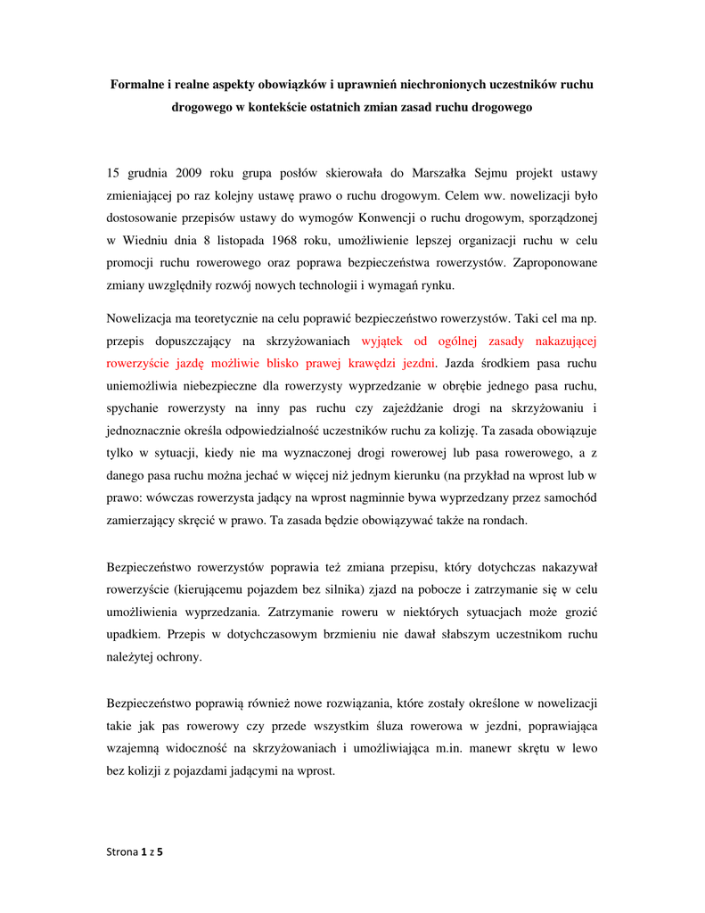 Formalne i realne aspekty obowiązków i uprawnień niechronionych uczestników ruchu drogowego w kontekście ostatnich zmian zasad ruchu drogowego 15 grudnia 2009 roku grupa posłów skierowała do Marszałka Sejmu projekt ustawy zmieniającej po raz kolejny ustawę prawo o ruchu drogowym. Celem ww. nowelizacji było dostosowanie przepisów ustawy do wymogów Konwencji o ruchu drogowym, sporządzonej w Wiedniu dnia 8 listopada 1968 roku, umożliwienie lepszej organizacji ruchu w celu promocji ruchu rowerowego oraz poprawa bezpieczeństwa rowerzystów. Zaproponowane zmiany uwzględniły rozwój nowych technologii i wymagań rynku. Nowelizacja ma teoretycznie na celu poprawić bezpieczeństwo rowerzystów. Taki cel ma np. przepis dopuszczający na skrzyżowaniach wyjątek od ogólnej zasady nakazującej rowerzyście jazdę możliwie blisko prawej krawędzi jezdni. Jazda środkiem pasa ruchu uniemożliwia niebezpieczne dla rowerzysty wyprzedzanie w obrębie jednego pasa ruchu, spychanie rowerzysty na inny pas ruchu czy zajeżdżanie drogi na skrzyżowaniu i jednoznacznie określa odpowiedzialność uczestników ruchu za kolizję. Ta zasada obowiązuje tylko w sytuacji, kiedy nie ma wyznaczonej drogi rowerowej lub pasa rowerowego, a z danego pasa ruchu można jechać w więcej niż jednym kierunku (na przykład na wprost lub w prawo: wówczas rowerzysta jadący na wprost nagminnie bywa wyprzedzany przez samochód zamierzający skręcić w prawo. Ta zasada będzie obowiązywać także na rondach. Bezpieczeństwo rowerzystów poprawia też zmiana przepisu, który dotychczas nakazywał rowerzyście (kierującemu pojazdem bez silnika) zjazd na pobocze i zatrzymanie się w celu umożliwienia wyprzedzania. Zatrzymanie roweru w niektórych sytuacjach może grozić upadkiem. Przepis w dotychczasowym brzmieniu nie dawał słabszym uczestnikom ruchu należytej ochrony. Bezpieczeństwo poprawią również nowe rozwiązania, które zostały określone w nowelizacji takie jak pas rowerowy czy przede wszystkim śluza rowerowa w jezdni, poprawiająca wzajemną widoczność na skrzyżowaniach i umożliwiająca m.in. manewr skrętu w lewo bez kolizji z pojazdami jadącymi na wprost. Strona 1 z 5 Część proponowanych zmian ułatwi też poruszanie się rowerem. Należy do nich dopuszczenie wyprzedzania przez rowerzystów wolno jadących pojazdów z ich prawej strony. Taką możliwość przewidują przepisy ruchu drogowego obowiązujące w wielu państwach europejskich (m. in. Holandii, Niemiec czy Danii) i promują rower jako przyjazny dla środowiska pojazd, dając mu rzeczywistą i umocowaną w prawie przewagę nad samochodem w warunkach wielkomiejskiego zatłoczenia ulic. Z kolei dopuszczenie jazdy rowerzystów obok siebie legalizuje treningi kolarzy w peletonie. Dotychczas trenujący na polskich drogach publicznych jazdę w grupie kolarze musieli łamać przepisy. Nowelizacja uwzględnia też rozwój rynku. Dopuszcza przewóz dzieci w powszechnie dostępnych na rynku przyczepach rowerowych. Przyczepki do przewozu dzieci są bezpieczniejsze niż foteliki mocowane na rowerze. Przed omówieniem nowych regulacji związanych z ruchem rowerowym warto czytelnikom przypomnieć, iż w 2010 roku wprowadzono kilka zmian w prawie o ruchu drogowym, które także dotyczyły zasad ruchu. Należały do nich: - określenie nowych wartości prędkości dopuszczalnych na autostradach ( 140 km/h ) oraz drogach ekspresowych dwujezdniowych ( 120 km/h ) dla kierujących samochodami osobowymi, motocyklami oraz samochodami ciężarowymi o dopuszczalnej masie całkowitej nieprzekraczającej 3,5t. - umożliwienie Inspekcji Transportu Drogowego wykonywania kontroli ruchu drogowego pojazdów innych niż wykonujących przewóz drogowy w sytuacji uzasadnionego podejrzenia, iż kierują nimi osoby znajdujące się w stanie nietrzeźwości, w stanie po użyciu alkoholu lub środka działającego podobnie do alkoholu, a także wobec kierujących naruszających przepisy ruchu drogowego w przypadku zarejestrowania tego naruszenia przy użyciu przyrządów kontrolno-pomiarowych lub urządzeń rejestrujących, Fakt zmiany w zasadach ruchu jest godny odnotowania w świadomości uczestników ruchu drogowego z uwagi na korektę zasad ruchu rowerzystów jako jego niechronionych Strona 2 z 5 uczestników. Z uwagi na fakt, iż zaproponowane zmiany istotnie wpływają na zachowania kierowców pojazdów silnikowych warto je w sposób przystępny zaprezentować i omówić. Ustawa z dnia 1 kwietnia 2011 roku, która na dzień dzisiejszy ( 12 kwietnia 2011 roku ) czeka na podpis Prezydenta, wejdzie w życie po upływie 14 dni od dnia ogłoszenia w Dzienniku Ustaw. W zakresie przepisów dotyczących ruchu rowerów zawiera zmiany, które dotyczą: 1) zmiany definicji drogi dla rowerów; dotychczasowe brzmienie zostało poszerzone o element konstrukcyjnego oddzielenia ww. drogi od innych dróg lub jezdni; 2) wprowadzenia nowego pojęcia pasa ruchu dla rowerów jako części jezdni przeznaczonej do ruchu rowerów w jednym kierunku, oznaczonej odpowiednimi znakami drogowymi; 3) wprowadzenia nowego pojęcia ,,śluzy dla rowerów” - części jezdni na wlocie skrzyżowania na całej szerokości jezdni lub wybranego pasa ruchu przeznaczonej do zatrzymania rowerów w celu zmiany kierunku jazdy lub ustąpienia pierwszeństwa, oznaczonej odpowiednimi znakami drogowymi; 4) zmiany definicji roweru; określono maksymalną szerokość tego typu pojazdu na nieprzekraczającą 0,9 m; rower jest poruszany siłą mięśni osoby jadącej tym pojazdem; rower może być wyposażony w uruchamiany naciskiem na pedały pomocniczy napęd elektryczny zasilany prądem o napięciu nie wyższym niż 48 V o znamionowej mocy ciągłej nie większej niż 250 W, którego moc wyjściowa zmniejsza się stopniowo i spada do zera po przekroczeniu prędkości 25 km/h; 5) wprowadzenia nowego pojęcia ,,wózek rowerowy” – jako pojazdu o szerokości powyżej 0,9 m przeznaczonego do przew