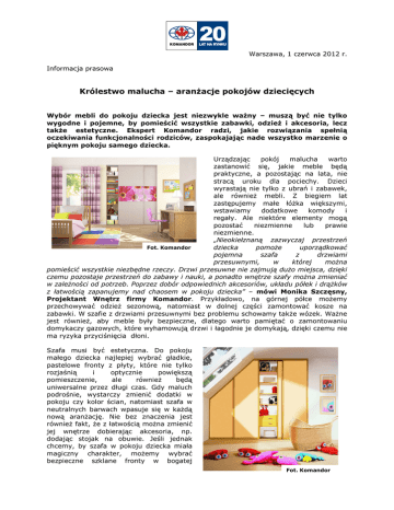 Warszawa, 1 czerwca 2012 r. Informacja prasowa Królestwo malucha – aranŜacje pokojów dziecięcych Wybór mebli do pokoju dziecka jest niezwykle waŜny – muszą być nie tylko wygodne i pojemne, by pomieścić wszystkie zabawki, odzieŜ i akcesoria, lecz takŜe estetyczne. Ekspert Komandor radzi, jakie rozwiązania spełnią oczekiwania funkcjonalności rodziców, zaspokajając nade wszystko marzenie o pięknym pokoju samego dziecka. Urządzając pokój malucha warto zastanowić się, jakie meble będą praktyczne, a pozostając na lata, nie stracą uroku dla pociechy. Dzieci wyrastają nie tylko z ubrań i zabawek, ale równieŜ mebli. Z biegiem lat zastępujemy małe łóŜka większymi, wstawiamy dodatkowe komody i regały. Ale niektóre elementy mogą pozostać niezmienne lub prawie niezmienne. „Nieokiełznaną zazwyczaj przestrzeń Fot. Komandor dziecka pomoŜe uporządkować pojemna szafa z drzwiami przesuwnymi, w której moŜna pomieścić wszystkie niezbędne rzeczy. Drzwi przesuwne nie zajmują duŜo miejsca, dzięki czemu pozostaje przestrzeń do zabawy i nauki, a ponadto wnętrze szafy moŜna zmieniać w zaleŜności od potrzeb. Poprzez dobór odpowiednich akcesoriów, układu półek i drąŜków z łatwością zapanujemy nad chaosem w pokoju dziecka” – mówi Monika Szczęsny, Projektant Wnętrz firmy Komandor. Przykładowo, na górnej półce moŜemy przechowywać odzieŜ sezonową, natomiast w dolnej części zamontować kosze na zabawki. W szafie z drzwiami przesuwnymi bez problemu schowamy takŜe wózek. WaŜne jest równieŜ, aby meble były bezpieczne, dlatego warto pamiętać o zamontowaniu domykaczy gazowych, które wyhamowują drzwi i łagodnie je domykają, dzięki czemu nie ma ryzyka przyciśnięcia dłoni. Szafa musi być estetyczna. Do pokoju małego dziecka najlepiej wybrać gładkie, pastelowe fronty z płyty, które nie tylko rozjaśnią i optycznie powiększą pomieszczenie, ale równieŜ będą uniwersalne przez długi czas. Gdy maluch podrośnie, wystarczy zmienić dodatki w pokoju czy kolor ścian, natomiast szafa w neutralnych barwach wpasuje się w kaŜdą nową aranŜację. Nie bez znaczenia jest równieŜ fakt, Ŝe z łatwością moŜna zmienić jej wnętrze dobierając akcesoria, np. dodając stojak na obuwie. Jeśli jednak chcemy, by szafa w pokoju dziecka miała magiczny charakter, moŜemy wybrać bezpieczne szklane fronty w bogatej Fot. Komandor palecie kolorystycznej, które są zabezpieczone folią i łatwe w utrzymaniu czystości – moŜna z nich zmyć nawet radosną twórczość malucha. Gdy dziecko rośnie i ze szkraba staje się nastolatkiem, chce pokazać całemu światu swoją osobowość i indywidualizm. Drzwi przesuwne wówczas moŜna przearanŜować na młodzieŜową zabudowę wymieniając ich wypełnienie. Dziewczynki mogą wybrać coś dla siebie spośród subtelnych odcieni róŜu i fioletu, chłopcy natomiast zdecydować się na wyraziste postacie bohaterów komiksowych czy elementy graffiti. „Dowolną grafikę moŜna nadrukować na szkle, dzięki czemu mebel jest jeszcze bardziej wyjątkowy i osobisty” – mówi Monika Szczęsny. Nastolatki mają z czego wybierać – od płyty meblowej, wypełnienia lustrzanego, poprzez ekologiczne rozwiązania, jak bambus, rattan czy skóra ekologiczna, po kolorowe szkło lacobel czy tłoczone lub aŜurowe panele z Fot. Komandor płyty MDF. Zmiana frontów zabudowy nada pokojowi dziecka zupełnie innego charakteru, a rodzice unikną zbędnych wydatków związanych z całkowitą zmianą aranŜacji pomieszczenia. Firma Komandor S.A. powstała w 1992 roku. Od 20 lat jest liderem w branŜy systemów do drzwi przesuwnych i zabudowy wnętrz. Komandor w oparciu o autorski program Designer projektuje a następnie wykonuje meble na zamówienie umoŜliwiając klientom aranŜację przestrzeni mieszkalnej według własnych potrzeb. Produkty marki Komandor docenione zostały juŜ w ponad 40 krajach na świecie, dzięki swej wysokiej jakości udokumentowanej atestami i certyfikatami wymaganymi przez standardy europejskie. Więcej informacji: http://www.komandor.pl Kontakt dla mediów: Katarzyna Jędrek, Anna Zając Triple PR Ul. Leszno 8/28; 01-192 Warszawa tel. 022 216 54 14, kom. 722100505 [email protected], [email protected]