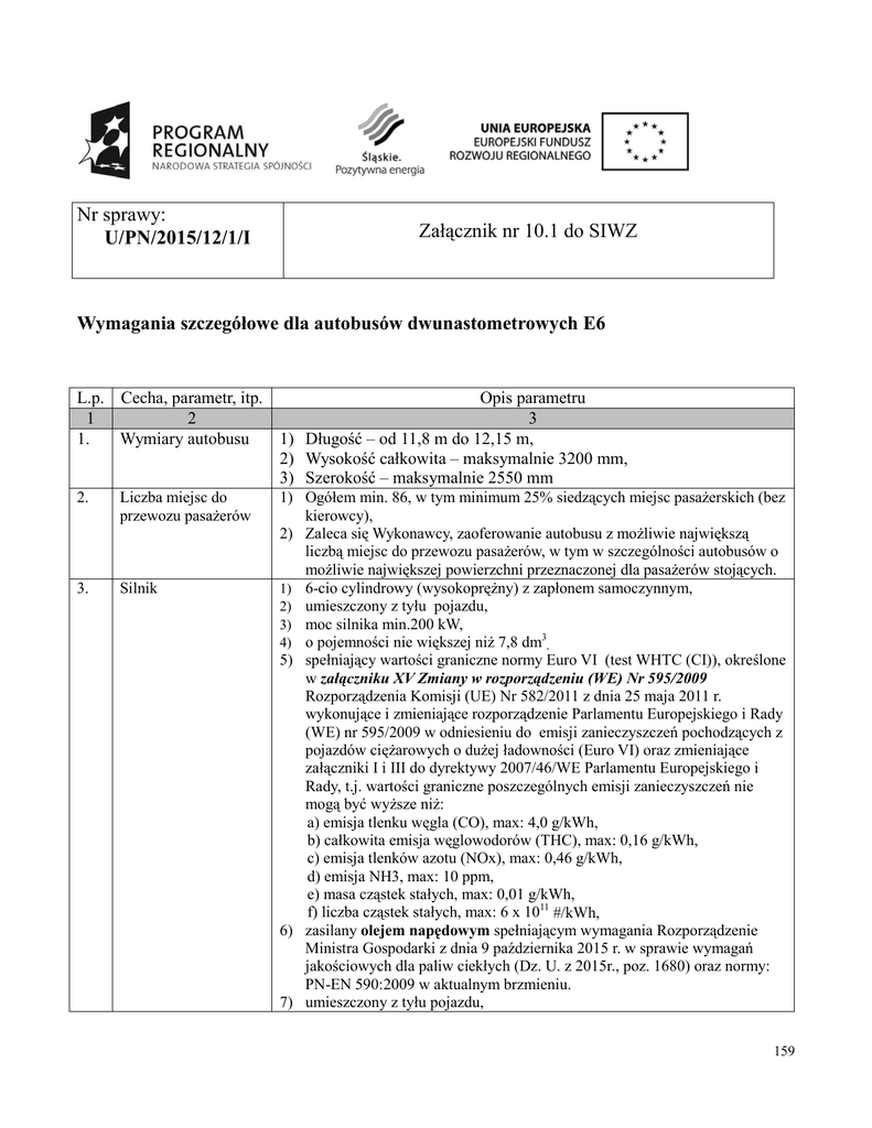 Nr sprawy: U/PN/2015/12/1/I Załącznik nr 10.1 do SIWZ Wymagania szczegółowe dla autobusów dwunastometrowych E6 L.p. Cecha, parametr, itp. Opis parametru 1 2 3 1. Wymiary autobusu 1) Długość – od 11,8 m do 12,15 m, 2) Wysokość całkowita – maksymalnie 3200 mm, 3) Szerokość – maksymalnie 2550 mm 2. Liczba miejsc do przewozu pasażerów 3. Silnik 1) Ogółem min. 86, w tym minimum 25% siedzących miejsc pasażerskich (bez kierowcy), 2) Zaleca się Wykonawcy, zaoferowanie autobusu z możliwie największą liczbą miejsc do przewozu pasażerów, w tym w szczególności autobusów o możliwie największej powierzchni przeznaczonej dla pasażerów stojących. 1) 6-cio cylindrowy (wysokoprężny) z zapłonem samoczynnym, 2) umieszczony z tyłu pojazdu, 3) moc silnika min.200 kW, 3 4) o pojemności nie większej niż 7,8 dm , 5) spełniający wartości graniczne normy Euro VI (test WHTC (CI)), określone w załączniku XV Zmiany w rozporządzeniu (WE) Nr 595/2009 Rozporządzenia Komisji (UE) Nr 582/2011 z dnia 25 maja 2011 r. wykonujące i zmieniające rozporządzenie Parlamentu Europejskiego i Rady (WE) nr 595/2009 w odniesieniu do emisji zanieczyszczeń pochodzących z pojazdów ciężarowych o dużej ładowności (Euro VI) oraz zmieniające załączniki I i III do dyrektywy 2007/46/WE Parlamentu Europejskiego i Rady, t.j. wartości graniczne poszczególnych emisji zanieczyszczeń nie mogą być wyższe niż: a) emisja tlenku węgla (CO), max: 4,0 g/kWh, b) całkowita emisja węglowodorów (THC), max: 0,16 g/kWh, c) emisja tlenków azotu (NOx), max: 0,46 g/kWh, d) emisja NH3, max: 10 ppm, e) masa cząstek stałych, max: 0,01 g/kWh, f) liczba cząstek stałych, max: 6 x 1011 #/kWh, 6) zasilany olejem napędowym spełniającym wymagania Rozporządzenie Ministra Gospodarki z dnia 9 października 2015 r. w sprawie wymagań jakościowych dla paliw ciekłych (Dz. U. z 2015r., poz. 1680) oraz normy: PN-EN 590:2009 w aktualnym brzmieniu. 7) umieszczony z tyłu pojazdu, 159 Nr sprawy: U/PN/2015/12/1/I 4. 5. 6. 7. 8. Ilość osi Ilość drzwi Dopuszczalna Masa Całkowita Skrzynia biegów (i wał napędowy) Układ chłodzenia Załącznik nr 10.1 do SIWZ 8) układ zasilania silnika wyposażony: a) w podgrzewany separator wody, b) zbiornik oleju napędowego wykonany z materiałów odpornych na korozje o pojemności co najmniej 210 litrów, zamykany na klucz wlew zbiornika paliwa (korek lub klapka osłaniająca) oraz przystosowany do założenia plomb jednorazowych (kontrolno zabezpieczających) PCV, 9) wyposażony w automatyczny, elektronicznie sterowany dozownik oleju silnikowego z zintegrowanym czujnikiem przechyłu oraz z zapisem pracy w pamięci elektronicznej, dwie osie: w tym jedna napędowa troje drzwi dwuskrzydłowych do 18000 [Kg] 1) automatyczna minimum czterozakresowa ze zintegrowanym retarderem o działaniu niezależnym od włączonego biegu, a) retarder uruchamiany „trójpozycyjną” dźwignią, zlokalizowaną na stanowisku (miejscu) pracy kierowcy oraz pedałem hamulca (załączenie retardera włącza światła „STOP”), b) możliwość wyłączenia układu sterowania retardera pedałem hamulca, wyłącznikiem zlokalizowanym na stanowisku (miejscu) pracy kierowcy, 2) zmiana biegów sterowana elektronicznie przy wykorzystaniu oprogramowania, uwzględniającego (automatycznie w trakcie jazdy) topografię terenu, 3) z opcją rozłączania napędu (silnik – skrzynia biegów) uruchamianą automatycznie po włączeniu hamulca przystankowego, 4) wyposażona w system wczesnego ostrzegania przed uszkodzeniami (system ten musi umożliwiać Zamawiającemu wczesne wykrywanie granicznego zużycia skrzyni biegów, w szczególności informować kierującego autobusem o konieczności przerwania pracy skrzyni biegów przed jej faktycznym uszkodzeniem), 5) wał napędowy bezobsługowy, 1) przewody układu chłodzenia ( odporne na korozję) – wykonane z: miedzi, mosiądzu lub (i) tworzyw sztucznych – łączone ze sobą złączami z gumy silikonowej lub (i) elastomerów, zaciskanymi opaskami ślimakowymi (zalecane) lub (i) innymi zapewniającymi szczelność układu, termoizolowane (termoizolacja w komorze silnika nie jest konieczna), 2) zbiornik wyrównawczy wykonany z materiału odpornego na korozję (jak w pkt a) lub ze stali nierdzewnej, 3) wypełniony płynem niskokrzepnącym o temperaturze krystalizacji 160 Nr sprawy: U/PN/2015/12/1/I Załącznik nr 10.1 do SIWZ 4) 5) 9. Ogrzewanie 1) 2) minimum - 37°C, płyn niskokrzepnący dodatkowo musi posiadać możliwość mieszania go z płynami spełniającymi warunki norm i specyfikacji: MAN 324 NF, DAF 74002, SAE J 1034, Mercedes Benz Blat 325.0, UWAGA Jeżeli Wykonawca zaoferuje autobusy wypełnione płynem niskokrzepnącym, który nie będzie miał możliwości mieszania go z ww. płynami, to Wykonawca zobowiązany będzie w okresie gwarancji na cały autobus (o której mowa w części D ust. 1 pkt 1 litera b) dostarczyć nieodpłatnie zaoferowany płyn niskokrzepnący zarówno do okresowych wymian tego płynu jak i też bieżących uzupełnień, wyposażony w korek(korki) spustowy umożliwiający spuszczenie z układu minimum 80 % płynu niskokrzepnącego, chłodnica lub zespół chłodnic zabezpieczony przed zabrudzeniem, poprzez zastosowanie dodatkowego filtra siatkowego, łatwo demontowanego, wielokrotnego użytku. wodne - wykorzystujące ciepło z układu chłodzenia silnika, realizowane przez: a) nagrzewnice z wentylatorami w przestrzeni pasażerskiej (minimum 2 sztuki) oraz jedną w kabinie kierowcy, b) grzejnik/i konwertorowy/e rozmieszczony/e w przestrzeni pasażerskiej, grzejniki te nie będą wymagane jeżeli autobus będzie wyposażony w dodatkową centralę grzewczą (zespół nagrzewnic z wentylatorami o mocy co najmniej 40 kW) - zwaną dalej centralą grzewczą) zabudowaną na dachu autobusu, c) nagrzewnicę frontową służącą do kompleksowego ogrzewania miejsca pracy kierowcy, w tym szyby przedniej, sterowanie og