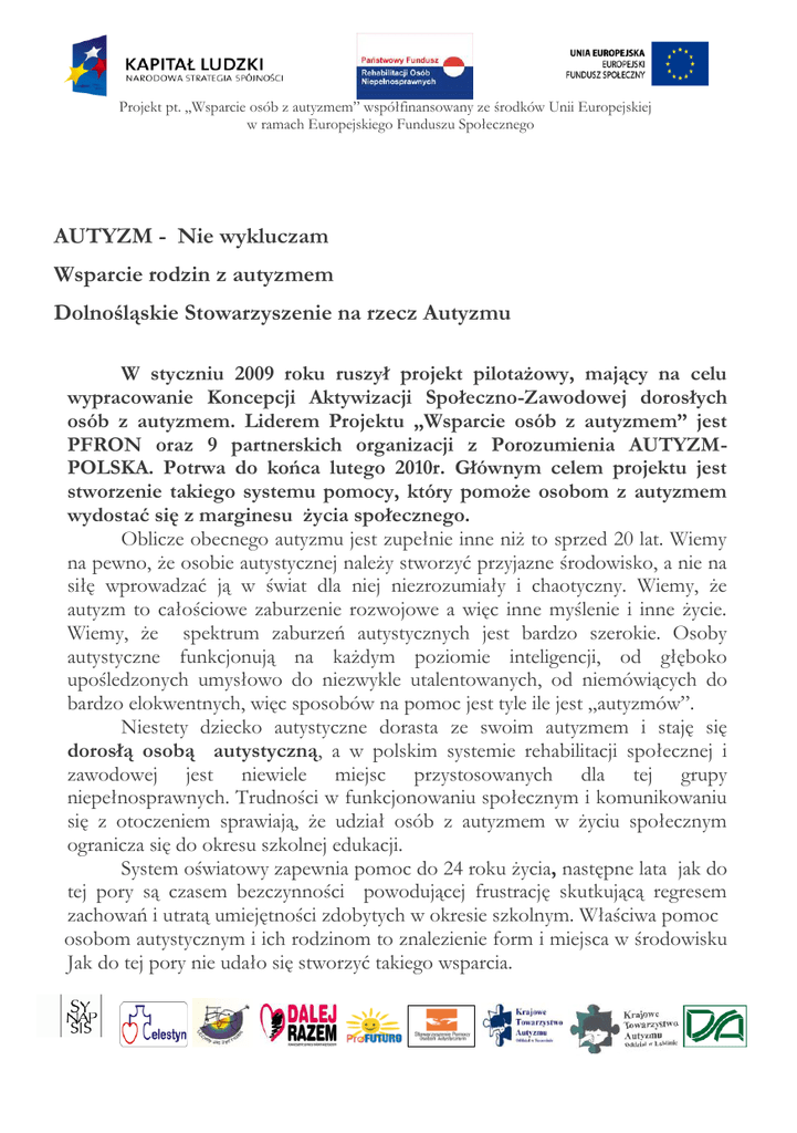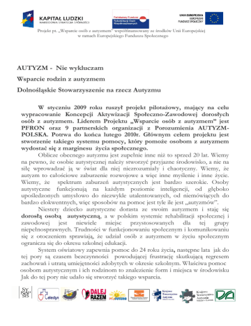 Projekt pt. „Wsparcie osób z autyzmem” współfinansowany ze środków Unii Europejskiej w ramach Europejskiego Funduszu Społecznego AUTYZM - Nie wykluczam Wsparcie rodzin z autyzmem Dolnośląskie Stowarzyszenie na rzecz Autyzmu W styczniu 2009 roku ruszył projekt pilotażowy, mający na celu wypracowanie Koncepcji Aktywizacji Społeczno-Zawodowej dorosłych osób z autyzmem. Liderem Projektu „Wsparcie osób z autyzmem” jest PFRON oraz 9 partnerskich organizacji z Porozumienia AUTYZMPOLSKA. Potrwa do końca lutego 2010r. Głównym celem projektu jest stworzenie takiego systemu pomocy, który pomoże osobom z autyzmem wydostać się z marginesu życia społecznego. Oblicze obecnego autyzmu jest zupełnie inne niż to sprzed 20 lat. Wiemy na pewno, że osobie autystycznej należy stworzyć przyjazne środowisko, a nie na siłę wprowadzać ją w świat dla niej niezrozumiały i chaotyczny. Wiemy, że autyzm to całościowe zaburzenie rozwojowe a więc inne myślenie i inne życie. Wiemy, że spektrum zaburzeń autystycznych jest bardzo szerokie. Osoby autystyczne funkcjonują na każdym poziomie inteligencji, od głęboko upośledzonych umysłowo do niezwykle utalentowanych, od niemówiących do bardzo elokwentnych, więc sposobów na pomoc jest tyle ile jest „autyzmów”. Niestety dziecko autystyczne dorasta ze swoim autyzmem i staję się dorosłą osobą autystyczną, a w polskim systemie rehabilitacji społecznej i zawodowej jest niewiele miejsc przystosowanych dla tej grupy niepełnosprawnych. Trudności w funkcjonowaniu społecznym i komunikowaniu się z otoczeniem sprawiają, że udział osób z autyzmem w życiu społecznym ogranicza się do okresu szkolnej edukacji. System oświatowy zapewnia pomoc do 24 roku życia, następne lata jak do tej pory są czasem bezczynności powodującej frustrację skutkującą regresem zachowań i utratą umiejętności zdobytych w okresie szkolnym. Właściwa pomoc osobom autystycznym i ich rodzinom to znalezienie form i miejsca w środowisku Jak do tej pory nie udało się stworzyć takiego wsparcia. Projekt pt. „Wsparcie osób z autyzmem” współfinansowany ze środków Unii Europejskiej w ramach Europejskiego Funduszu Społecznego Wieloletnia praca, doświadczenie , znajomość problemów młodzieży i dorosłych osób z autyzmem, uczestnictwo w programach i projektach skierowanych na dorosłe osoby dają nam szansę na właściwe rozwiązania, które chcemy wdrażać dając świadectwo ,że autyzm to nie diagnoza społecznego wykluczenia, a świadomość ,że problemy tych osób można rozwiązać przy stosowaniu właściwych form pomocowych ,terapeutycznych, aktywizujących. Od kilkunastu lat upominamy się o miejsce osób z autyzmem w społeczeństwie, o szansę korzystania z praw obywatelskich . Przyjmuje się, że w Polsce żyje co najmniej 30 000 osób z autyzmem, choć są to jedynie dane szacunkowe, oparte na wskaźnikach epidemiologicznych z innych krajów. Problem wykluczenia społecznego, w tym z rynku pracy, dotyczy w naszym kraju ok. 10 000 dorosłych osób z autyzmem. Dziecko autystyczne staje się dorosłą osobą autystyczną, która wymaga wsparcia przez całe swoje życie. Dlatego z innymi organizacjami z Porozumienia Autyzm –Polska realizujemy jako Partner PFRON-u zadania projektu „Wsparcie osób z autyzmem”. Wymiernym i ważnym rezultatem projektu w skali kraju będzie: objęcie 274/ 60 osób Dolny Śląsk w tym 48 osób Dolnośląskie Stowarzyszenie na rzecz Autyzmu Wrocław i 12 osób Stowarzyszenie Sw. Celestyna Mikoszów / dorosłe osoby z autyzmem profilowanym wsparciem w aktywizacji zawodowej i społecznej wraz z opracowaniem indywidualnej ścieżki rozwoju aktywizacji społecznej i zawodowej, skierowanie kilkunastoosobowej grupy osób z autyzmem do ZAZ lub WTZ, zatrudnienie osób z autyzmem w podmiocie sektora ekonomii społecznej. Nie mniej ważne będzie wypracowanie koncepcji systemowych rozwiązań aktywizujących dla osób dorosłych w oparciu o rezultaty projektu. W sytuacji dramatycznie zwiększającej się liczby osób diagnozowanych jako autystyczne, a tak jest obecnie nie tylko w Polsce, musimy uświadomić wszystkim od których zależy instytucjonalna pomoc , konieczność pilnego wdrożenia systemu pomocy dla całej populacji od wczesnej interwencji po późną dorosłość.