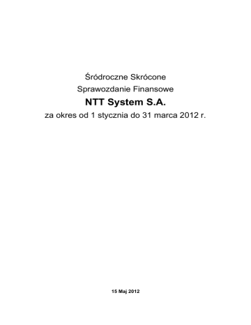 Śródroczne Skrócone Sprawozdanie Finansowe NTT System S.A. za okres od 1 stycznia do 31 marca 2012 r. 15 Maj 2012 NTT System S.A. - Śródroczne skrócone sprawozdanie finansowe za okres od 1 stycznia 2012 do 31 marca 2012 Spis treści Strona I. SKRÓCONE SPRAWOZDANIE FINANSOWE NTT SYSTEM S.A. ZA OKRES OD 1 STYCZNIA 2012 DO 31 MARCA 2012 ROKU 4 Sprawozdanie z Całkowitych Dochodów za okres od 1 stycznia 2012 do 31 marca 2012 roku (układ kalkulacyjny) 4 Sprawozdanie z Sytuacji Finansowej sporządzone na dzień 31 marca 2012 roku 5 Sprawozdanie ze Zmian w Kapitale Własnym za okres od 1 stycznia 2012 do 31 marca 2012 roku 7 Sprawozdanie z Przepływów Pieniężnych za okres od 1 stycznia 2012 do 31 marca 2012 roku (metoda pośrednia) 10 II. SKRÓCONE SKONSOLIDOWANE SPRAWOZDANIE FINANSOWE GRUPY KAPITAŁOWEJ NTT SYSTEM S.A. ZA OKRES OD 1 STYCZNIA 2012 DO 31 MARCA 2012 ROKU 11 Skonsolidowane Sprawozdanie z Całkowitych Dochodów za okres od 1 stycznia 2012 do 31 marca 2012 roku (układ kalkulacyjny) 11 Skonsolidowane Sprawozdanie z Sytuacji Finansowej sporządzone na dzień 31 marca 2012 roku 12 Skonsolidowane Sprawozdanie ze Zmian w Kapitale Własnym za okres od 1 stycznia 2012 do 31 marca 2012 roku 14 Skonsolidowane Sprawozdanie z Przepływów Pieniężnych za okres od 1 stycznia 2012 do 31 marca 2012 roku (metoda pośrednia) 17 III. Noty objaśniające do Śródrocznego Skróconego Sprawozdania Finansowego sporządzonego na dzień 31 marca 2012 roku 18 IV. Informacja dodatkowa do Śródrocznego Skróconego Sprawozdania Finansowego sporządzonego na dzień 31 marca 2012 roku 27 2 NTT System S.A. - Śródroczne skrócone sprawozdanie finansowe za okres od 1 stycznia 2012 do 31 marca 2012 Indeks not objaśniających do Śródrocznego Skróconego Sprawozdania Finansowego Strona 1 Oświadczenie o zgodności 18 2 Stosowane zasady rachunkowości 18 3 Segmenty operacyjne 20 4 Zysk przypadający na jedną akcję 22 5 Jednostki zależne 23 6 Inwestycje w jednostkach stowarzyszonych 23 7 Wspólne Przedsięwzięcia 24 8 Kapitał podstawowy 24 9 Kredyty i pożyczki otrzymane 25 10 Transakcje z jednostkami powiązanymi 25 3 NTT System S.A. - Śródroczne skrócone sprawozdanie finansowe za okres od 1 stycznia 2012 do 31 marca 2012 I. SKRÓCONE SPRAWOZDANIE FINANSOWE NTT SYSTEM S.A. ZA OKRES OD 1 STYCZNIA DO 31 MARCA 2012 ROKU SPRAWOZDANIE Z CAŁKOWITYCH DOCHODÓW ZA OKRES OD 1 STYCZNIA 2012 DO 31 MARCA 2012 (UKŁAD KALKULACYJNY) Okres od 01/01/2012 do 31/03/2012 Okres od 01/01/2011 do 31/03/2011 (tys. PLN) (tys. PLN) 152 621 143 298 118 327 111 180 Zysk (strata) brutto na sprzedaży 9 323 7 147 Koszty sprzedaży Koszty zarządu Pozostałe przychody operacyjne Pozostałe koszty operacyjne 6 307 1 017 1 016 3 286 4 668 978 1 032 1 920 Zysk (strata) na działalności operacyjnej (271) 613 Przychody finansowe Koszty finansowe 1 172 414 460 738 487 335 95 113 392 222 - - 392 222 Inne całkowite dochody Różnice kursowe z przeliczenia jednostek zagranicznych Skutki wyceny aktywów finansowych dostępnych do sprzedaży Rachunkowość zabezpieczeń Skutki aktualizacji majątku trwałego Zyski i straty aktuarialne Udział w innych całkowitych dochodach jednostek stowarzyszonych Podatek dochodowy dotyczący innych całkowitych dochodów - - Inne całkowite dochody (netto) - - 392 222 Z działalności kontynuowanej i zaniechanej: Zwykły Rozwodniony 0,01 0,01 0,00 0,00 Z działalności kontynuowanej : Zwykły Rozwodniony 0,01 0,01 0,00 0,00 Działalność kontynuowana Przychody ze sprzedaży Koszt własny sprzedaży Zysk (strata) przed opodatkowaniem Podatek dochodowy Zysk (strata) netto z działalności kontynuowanej Działalność zaniechana Zysk (strata) netto z działalności zaniechanej Zysk (strata) netto Całkowite dochody ogółem Zysk (strata) na jedną akcję Zysk (strata) jedną akcję (w zł na jednąna akcję) 4 NTT System S.A. - Śródroczne skrócone sprawozdanie finansowe za okres od 1 stycznia 2012 do 31 marca 2012 SPRAWOZDANIE Z SYTUACJI FINANSOWEJ NA DZIEŃ 31 MARCA 2012 ROKU Stan na 31/03/2012 (tys. PLN) Stan na 31/12/2011 (tys. PLN) Stan na 31/03/2011 (tys. PLN) Aktywa trwałe Rzeczowe aktywa trwałe Nieruchomości inwestycyjne Wartość firmy Pozostałe wartości niematerialne Inwestycje w jednostkach stowarzyszonych Aktywa z tytułu podatku odroczonego Należności z tytułu leasingu finansowego Pozostałe aktywa finansowe Pozostałe aktywa 22 361 3 172 31 594 6 603 2 480 - 22 388 3 172 31 598 6 603 2 529 - 22 760 3 172 31 586 6 603 3 239 - Aktywa trwałe razem 66 210 66 290 67 360 Aktywa obrotowe Zapasy Należności z tytułu dostaw i usług oraz pozostałe należności Należności z tytułu leasingu finansowego Pozostałe aktywa finansowe Bieżące aktywa podatkowe Pozostałe aktywa Środki pieniężne i ich ekwiwalenty 35 163 75 635 3 1 594 524 30 870 75 657 4 165 2 157 45 690 63 443 1 7 877 13 545 - - - Aktywa obrotowe razem 112 919 112 849 130 556 Aktywa razem 179 129 179 139 197 916 AKTYWA Aktywa klasyfikowane jako przeznaczone do sprzedaży 5 NTT System S.A. - Śródroczne skrócone sprawozdanie finansowe za okres od 1 stycznia 2012 do 31 marca 2012 SPRAWOZDANIE Z SYTUACJI FINANSOWEJ NA DZIEŃ 31 MARCA 2012 ROKU (cd.) Stan na 31/03/2012 (tys. PLN) Stan na 31/12/2011 (tys. PLN) Stan na 31/03/2011 (tys. PLN) 83 100 37 026 6 658 392 (5 597) 83 100 37 026 6 658 813 (6 410) 83 100 37 026 6 658 222 (6 410) - - - 121 579 121 187 120 596 Zobowiązania długoterminowe Długoterminowe pożyczki i kredyty bankowe Pozostałe zobowiązania finansowe Zobowiązania z tytułu świadczeń emerytalnych Rezerwa na podatek odroczony Rezerwy długoterminowe Przychody przyszłych okresów Pozostałe zobowiązania 3 351 75 - 3 322 75 - 4 151 75 - Zobowiązania długoterminowe razem 3 426 3 397 4 226 35 472 11 737 467 4 057 2 391 - 42 874 8 791 63 449 1 522 856 - 43 724 18 825 41 1 963 8 541 - - - - Zobowiązania krótkoterminowe razem 54 124 54 555 73 094 Zobowiązania razem 57 550 57 952 77 320 179