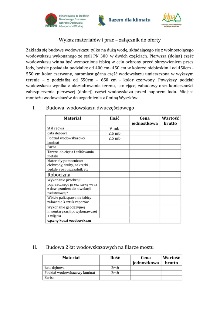 Wykaz materiałów i prac – załącznik do oferty Zakłada się budowę wodowskazu tylko na dużą wodę, składającego się z wolnostojącego wodowskazu wykonanego ze stali PN 300, w dwóch częściach. Pierwsza (dolna) część wodowskazu winna być wzmocniona izbicą w celu ochrony przed skrzywieniem przez lody, będzie posiadała podziałkę od 400 cm- 450 cm w kolorze niebieskim i od 450cm 550 cm kolor czerwony, natomiast górna część wodowskazu umieszczona w wyższym terenie – z podziałką od 550cm – 650 cm - kolor czerwony. Powyższy podział wodowskazu wynika z ukształtowania terenu, istniejącej zabudowy oraz konieczności zabezpieczenia pierwszej (dolnej) części wodowskazu przed naporem lodu. Miejsca montażu wodowskazów do uzgodnienia z Gminą Wyszków. I. Budowa wodowskazu dwuczęściowego Materiał Stal ceowa Łata dębowa Podział wodowskazowy laminat Farba Tarcze do cięcia i szlifowania metalu Materiały pomocnicze: elektrody, śruby, nakrętki , pędzle, rozpuszczalnik etc Ilość Cena Wartość jednostkowa brutto 9 mb 2,5 mb 2,5 mb Robocizna Wykonanie przekroju poprzecznego przez rzekę wraz z dowiązaniem do niwelacji państwowej* Wbicie pali, spawanie izbicy, założenie 3 sztuk reperów Wykonanie geodezyjnej inwentaryzacji powykonawczej + zdjęcia Łączny koszt wodowskazu II. Budowa 2 łat wodowskazowych na filarze mostu Materiał Ilość Łata dębowa Podział wodowskazowy laminat Farba 3mb 3mb Cena Wartość jednostkowa brutto Tarcze do cięcia i szlifowania metalu Materiały pomocnicze mocujące do filaru mostu: elektrody, śruby, nakrętki , pędzle, rozpuszczalnik etc Robocizna Wykonanie przekroju poprzecznego przez rzekę wraz z dowiązaniem do niwelacji państwowej Wykonanie geodezyjnej inwentaryzacji powykonawczej + zdjęcia Montaż Łączny koszt wodowskazu