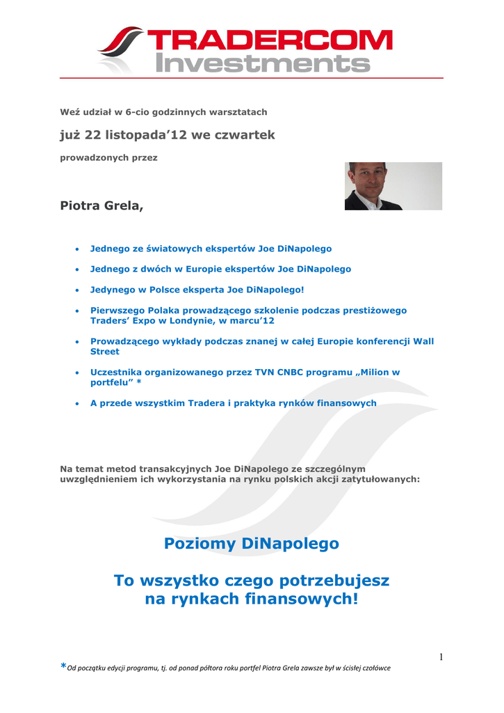 Weź udział w 6-cio godzinnych warsztatach już 22 listopada’12 we czwartek prowadzonych przez Piotra Grela, Jednego ze światowych ekspertów Joe DiNapolego Jednego z dwóch w Europie ekspertów Joe DiNapolego Jedynego w Polsce eksperta Joe DiNapolego! Pierwszego Polaka prowadzącego szkolenie podczas prestiżowego Traders’ Expo w Londynie, w marcu’12 Prowadzącego wykłady podczas znanej w całej Europie konferencji Wall Street Uczestnika organizowanego przez TVN CNBC programu „Milion w portfelu” * A przede wszystkim Tradera i praktyka rynków finansowych Na temat metod transakcyjnych Joe DiNapolego ze szczególnym uwzględnieniem ich wykorzystania na rynku polskich akcji zatytułowanych: Poziomy DiNapolego To wszystko czego potrzebujesz na rynkach finansowych! *Od początku edycji programu, tj. od ponad półtora roku portfel Piotra Grela zawsze był w ścisłej czołówce 1 W programie warsztatów między innymi: Formacje kierunkowe DiNapolego Analiza trendu i jak efektywnie poruszać się pomiędzy różnymi perspektywami czasowymi Jak znaleźć miejsca do zajęcia pozycji zawczasu! Jak określić miejsca realizacji zysku przed tym jak rynek tam dotrze! Jak zbudować Plan Transakcyjny Jak uniknąć manipulacji rynkiem oraz Jak stosować MACD Predictor ( wskaźnik wyprzedzający trendu ) Omawiany wyłącznie podczas Private Seminar Serdecznie zapraszam! Piotr Grela DiNapoli Expert www.tradercom.pl *Od początku edycji programu, tj. od ponad półtora roku portfel Piotra Grela zawsze był w ścisłej czołówce 2