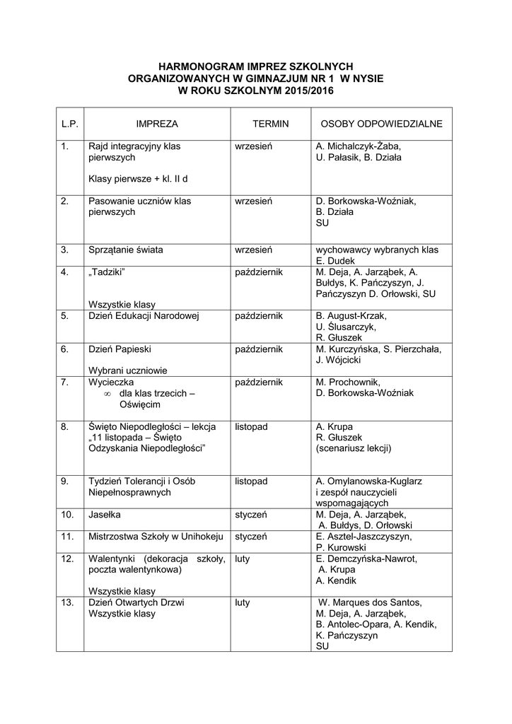 HARMONOGRAM IMPREZ SZKOLNYCH ORGANIZOWANYCH W GIMNAZJUM NR 1 W NYSIE W ROKU SZKOLNYM 2015/2016 L.P. 1. IMPREZA Rajd integracyjny klas pierwszych TERMIN OSOBY ODPOWIEDZIALNE wrzesień A. Michalczyk-Żaba, U. Pałasik, B. Działa Klasy pierwsze + kl. II d 2. Pasowanie uczniów klas pierwszych wrzesień D. Borkowska-Woźniak, B. Działa SU 3. Sprzątanie świata wrzesień 4. „Tadziki” październik wychowawcy wybranych klas E. Dudek M. Deja, A. Jarząbek, A. Bułdys, K. Pańczyszyn, J. Pańczyszyn D. Orłowski, SU 5. Wszystkie klasy Dzień Edukacji Narodowej październik 6. Dzień Papieski październik 7. Wybrani uczniowie Wycieczka • dla klas trzecich – Oświęcim B. August-Krzak, U. Ślusarczyk, R. Głuszek M. Kurczyńska, S. Pierzchała, J. Wójcicki październik M. Prochownik, D. Borkowska-Woźniak 8. Święto Niepodległości – lekcja „11 listopada – Święto Odzyskania Niepodległości” listopad A. Krupa R. Głuszek (scenariusz lekcji) 9. Tydzień Tolerancji i Osób Niepełnosprawnych listopad 10. Jasełka styczeń 11. Mistrzostwa Szkoły w Unihokeju styczeń 12. Walentynki (dekoracja szkoły, luty poczta walentynkowa) A. Omylanowska-Kuglarz i zespół nauczycieli wspomagających M. Deja, A. Jarząbek, A. Bułdys, D. Orłowski E. Asztel-Jaszczyszyn, P. Kurowski E. Demczyńska-Nawrot, A. Krupa A. Kendik 13. Wszystkie klasy Dzień Otwartych Drzwi Wszystkie klasy luty W. Marques dos Santos, M. Deja, A. Jarząbek, B. Antolec-Opara, A. Kendik, K. Pańczyszyn SU 14. Dzień Bezpiecznego Internetu luty B. Cholewczuk, B. Działa 15. Dzień liczby π marzec 16. 17. Dzień Języków Obcych Mistrzostwa Szkoły w Pływaniu marzec marzec M. Prochownik, D. Borkowska-Woźniak A. Kołodziej J. Hejduk i pozostali nauczyciele wf 18. 20. Dzień Odkrywców Talentów. marzec Przedstawienie teatralne dla uczniów klas IV -VI Konkurs plastyczny dla klas marzec integracyjnych z okazji pierwszego dnia wiosny Dzień Ziemi kwiecień 21. Tydzień Kultury Kresowej kwiecień 22. Dzień Patrona Szkoły kwiecień 23. Dzień Kasztanowca maj 24. Dzień Europy maj 25. Wymiana młodzieży w ramach maj/czerwiec Miast Partnerskich Nysa – Lüdinghausen A. Roziewicz A. Gaborski E. Asztel-Jaszczyszyn Wymiana młodzieży w ramach współpracy i realizacji projektu miast partnerskich Euroregionu cały rok szkolny Pradziad A. Roziewicz A. Gaborski 19. 26. 27. 28. M. Deja, A. Jarząbek A. Bułdys, SU zespół nauczycieli wspomagających M. Ostrowska A. Krupa, R. Głuszek, K. Pańczyszyn, D. Orłowski I. Garczarek, R. Głuszek, A. Krupa M. Ostrowska B. August-Krzak, N. Pałac, U. Pałasik, A. Kołodziej Wymiana młodzieży w ramach współpracy i realizacji projektu Europa bez granic A. Roziewicz A. Gaborski Wymiana młodzieży z Laval maj/czerwiec (Francja) A. Kołodziej, A. Jarząbek Wymiana z miastem cały rok szkolny partnerskim Ingelheim Piknik Jedynki czerwiec E. Drzewiecka, J. Żółtkowska, A. Bułdys K. Pańczyszyn, J. Pańczyszyn Wszystkie klasy Przedstawienie teatralne dla przedszkoli i szkół podstawowych. Szkolny Teatr „Fatamorgana” czerwiec M. Deja, A. Jarząbek, A. Bułdys 29. 30. Podróże po Japonii – prezentacja dla klas II Rajd pożegnalny dla trzecich klas czerwiec 31. Pożegnanie klas trzecich czerwiec 32. Gimnazjaliści czytają dzieciom cały rok 33. Dyskoteki cały rok U. Pałasik B. Działa M. Prochownik, D. Borkowska-Woźniak, A. Pliś M. Deja, A. Jarząbek, A. Bułdys, D. Orłowski, kl. 2j/2m, SU J. Kowalska, M. Banasiak SU HARMONOGRAM DZIAŁAŃ CHARYTATYWNYCH PODJĘTYCH PRZEZ GIMNAZJUM NR 1 W NYSIE W ROKU SZKOLNYM 2015/2016 L.P. 1. 2. 3. 4. 5. 6. 7. 8. 9. 10 11. RODZAJ DZIAŁANIA Akcja „Pozytywnie zakręceni” zbiórka nakrętek na rzecz 2 – letniej Gosi Akcja w ramach współpracy z UNICEF i PAH Konkurs na kartkę bożonarodzeniową Akcja charytatywna na rzecz zwierząt ze schroniska w Konradowie Sprzedaż stroików i kartek świątecznych Kiermasz bożonarodzeniowy „Mikołaj 2014”– akcja charytatywna na rzecz Pogotowia Interwencji Społecznej dla Dzieci w Nysie Akcja charytatywna na rzecz uczniów ze Specjalnego Ośrodka SzkolnoWychowawczego w Nysie Akcja charytatywna „Wielkanoc 2016” na rzecz świetlicy prowadzonej przez Zgromadzenie Sióstr Elżbietanek Sprzedaż kartek i ozdób wielkanocnych - kiermasz TERMIN OSOBY ODPOWIEDZIALNE cały rok E. Drzewiecka, M. Kurczyńska, cały rok U. Ślusarczyk, R. Głuszek listopad/grudzień J. Żółtkowska, E. Drzewiecka A. Bogucka, A. Krupa październik grudzień grudzień listopad/grudzień K. Pańczyszyn A. Pliś A. Kendik, K. Pańczyszyn, W. Marques dos Santos, E. Demczyńska –Nawrot, B. Antolec-Opara A. Krupa J. Stańko grudzień E. Drzewiecka, J. Żółtkowska, A. Kołodziej marzec / kwiecień E. Demczyńska-Nawrot U. Ślusarczyk B. Antolec-Opara kwiecień E. Demczyńska-Nawrot, W. Marques dos Santos, A. Kendik, B. Antolec-Opara, K. Pańczyszyn M. Prochownik, D. Borkowska-Woźniak A. Krupa Akcja charytatywna na rzecz maj Hospicjum w Nysie Opracowały: Marzena Deja Agnieszka Jarząbek Aneta Kendik Irena Garczarek