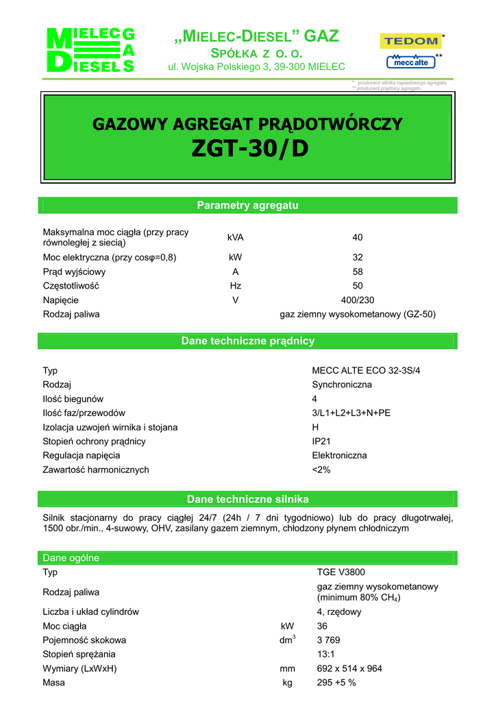 „MIELEC-DIESEL” GAZ * SPÓŁKA Z O. O. ** ul. Wojska Polskiego 3, 39-300 MIELEC * producent silnika napędowego agregatu ** producent prądnicy agregatu GAZOWY AGREGAT PRĄDOTWÓRCZY ZGT-30/D Parametry agregatu Maksymalna moc ciągła (przy pracy równoległej z siecią) kVA 40 Moc elektryczna (przy cosφ=0,8) kW 32 Prąd wyjściowy A 58 Częstotliwość Hz 50 Napięcie V 400/230 Rodzaj paliwa gaz ziemny wysokometanowy (GZ-50) Dane techniczne prądnicy Typ MECC ALTE ECO 32-3S/4 Rodzaj Synchroniczna Ilość biegunów 4 Ilość faz/przewodów 3/L1+L2+L3+N+PE Izolacja uzwojeń wirnika i stojana H Stopień ochrony prądnicy IP21 Regulacja napięcia Elektroniczna Zawartość harmonicznych <2% Dane techniczne silnika Silnik stacjonarny do pracy ciągłej 24/7 (24h / 7 dni tygodniowo) lub do pracy długotrwałej, 1500 obr./min., 4-suwowy, OHV, zasilany gazem ziemnym, chłodzony płynem chłodniczym Dane ogólne Typ TGE V3800 Rodzaj paliwa gaz ziemny wysokometanowy (minimum 80% CH4) Liczba i układ cylindrów 4, rzędowy Moc ciągła Pojemność skokowa kW dm 3 Stopień sprężania Wymiary (LxWxH) Masa 36 3 769 13:1 mm kg 692 x 514 x 964 295 +5 % Kolor RAL 5001 System chłodzenia Typ ciecz Płyn chłodzący Pojemność układu chłodzenia (w silniku) koncentrat – woda (50 : 50 %) dm 3 3 16 Wydajność pompy cieczy chłodzącej dm /min 48 Max. ciśnienie w układzie chłodzenia kPa 600 dm3 30 3 20 System smarowania Pojemność układu smarowania (z filtrem) Pojemność miski oleju dm Automatyczny system uzupełniania oleju silnikowego (z wbudowanym zbiornikiem) − opcja Układ dolotowy (napełnienia) Zapotrzebowanie powietrza przy 100% obciążeniu kg/h 104 Opory ssania przy zanieczyszczonym filtrze kPa max. 5 Typ filtra powietrza suchy System wydechu Ilość spalin 1). przy mocy nominalnej kg/h 93 Przeciwciśnienie na wydechu mbar max. 10 1). emisja zanieczyszczeń w spalinach spełnia normę TA-Luft 2002 System paliwowy Ciśnienie gazu na wejściu do agregatu Dopuszczalna temperatura gazu na wejściu do agregatu Wahania ciśnienia w trakcie pracy agregatu kPa 2 ÷ 10 °C 30 % max. 10 Zużycie paliwa gazowego 2). przy: - maksymalnej mocy ciągłej - 75% obciążeniu - 50% obciążeniu 2). mN3/h 10,2 3 8,2 3 6,2 mN /h mN /h ilość gazu mierzona w warunkach normalnych (15 °C; 101,3 25 kPa) System elektryczny Napięcie (minus na masie) V 12 kW 3,2 Rozrusznik: - moc Akumulator rozruchowy: - pojemność standardowa Alternator bezobsługowy Heavy-Duty Ah 205 brak (jest wbudowana automatyczna bezobsługowa ładowarka akumulatorów) Uruchamianie w niskich temperaturach Uruchamianie bez wstępnego podgrzewania ºC +10 Uruchamianie po wstępnym podgrzaniu silnika ogrzewaczem gazowym lub elektrycznym ºC -35 Wymiary i masa agregatu prądotwórczego*** *** wersja standard - obudowana, wyciszona, do pracy na zewnątrz, zapewniająca ochronę przed czynnikami atmosferycznymi (z blach stalowych ocynkowanych ogniowo, dodatkowo zabezpieczonych antykorozyjnie powłoką lakierniczą), bez odbioru ciepła Wymiary gabarytowe (LxWxH) Masa agregatu suchego mm kg 2400 x 1000 x 1700 1550 Uwagi: 1. Opcjonalnie istnieje możliwość m.in.: - dostosowania wymiarów gabarytowych agregatu do wymiarów pomieszczenia (w przypadku zabudowy agregatu w pomieszczeniu) - zabudowy agregatu w obudowie kontenerowej - przystosowania agregatu do odbioru energii cieplnej - montażu automatycznego systemu uzupełniania oleju silnikowego Groeneveld OilMaster - montażu ogrzewacza silnika (podgrzewanie układu wodnego silnika przed rozruchem w warunkach zimowych): elektrycznego HotStart lub gazowego Webasto. 2. Agregat nie zawiera instalacji przygotowania gazu ziemnego - wymaga zasilania oczyszczonym gazem ziemnym wysokometanowym (GZ-50) o wymaganym ciśnieniu, zapewnienie poprawnego zasilania leży po stronie Zamawiającego Odbiór mocy elektrycznej i energii cieplnej Odbiór mocy elektrycznej 400V/50 Hz z agregatu: - zaciski śrubowe M10 do przewodów z zaprasowanymi końcówkami oczkowymi rurowymi. Odbiór energii cieplnej 90/70 °C z agregatu (opcja) : - 2 x przyłącze G5/4”. DANE KONTAKTOWE Zdzisław Mizera Dyrektor ds. Marketingu i Kooperacji „Mielec-Diesel” Gaz Sp. z o.o. ul. Wojska Polskiego 3 39-300 Mielec tel. kom.: tel.: fax.: e-mail: 603 887 592 (17) 788 7592 wewn. 26 (17) 788 7075 [email protected] [email protected]