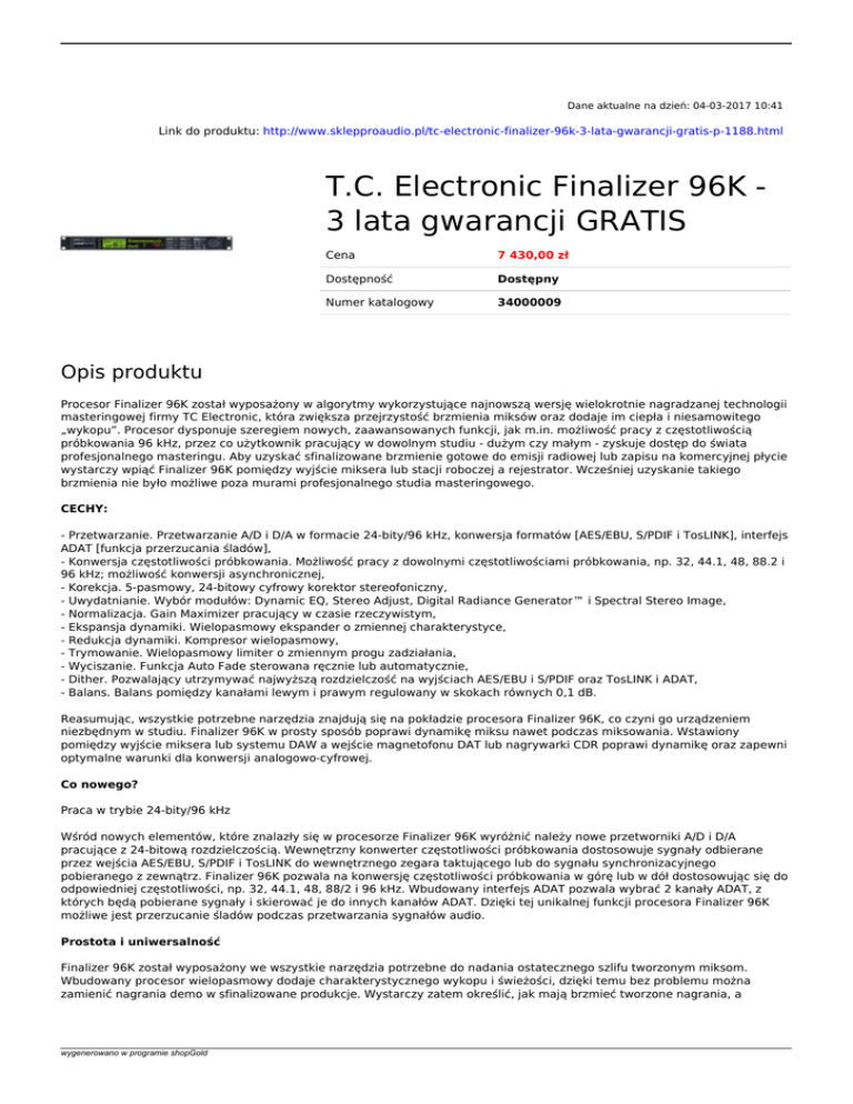 Dane aktualne na dzień: 04-03-2017 10:41 Link do produktu: http://www.sklepproaudio.pl/tc-electronic-finalizer-96k-3-lata-gwarancji-gratis-p-1188.html T.C. Electronic Finalizer 96K 3 lata gwarancji GRATIS Cena 7 430,00 zł Dostępność Dostępny Numer katalogowy 34000009 Opis produktu Procesor Finalizer 96K został wyposażony w algorytmy wykorzystujące najnowszą wersję wielokrotnie nagradzanej technologii masteringowej firmy TC Electronic, która zwiększa przejrzystość brzmienia miksów oraz dodaje im ciepła i niesamowitego „wykopu”. Procesor dysponuje szeregiem nowych, zaawansowanych funkcji, jak m.in. możliwość pracy z częstotliwością próbkowania 96 kHz, przez co użytkownik pracujący w dowolnym studiu - dużym czy małym - zyskuje dostęp do świata profesjonalnego masteringu. Aby uzyskać sfinalizowane brzmienie gotowe do emisji radiowej lub zapisu na komercyjnej płycie wystarczy wpiąć Finalizer 96K pomiędzy wyjście miksera lub stacji roboczej a rejestrator. Wcześniej uzyskanie takiego brzmienia nie było możliwe poza murami profesjonalnego studia masteringowego. CECHY: - Przetwarzanie. Przetwarzanie A/D i D/A w formacie 24-bity/96 kHz, konwersja formatów [AES/EBU, S/PDIF i TosLINK], interfejs ADAT [funkcja przerzucania śladów], - Konwersja częstotliwości próbkowania. Możliwość pracy z dowolnymi częstotliwościami próbkowania, np. 32, 44.1, 48, 88.2 i 96 kHz; możliwość konwersji asynchronicznej, - Korekcja. 5-pasmowy, 24-bitowy cyfrowy korektor stereofoniczny, - Uwydatnianie. Wybór modułów: Dynamic EQ, Stereo Adjust, Digital Radiance Generator™ i Spectral Stereo Image, - Normalizacja. Gain Maximizer pracujący w czasie rzeczywistym, - Ekspansja dynamiki. Wielopasmowy ekspander o zmiennej charakterystyce, - Redukcja dynamiki. Kompresor wielopasmowy, - Trymowanie. Wielopasmowy limiter o zmiennym progu zadziałania, - Wyciszanie. Funkcja Auto Fade sterowana ręcznie lub automatycznie, - Dither. Pozwalający utrzymywać najwyższą rozdzielczość na wyjściach AES/EBU i S/PDIF oraz TosLINK i ADAT, - Balans. Balans pomiędzy kanałami lewym i prawym regulowany w skokach równych 0,1 dB. Reasumując, wszystkie potrzebne narzędzia znajdują się na pokładzie procesora Finalizer 96K, co czyni go urządzeniem niezbędnym w studiu. Finalizer 96K w prosty sposób poprawi dynamikę miksu nawet podczas miksowania. Wstawiony pomiędzy wyjście miksera lub systemu DAW a wejście magnetofonu DAT lub nagrywarki CDR poprawi dynamikę oraz zapewni optymalne warunki dla konwersji analogowo-cyfrowej. Co nowego? Praca w trybie 24-bity/96 kHz Wśród nowych elementów, które znalazły się w procesorze Finalizer 96K wyróżnić należy nowe przetworniki A/D i D/A pracujące z 24-bitową rozdzielczością. Wewnętrzny konwerter częstotliwości próbkowania dostosowuje sygnały odbierane przez wejścia AES/EBU, S/PDIF i TosLINK do wewnętrznego zegara taktującego lub do sygnału synchronizacyjnego pobieranego z zewnątrz. Finalizer 96K pozwala na konwersję częstotliwości próbkowania w górę lub w dół dostosowując się do odpowiedniej częstotliwości, np. 32, 44.1, 48, 88/2 i 96 kHz. Wbudowany interfejs ADAT pozwala wybrać 2 kanały ADAT, z których będą pobierane sygnały i skierować je do innych kanałów ADAT. Dzięki tej unikalnej funkcji procesora Finalizer 96K możliwe jest przerzucanie śladów podczas przetwarzania sygnałów audio. Prostota i uniwersalność Finalizer 96K został wyposażony we wszystkie narzędzia potrzebne do nadania ostatecznego szlifu tworzonym miksom. Wbudowany procesor wielopasmowy dodaje charakterystycznego wykopu i świeżości, dzięki temu bez problemu można zamienić nagrania demo w sfinalizowane produkcje. Wystarczy zatem określić, jak mają brzmieć tworzone nagrania, a wygenerowano w programie shopGold Finalizer 96K pozwoli uzyskać to brzmienie. Jeśli preferujesz korzystanie z zewnętrznych urządzeń i upierasz się przy ich wykorzystaniu, Finalizer 96K daje możliwość podłączenia ich z wykorzystaniem wejść analogowych lub cyfrowych w formatach AES/EBU, S/PDIF lub TosLINK. Istnieje ponadto możliwość wstawiania wewnętrznych efektów. Jest to przydatne choćby w przypadku chęci ustawienia korekcji jeszcze przed kompresją sygnału. Funkcje analizatora Finalizer 96K został wyposażony w rozbudowane i niezwykle użyteczne możliwości analizy sygnałów. Znajdziemy tu: miernik korelacji fazy, miernik poziomu, miernik z funkcją zapamiętywania wartości szczytowych oraz wskaźnik statusu wejść i wyjść cyfrowych. Ponadto ulokowano tu generator sygnałów kalibracyjnych. Prostota przede wszystkim Wewnątrz procesora Finalizer 96K zawarto popularną funkcję Wizard, która natychmiast oblicza optymalne ustawienia parametrów do uzyskania jak najlepszego brzmienia przetwarzanego materiału audio. Bardziej zaawansowani użytkownicy mogą dopracowywać ustawienia korzystając z ponad 90 dostępnych parametrów. Co ważne, wszystkie funkcje urządzenia mogą być monitorowane z pomocą wyświetlacza LCD i siedmiu precyzyjnych mierników LED. Dithering Podczas przesyłania sygnałów cyfrowych bardzo ważnym elementem wpływającym na jakość dźwięku jest dithering. Wykorzystuje się go w celu minimalizacji zniekształceń, które pojawiają się w procesie zmiany rozdzielczości bitowej z większej na mniejszą [np. podczas konwersji z 24- do 16-bitów]. Sygnały wysyłane przez Finalizer 96K cechują się 24-bitową rozdzielczością. Jeśli zatem urządzenie odbiorcze pracuje z mniejszą rozdzielczością konieczne staje się zastosowanie dithera. Finalizer 96K pozwala zastosować dither z przedziału 8 - 22-bitów. Nieskorelowany dither stosuje się w przypadku sygnałów stereofonicznych o małym poziomie; w przypadku sygnałów mono stosuje się dither skorelowany. W przypadku sygnałów nieokreślonych najlepiej stosować dither inwersyjny. Próbkowanie Finalizer 96K dysponuje możliw