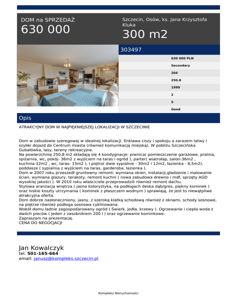 Szczecin, Osów, ks. Jana Krzysztofa Kluka DOM na SPRZEDAŻ 630 000 300 m2 303497 630 000 PLN Secondary 204 250.8 1999 2 5 Good Opis ATRAKCYJNY DOM W NAJPIĘKNIEJSZEJ LOKALIZACJI W SZCZECINIE Dom w zabudowie szeregowej w idealnej lokalizacji. Enklawa ciszy i spokoju a zarazem łatwy i szybki dojazd do Centrum miasta (również komunikacją miejską). W pobliżu Szczecińska Gubałówka, lasy, tereny rekreacyjne. Na powierzchnię 250,8 m2 składają się 4 kondygnacje: piwnica( pomieszczenie garażowe, pralnia, spiżarnia, wc, pokój- 36m2 z wyjściem na taras i ogród ), parter( wiatrołap, salon-36m2 , kuchnia-12m2 , wc, taras- 15m2 ), I piętro( dwie sypialnie - 30m2 i 12m2, łazienka - 6,5m2), poddasze ( sypialnia z wyjściem na taras, garderoba, łazienka ). Dom w 2007 roku przeszedł gruntowny remont: wymiana okien, instalacji,gładzenie i malowanie ścian, wymiana glazury, terakoty, remont kuchni ( nowa zabudowa drewno i mdf, sprzęty AGD wysokiej jakości ). W 2010 roku właściciele przeprowadzili również remont dachu. Stylowa aranżacja wnętrza ( jasna kolorystyka, na podłogach deska dąb/gres, piękny kominek ) oraz niskie koszty utrzymania ( kominek z płaszczem wodnym ) sprawiają, że jest to niewątpliwe atrakcyjna oferta. Dom dobrze nasłoneczniony, jasny, z szeroką klatką schodową również z oknami, schody sosnowe, na piętrze również podłoga sosnowa cyklinowana. Wokół domu ładnie zagospodarowany ogród ( Świerk, jodła, krzewy ). Ogrzewanie i ciepła woda z dwóch pieców ( jeden z zasobnikiem 200 l ) oraz ogrzewanie kominkowe. Zapraszam na prezentację. CENA DO NEGOCJACJI Jan Kowalczyk tel. 501-165-664 email: [email protected] Kompleks Nieruchomości Powered by TCPDF (www.tcpdf.org)