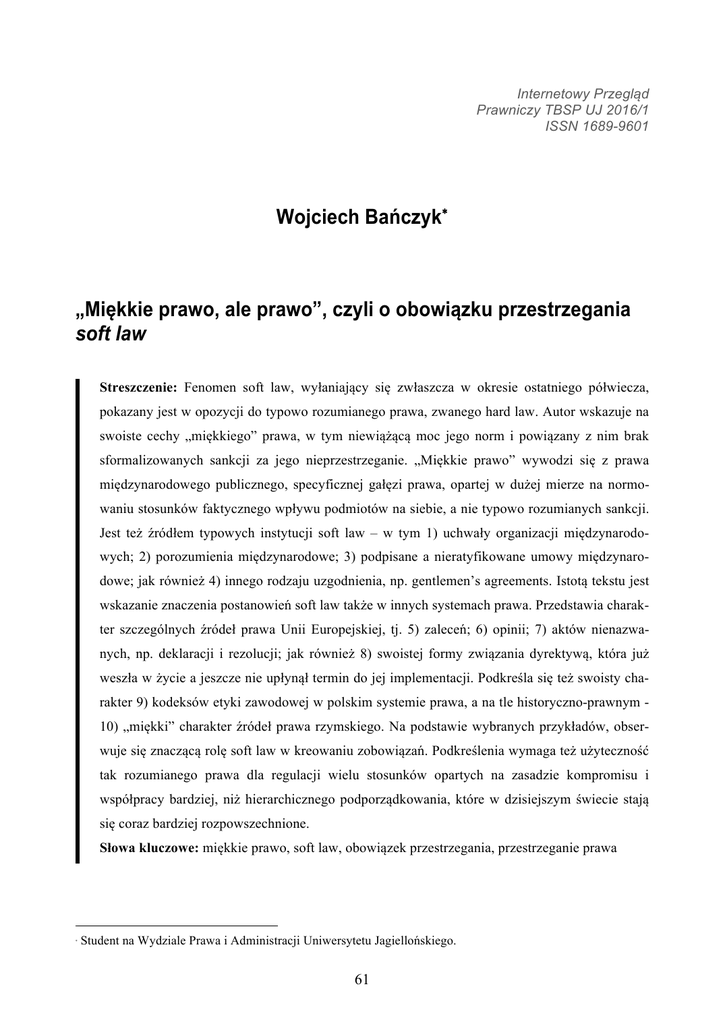 Internetowy Przegląd Prawniczy TBSP UJ 2016/1 ISSN 1689-9601 Wojciech Bańczyk∗ „Miękkie prawo, ale prawo”, czyli o obowiązku przestrzegania soft law Streszczenie: Fenomen soft law, wyłaniający się zwłaszcza w okresie ostatniego półwiecza, pokazany jest w opozycji do typowo rozumianego prawa, zwanego hard law. Autor wskazuje na swoiste cechy „miękkiego” prawa, w tym niewiążącą moc jego norm i powiązany z nim brak sformalizowanych sankcji za jego nieprzestrzeganie. „Miękkie prawo” wywodzi się z prawa międzynarodowego publicznego, specyficznej gałęzi prawa, opartej w dużej mierze na normowaniu stosunków faktycznego wpływu podmiotów na siebie, a nie typowo rozumianych sankcji. Jest też źródłem typowych instytucji soft law – w tym 1) uchwały organizacji międzynarodowych; 2) porozumienia międzynarodowe; 3) podpisane a nieratyfikowane umowy międzynarodowe; jak również 4) innego rodzaju uzgodnienia, np. gentlemen’s agreements. Istotą tekstu jest wskazanie znaczenia postanowień soft law także w innych systemach prawa. Przedstawia charakter szczególnych źródeł prawa Unii Europejskiej, tj. 5) zaleceń; 6) opinii; 7) aktów nienazwanych, np. deklaracji i rezolucji; jak również 8) swoistej formy związania dyrektywą, która już weszła w życie a jeszcze nie upłynął termin do jej implementacji. Podkreśla się też swoisty charakter 9) kodeksów etyki zawodowej w polskim systemie prawa, a na tle historyczno-prawnym 10) „miękki” charakter źródeł prawa rzymskiego. Na podstawie wybranych przykładów, obserwuje się znaczącą rolę soft law w kreowaniu zobowiązań. Podkreślenia wymaga też użyteczność tak rozumianego prawa dla regulacji wielu stosunków opartych na zasadzie kompromisu i współpracy bardziej, niż hierarchicznego podporządkowania, które w dzisiejszym świecie stają się coraz bardziej rozpowszechnione. Słowa kluczowe: miękkie prawo, soft law, obowiązek przestrzegania, przestrzeganie prawa ∗ Student na Wydziale Prawa i Administracji Uniwersytetu Jagiellońskiego. 61 1. Wprowadzenie Nietrudno zauważyć, że współczesne prawo pod wieloma względami znacząco różni się od tradycyjnie rozumianego lex, które stało się podstawą rozważań filozoficznoprawnych XIX w. i które do dziś stanowi podstawę dogmatycznej oraz systematycznej analizy porządku prawnego. Przede wszystkim prawo XXI w. nie jest już tak ustrukturyzowane, a wywodzi swoje źródła z różnych systemów normatywnych, które, nierzadko nieczytelnie, wpływają na to, co nazywamy prawem obowiązującym. Na tle licznych dualizmów prawnych powstałych pod kątem analizy jego pochodzenia (w tym kwestii prawa naturalnego i stanowionego; międzynarodowego oraz krajowego; wreszcie multicentryczności systemu, w którym obowiązujące jest prawo krajowe, międzynarodowe, jak również stanowione przez organy Unii Europejskiej), w ostatnim półwieczu, na zgoła odmiennej płaszczyźnie badania prawa, wyłoniła się jego nowa dwoistość. W opozycji do norm tradycyjnie wiążących i których nieprzestrzeganie jest sankcjonowane (zatem do niejako typowo pojmowanego prawa – hard law) ukazał się fenomen soft law, przy czym sama idea porządku prawnego tego rodzaju była obecna już wieki wcześniej. Tak swoiście ukształtowane prawo nie posiada mocy wiążącej, a w związku z tym jego nieprzestrzeganie nie jest powiązane ze sformalizowanymi sankcjami. Należy bowiem odróżnić od niego prawo wiążące, które jednak nie posiada sankcji za swoje nieprzestrzeganie – lex imperfecta. Soft law, pozostając usytuowane wręcz na granicy pojęcia prawa, nie posiadając jego 1 charakterystycznej cechy , jest przedmiotem wielu rozważań teoretycznoprawnych. Niniejszy artykuł wskaże przede wszystkim na praktyczne skutki jego istnienia oraz przeanalizuje jego realną odrębność od hard law. Na przykładach z różnych systemów prawnych pragnę wskazać, w jaki sposób „miękkie prawo” obliguje podmioty do przestrzegania swoich postanowień. 2. Pojęcie soft law Soft law, choć zdaje się nie być prawem, stanowi na tyle ważny element porządku 2 prawnego, że należy zwrócić na niego uwagę . Czasem klasyfikuje się je również jako źró- 1 2 W. Slowmason, Fundamental perspectives on international law, Boston 2011, p. 13. M. Shaw, Prawo międzynarodowe, Warszawa 2006, s. 77. 62 3 dło prawa międzynarodowego, zawsze wskazując jednak na jego wyjątkowość . Jego specyfika polega na tym, że wywodzi swój byt nie tyle ze sformalizowanych, władczych procedur legislacyjnych i obecności zinstytucjonalizowanego przymusu w razie jego nieprzestrzegania (charakterystycznych dla typowo rozumianego prawa), ale ze swoistego kompromisu, 4 zgody podmiotów, z którymi wiąże się chęć związania jego postanowieniami . Fakt, że muszą one wykazać wolę takiego podporządkowania, stanowi argument zarówno na korzyść, jak również przeciwko „miękkiemu prawu”. Z pewnością jest ono postrzegane jako bliższe (bo nie narzucone) i może być chętniej przestrzegane; przy czym z istotnym niebezpieczeństwem zarzucenia chęci takiego związania, kiedy nie będzie ono już korzystne. Ten, jakkolwiek oczywiście prawdziwy, argument może być odparty pewnym truizmem, że nawet usankcjonowane prawo nie zawsze jest przestrzegane. Pewnego rodzaju obowiązek poszanowania soft law – czy to wywodzony z autorytetu organu stanowiącego, z honorowego charakteru takiego związania, z sankcji za nieprzestrzeganie norm samodzielnie ustalonych przez podmioty je tworzące, czy za sprawą faktycznego wpływu innych podporządkowanych podmiotów – może być też daleko skuteczniejszy od często tylko teoretycznych sankcji. Będzie to miało miejsce zwłaszcza w systemach prawnych wolnych od obecności typowego aparatu przymusu. Biorąc pod uwagę swoisty proces powstawania „miękkiego prawa”, także tryb jego zmiany jest znacząco ułat