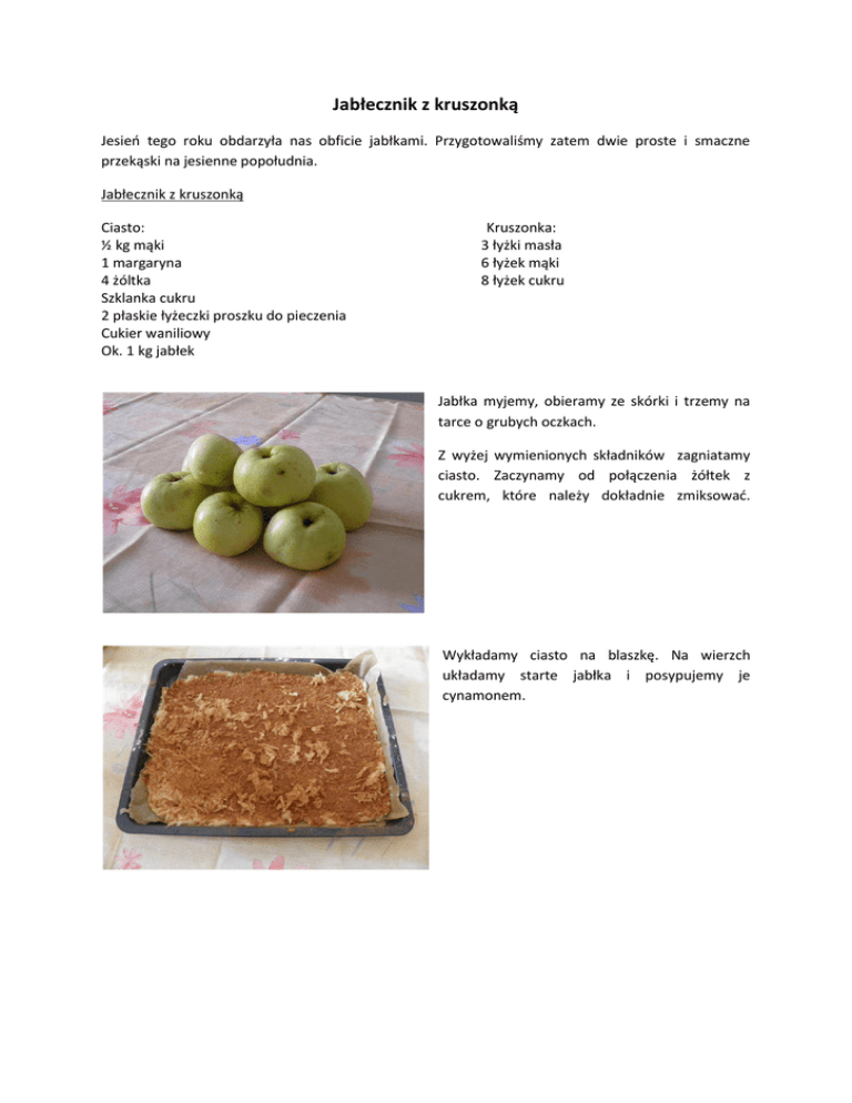 Jabłecznik z kruszonką Jesień tego roku obdarzyła nas obficie jabłkami. Przygotowaliśmy zatem dwie proste i smaczne przekąski na jesienne popołudnia. Jabłecznik z kruszonką Ciasto: ½ kg mąki 1 margaryna 4 żóltka Szklanka cukru 2 płaskie łyżeczki proszku do pieczenia Cukier waniliowy Ok. 1 kg jabłek Kruszonka: 3 łyżki masła 6 łyżek mąki 8 łyżek cukru Jabłka myjemy, obieramy ze skórki i trzemy na tarce o grubych oczkach. Z wyżej wymienionych składników zagniatamy ciasto. Zaczynamy od połączenia żółtek z cukrem, które należy dokładnie zmiksować. Wykładamy ciasto na blaszkę. Na wierzch układamy starte jabłka i posypujemy je cynamonem. Na jabłka i cynamon wykładamy przygotowaną wcześniej kruszonkę. Ciasto pieczemy w temperaturze 180 stopni przez około 35 - 40 minut. Gotowe ciasto wykładamy na talerzyk. Dla smakoszy polecam dodać do niego gałkę lodu i bitą śmietanę. Pychotka!! SMACZNEGO
