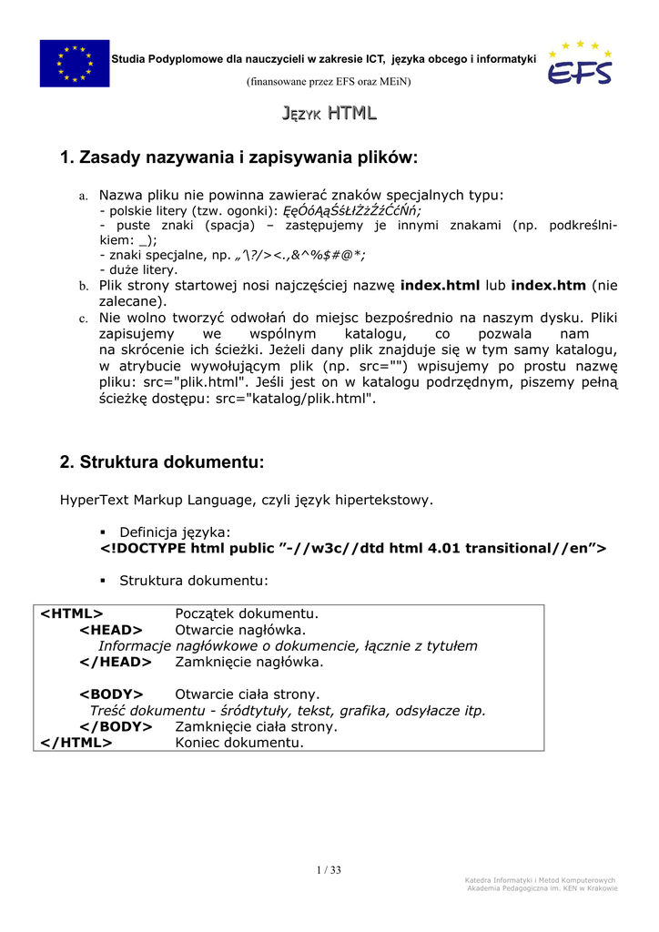 Studia Podyplomowe dla nauczycieli w zakresie ICT, języka obcego i informatyki (finansowane przez EFS oraz MEiN) JĘZYK HTML 1. Zasady nazywania i zapisywania plików: a. Nazwa pliku nie powinna zawierać znaków specjalnych typu: - polskie litery (tzw. ogonki): ĘęÓ󥹌śŁłŻżŹźĆćŃń; - puste znaki (spacja) – zastępujemy je innymi znakami (np. podkreślnikiem: _); - znaki specjalne, np. „’\?/><.,&^%$#@*; - duże litery. b. Plik strony startowej nosi najczęściej nazwę index.html lub index.htm (nie zalecane). c. Nie wolno tworzyć odwołań do miejsc bezpośrednio na naszym dysku. Pliki zapisujemy we wspólnym katalogu, co pozwala nam na skrócenie ich ścieżki. Jeżeli dany plik znajduje się w tym samy katalogu, w atrybucie wywołującym plik (np. src="") wpisujemy po prostu nazwę pliku: src="plik.html". Jeśli jest on w katalogu podrzędnym, piszemy pełną ścieżkę dostępu: src="katalog/plik.html". 2. Struktura dokumentu: HyperText Markup Language, czyli język hipertekstowy. Definicja języka: <!DOCTYPE html public ”-//w3c//dtd html 4.01 transitional//en”> Struktura dokumentu: <HTML> Początek dokumentu. <HEAD> Otwarcie nagłówka. Informacje nagłówkowe o dokumencie, łącznie z tytułem </HEAD> Zamknięcie nagłówka. <BODY> Otwarcie ciała strony. Treść dokumentu - śródtytuły, tekst, grafika, odsyłacze itp. </BODY> Zamknięcie ciała strony. </HTML> Koniec dokumentu. 1 / 33 Katedra Informatyki i Metod Komputerowych Akademia Pedagogiczna im. KEN w Krakowie Studia Podyplomowe dla nauczycieli w zakresie ICT, języka obcego i informatyki (finansowane przez EFS oraz MEiN) JĘZYK HTML • Nagłówek <HEAD></HEAD> a) Standart kodowania polskich liter: <META http-equiv=”content-type” content=”text/html; charset=iso8859-2”> <META http-equiv=”content-type” content=”text/html; charset=windows-1250”> (nie zalecane!) b) <TITLE> tytuł strony, który ukazuje się w belce tytułowej przeglądarki </TITLE> Nie należy używać w tytułach samych WIELKICH LITER ani wpisywać adresów internetowych, ponieważ niektóre przeglądarki mogą to zignorować. Należy podawać jako tytuł informacje rzeczywiste o tym co znajduje się na stronie unikając ogólników. c) <META NAME ="Description" CONTENT="Opis treści znajdującej się na stronie"> Jest to opis zawartości strony, który osoba posługująca się wyszukiwarką zobaczy pod tytułem strony. d) <META NAME="Keywords" CONTENT="wyrazy, kluczowe, oddzielone, przecinkami"> Nie powinno się powtarzać słów, ponieważ wyszukiwarki mogą potraktować stroną jako spam. Nie należy przekraczać 1000 słów. e) <META HTTP-EQUIV="Content-Language" CONTENT="pl"> Zdefiniowanie języka (kraju) strony. Przeglądarki używają tego polecenia wyszukując strony stworzone w danym języku. pl Język polski en Język angielski de Język niemiecki fr Język francuski en- Język us „amerykański” f) <META NAME="Author" CONTENT="imię i nazwisko"> Informacje o autorze strony. g) <META HTTP-EQUIV="Creation-date" CONTENT="Sun, 21 Nov 2004 13:30:01 GMT"> Data stworzenia strony. h) <META HTTP-EQUIV="Reply-to" CONTENT="[email protected]"> Adres e-mail autora strony. i) <META NAME="Generator" CONTENT="nazwa generatora"> Edytor HTML, przy pomocy którego utworzono stronę. Często jest to informacja generowana automatycznie przez edytory. 2 / 33 Katedra Informatyki i Metod Komputerowych Akademia Pedagogiczna im. KEN w Krakowie Studia Podyplomowe dla nauczycieli w zakresie ICT, języka obcego i informatyki (finansowane przez EFS oraz MEiN) JĘZYK HTML j) <META NAME="Refresh" CONTENT="wartość (co ile sekund strona ma być odświeżana)"> Narzucenie przeglądarce częstotliwości odświeżania strony. Polecenie to nie jest zalecane. <META NAME="Refresh" CONTENT="5; url=http://www.onet.pl"> Przekierowanie strony na inny adres. W przykładzie po 5 sekundach nastąpi przekierowanie na stronę Onetu. • Polecenia <BODY></BODY> Polecenia należy domykać w odwrotnej kolejności niż ta wg, której się pojawiały. Odpowiada to matematycznej notacji nawiasów: {poziom 3 [poziom 2 (poziom 1) poziom 2] poziom 3}, czyli przykładowo: poziom 3 poziom 2 poziom 1 poziom 2 poziom 3, będzie odpowaiadało zapisowi: <u> poziom 3 <i> poziom 2 <b>poziom 1</b> poziom 2</i> poziom 3</u>. a) Czcionka. <znacznik atrybut=”wartość”> Opis <B> tekst </B> <I> tekst </I> <U> tekst </U> <S> tekst </S> <STRIKE> tekst </STRIKE> <SUB> tekst </SUB> <SUP> tekst </SUP> Tekst pogrubiony. Tekst pochylony (kursywa). Tekst podkreślony. Tekst przekreślony. Subskrypt – czcionka w dolnym . indeksie Superskrypt – czcionka w górnym . Tekst przeformatowany, czyli tekst, w którym wszystkie znaki mają taką samą wielkość. Przykładowo można w nim wstawiać wielokrotne spacje. Pisany jest najczęściej czcionką Fourier New. Numerowanie (każdy nowy punkt zaczynamy przez <LI>). Zdefiniowanie typu numeracji: type=”1” 1. 2. 3. type=”a” a. b. c. type=”A” A. B. C. type=”i” i. ii. iii. type=”I” I. II. III. indeksie <PRE> tekst </PRE> <OL> kolejne punkty </OL> <OL type=” wartość parametru”> > kolejne punkty </OL> <OL start=”wartość”> kolejne punkty </OL> Numerowanie rozpoczynające się od określonej wartości. <UL> kolejne podpunkty </UL> Punktory (każdy nowy podpunkt zaczynamy przez <LI>). 3 / 33 Katedra Informatyki i Metod Komputerowych Akademia Pedagogiczna im. KEN w Krakowie Studia Podyplomowe dla nauczycieli w zakresie ICT, języka obcego i informatyki (finansowane przez EFS oraz MEiN) JĘZYK HTML Zdefiniowanie typu punktora: • • o <UL type=” wartość parametru”> kolejne podpunkty </UL> DISC SQUARE CIRCLE Zmiana rozmiaru czcionki. Skala: 1-7. Domyślna wartość wynosi 3, co odpowiada w zależności od przeglądarki czcionce około 10-12 pkt. <FONT size=”rozmiar”> tekst </FONT> <FONT size=”+/-rozmiar”> tekst </FONT> <BASEFONT size=”wartość”> <FONT size=”normal”> tekst <SMALL> tekst