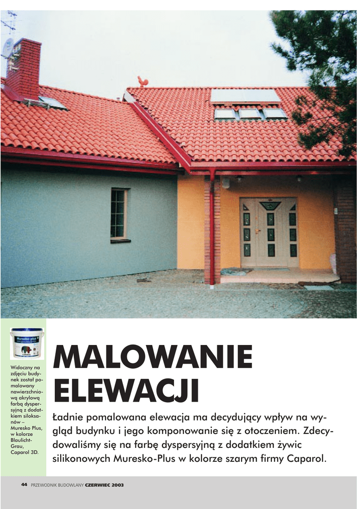 Widoczny na zdj´ciu budynek zosta∏ pomalowany nawierzchniowà akrylowà farbà dyspersyjnà z dodatkiem siloksanów – Muresko Plus, w kolorze BlaulichtGrau, Caparol 3D. MALOWANIE ELEWACJI ¸adnie pomalowana elewacja ma decydujàcy wp∏yw na wyglàd budynku i jego komponowanie si´ z otoczeniem. ZdecydowaliÊmy si´ na farb´ dyspersyjnà z dodatkiem ˝ywic silikonowych Muresko-Plus w kolorze szarym firmy Caparol. 44 PRZEWODNIK BUDOWLANY CZERWIEC 2003 M AT E R I A ¸Y I T E C H N O L O G I E W budynku wznoszonym w ramach naszej akcji „Praktyka na Budowie” zdecydowaliÊmy si´ na wykonanie elewacji z tynku cienkowarstwowego nak∏adanego na system ociepleniowy. Uk∏adanie ocieplenia metodà lekkà-mokrà opisywaliÊmy w numerze 9/2002. FARBA NA KA˚DÑ ÂCIAN¢ TYNK MALOWANY CZY BARWIONY W MASIE Teraz stan´liÊmy przed problemem czy wybraç tynk bar wiony w masie czy te˝ bia∏y, malowany póêniej farbà. Wi´kszoÊç doradców technicznych firm produkujàcych farby elewacyjne zwraca∏a uwag´ na funkcjonalnoÊç rozwiàzania drugiego – czyli malowanie tynku farbà. Uzasadniali to tym, ˝e tynk bar wiony w masie mo˝e czasami ró˝niç si´ odcieniami – w zale˝noÊci od tego czy np. cz´Êç opakowaƒ by∏a wystawiona na d∏ugotr wa∏e dzia∏anie s∏oƒca. MURESKO-PLUS to dyspersyjna farba elewacyjna z dodatkiem ˝ywic silikonowych. Dodatek ten powoduje wysokà przepuszczalnoÊç pow∏ok dla pary wodnej i CO2 oraz hydrofobowoÊç pow∏ok (nieprzepuszczalnoÊç dla wody). Pow∏oki z farby MURESKO-PLUS sà bardzo odporne na wp∏ywy atmosferyczne i szkodliwe czynniki z zanieczyszczonego powietrza. D∏ugo zachowujà czystoÊç, sà d∏ugotrwa∏e i bardzo dobrze przyczepne do pod∏o˝y. Przed malowaniem nale˝y pod∏o˝e zagruntowaç. WydajnoÊç farby Muresko-Plus wynosi 7 l. przy jednokrotnym malowaniu (zalecane jest malowanie 2-krotne). Farba daje kryjàcà matowà pow∏ok´ dost´pnà w ponad 16 000 kolorach. ➧ 1. Opakowanie dostarczone przez producenta pozwala nam na ∏atwy transport i bezproblemowe otwieranie przykrywki. 2. Farb´ mo˝emy rozcienczyç wodà maksymalnie w proprocji 10:1 – woda musi byç czysta. Mieszamy za pomocà mieszalnika bardzo dok∏adnie. 3. Mieszanie farby to bardzo wa˝na czynnoÊç przy malowaniu – jeÊli widzimy, ˝e robotnik miesza farb´ patykiem czy kawa∏kiem ga∏´zi to zrezygnujmy z jego us∏ug. Najlepiej zrobiç to odpowiednim mieszad∏em. CZERWIEC 2003 PRZEWODNIK BUDOWLANY 45 4. Wa˝nà rzeczà jest zabezpieczenie okien i drzwi przed pochlapaniem farbà. Zastosowana przez nas farba nawet na drugi dzieƒ by∏a doÊç ∏atwa do usuni´cia. 5. Pierwszà pracà przy malowaniu ca∏ej elewacji jest pomalowanie miejsc, do których nie dojdziemy wa∏kiem. 6. Musimy pami´taç o zaklejeniu podsufitki tak aby jej nie zabrudziç – wyglàda to póêniej bardzo nieelegancko. WYBÓR KOLORU Nasz dom usytuowaliÊmy w terenie doÊç intensywnie zalesionym. ChcieliÊmy aby budynek komponowa∏ si´ z otoczeniem – dlatego nie braliÊmy pod uwag´ pastelowych kolorów. Z drugiej strony naszym zamiarem by∏o wyró˝nienie elewacji – zdecydowaliÊmy si´ na kolor szary. Kolor ten nie jest cz´sto stosowany ze wzgl´du na to, ˝e kojarzy si´ z budynkiem niewykoƒczonym. Du˝o takich „maszkaronek” powsta∏o na poczàtku lat 90-tych i na ich widok zwykle nasuwa si´ myÊl, ˝e inwestorowi zabrak∏o pieni´dzy czy ch´ci, aby dom dokoƒczyç. ELEGANCKA SZAROÂå 7. Tak wyglàda wa∏ek do malowania – 8. W czasie upa∏ów malowanie wykopo skoƒczonej pracy myjemy go w wo- nujemy rano lub pod wieczór, kiedy s∏oƒce nie operuje mocno i temperatudzie. ra nie jest wysoka. 46 PRZEWODNIK BUDOWLANY CZERWIEC 2003 Jednak kolor szary wcale nie musi byç brzydki. W nowym, ∏adnie zaprojektowanym i wykoƒczonym M AT E R I A ¸Y I T E C H N O L O G I E budynku, przyciàga uwag´ jako kolor rzadko spotykany, a jednoczeÊnie elegancki. Poza tym dost´pnych jest wiele odcieni szaroÊci – to spore pole do popisu dla projektanta. Szara farba elewacyjna w naszym budynku równie˝ doda∏a mu elegancji oraz troch´ zamaskowa∏a w otoczeniu lasu. Budynek nie atakuje swojà obecnoÊcià. Równie˝ stolarka okienna i drzwiowa oraz bramy gara˝owe zosta∏y zamówione w kolorze szarym – choç w innym odcieniu – i doskonale komponujà si´ z ca∏ym budynkiem. Stonowana elewacja stanowi te˝ przeciwieƒstwo do wn´trza domu, gdzie ka˝de pomieszczenie ma swojà bar w´: kolor lawendowy i ró˝owy w sypialniach, piaskowy w salonie i z∏oty w wiatro∏apie – oczywiÊcie dobór kolorów w pomieszczeniach to sprawa indywidualna. DOBÓR FARBY I MALOWANIE Rodzaj u˝ytej farby elewacyjnej nie jest bez znaczenia dla jakoÊci efektu koƒcowego. Poniewa˝ ocieplenie naszego budynku wykonane jest z we∏ny mineralnej – do tego systemu zalecana jest farba dobrze przepuszczajàca par´ wodnà, czyli umo˝liwiajàca tzw. „oddychanie” Êciany. Mo˝na nià malowaç Êwie˝e mineralne tynki cienkowarstowe – ju˝ po up∏ywie 48 godzin (choç lepiej zaczekaç d∏u˝ej). Malowanie elewacji, choç wydawa∏oby si´ czynnoÊcià prostà, wymaga jednak pewnej wprawy i znajomoÊci techniki malarskiej. Przy malowaniu Êcian zewn´trznych wa˝ne jest aby by∏o dokonywane przy odpowiednich warunkach atmosferycznych – nie mo˝e byç zbyt wilgotno, ale tak˝e intensywne nas∏onecznienie sprawi, ˝e warstwa koloru b´dzie nierówna, powstanà wyraêne zacieki. Nale˝y wziàç pod uwag´ równie˝ dobór koloru – wzorniki odbiegajà nieznacznie od rzeczywistego efektu, ze wzgl´du na inny materia∏ stosowany jako podk∏ad do ich druku. Cz´sto jest tak, ˝e osiàgni´ty kolor jest jaÊniejszy od zamierzonego. Sà równie˝ kolory, które trudno si´ „maluje” na du˝ych powierzchniach. Nale˝à do nich szary, zielony i niebieski. Kolory jasne sà zwykle bezproblemowe. Innà sprawà jest dok∏adne stosowanie si´ do zaleceƒ producenta