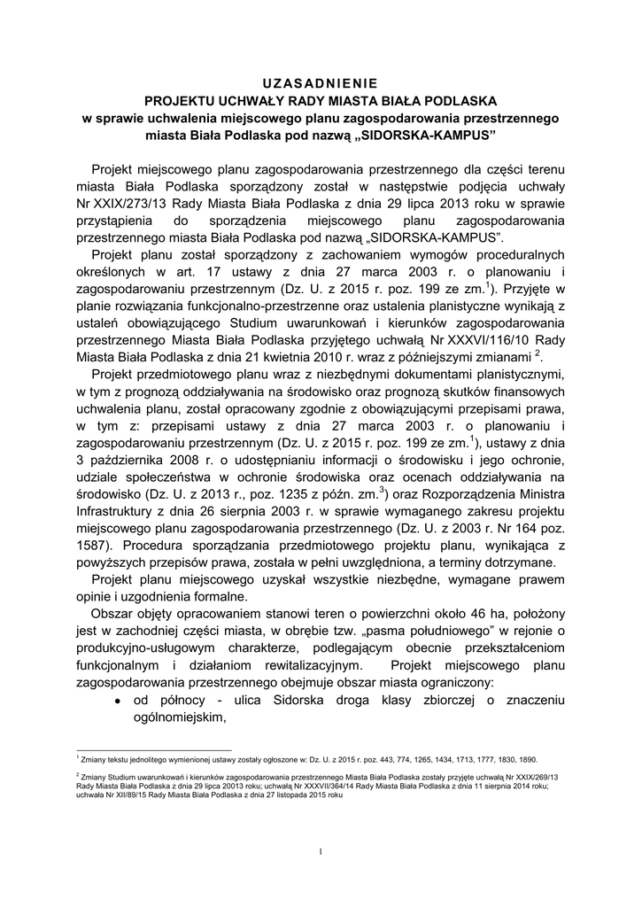 U Z AS A D N I E N I E PROJEKTU UCHWAŁY RADY MIASTA BIAŁA PODLASKA w sprawie uchwalenia miejscowego planu zagospodarowania przestrzennego miasta Biała Podlaska pod nazwą „SIDORSKA-KAMPUS” Projekt miejscowego planu zagospodarowania przestrzennego dla części terenu miasta Biała Podlaska sporządzony został w następstwie podjęcia uchwały Nr XXIX/273/13 Rady Miasta Biała Podlaska z dnia 29 lipca 2013 roku w sprawie przystąpienia do sporządzenia miejscowego planu zagospodarowania przestrzennego miasta Biała Podlaska pod nazwą „SIDORSKA-KAMPUS”. Projekt planu został sporządzony z zachowaniem wymogów proceduralnych określonych w art. 17 ustawy z dnia 27 marca 2003 r. o planowaniu i zagospodarowaniu przestrzennym (Dz. U. z 2015 r. poz. 199 ze zm.1). Przyjęte w planie rozwiązania funkcjonalno-przestrzenne oraz ustalenia planistyczne wynikają z ustaleń obowiązującego Studium uwarunkowań i kierunków zagospodarowania przestrzennego Miasta Biała Podlaska przyjętego uchwałą Nr XXXVI/116/10 Rady Miasta Biała Podlaska z dnia 21 kwietnia 2010 r. wraz z późniejszymi zmianami 2. Projekt przedmiotowego planu wraz z niezbędnymi dokumentami planistycznymi, w tym z prognozą oddziaływania na środowisko oraz prognozą skutków finansowych uchwalenia planu, został opracowany zgodnie z obowiązującymi przepisami prawa, w tym z: przepisami ustawy z dnia 27 marca 2003 r. o planowaniu i zagospodarowaniu przestrzennym (Dz. U. z 2015 r. poz. 199 ze zm.1), ustawy z dnia 3 października 2008 r. o udostępnianiu informacji o środowisku i jego ochronie, udziale społeczeństwa w ochronie środowiska oraz ocenach oddziaływania na środowisko (Dz. U. z 2013 r., poz. 1235 z późn. zm.3) oraz Rozporządzenia Ministra Infrastruktury z dnia 26 sierpnia 2003 r. w sprawie wymaganego zakresu projektu miejscowego planu zagospodarowania przestrzennego (Dz. U. z 2003 r. Nr 164 poz. 1587). Procedura sporządzania przedmiotowego projektu planu, wynikająca z powyższych przepisów prawa, została w pełni uwzględniona, a terminy dotrzymane. Projekt planu miejscowego uzyskał wszystkie niezbędne, wymagane prawem opinie i uzgodnienia formalne. Obszar objęty opracowaniem stanowi teren o powierzchni około 46 ha, położony jest w zachodniej części miasta, w obrębie tzw. „pasma południowego” w rejonie o produkcyjno-usługowym charakterze, podlegającym obecnie przekształceniom funkcjonalnym i działaniom rewitalizacyjnym. Projekt miejscowego planu zagospodarowania przestrzennego obejmuje obszar miasta ograniczony: od północy - ulica Sidorska droga klasy zbiorczej o znaczeniu ogólnomiejskim, 1 Zmiany tekstu jednolitego wymienionej ustawy zostały ogłoszone w: Dz. U. z 2015 r. poz. 443, 774, 1265, 1434, 1713, 1777, 1830, 1890. 2 Zmiany Studium uwarunkowań i kierunków zagospodarowania przestrzennego Miasta Biała Podlaska zostały przyjęte uchwałą Nr XXIX/269/13 Rady Miasta Biała Podlaska z dnia 29 lipca 20013 roku; uchwałą Nr XXXVII/364/14 Rady Miasta Biała Podlaska z dnia 11 sierpnia 2014 roku; uchwała Nr XII/89/15 Rady Miasta Biała Podlaska z dnia 27 listopada 2015 roku 1 od południa – linia kolejowa nr 2 Warszawa-Terespol wraz z licznymi rozjazdami, rozległą bocznicą kolejową sięgającą do dzielnicy Sidorki, terenami i obiektami obsługi infrastruktury kolejowej oraz obiektami kontroli ruchu kolejowego, Na analizowanych terenach obowiązują obecnie ustalenia zmiany miejscowego planu zagospodarowania przestrzennego miasta Biała Podlaska przyjętej Uchwałą Nr VIII/83/99 Rady Miejskiej Biała Podlaska z dnia 31 sierpnia 1999 r. w sprawie uchwalenia. (Dz.Urz. Województwa Lubelskiego nr 57, poz. 1400). Zgodnie z obowiązującym Studium uwarunkowań i kierunków zagospodarowania przestrzennego miasta Biała Podlaska teren ten został przeznaczony pod dominujące funkcje aktywności gospodarczej, tj. pod zabudowę usługową, produkcyjną, składową i magazynową. Funkcje uzupełniające na terenach aktywności gospodarczej zapisane w w/w dokumencie to: usługi komercyjne, obiekty nauki, obiekty wystawiennicze i ekspozycyjne, obiekty użyteczności publicznej (w tym wyższe uczelnie), tereny zieleni urządzonej. SPOSÓB REALIZACJI WYMOGÓW WYNIKAJĄCYCH Z ART. 1 UST. 2-4 USTAWY O PLANOWANIU I ZAGOSPODAROWANIU PRZESTRZENNYM Miejscowy plan zagospodarowania przestrzennego dla części terenu miasta Biała Podlaska pod nazwą „SIDORSKA-KAMPUS” sporządzony został z uwzględnieniem wymogów wynikających z art. 1 ust. 2-4 ustawy z dnia 27 marca 2003 r. o planowaniu i zagospodarowaniu przestrzennym (Dz. U. z 2015 r., poz. 199 z późn. zm.1), a w szczególności z: 1) wymaganiami ładu przestrzennego, w tym urbanistyki i architektury, które zostały uwzględnione poprzez określenie w miejscowym planie zagospodarowania przestrzennego stosownych nakazów, zakazów, dopuszczeń i ograniczeń w zagospodarowaniu terenu mających wpływ na kształtowanie ładu przestrzennego zgodne z zasadami urbanistyki i architektury. W szczególności wymagania te zostały uwzględnione poprzez określenie: linii zabudowy, form i gabarytów obiektów, geometrii dachów, lokalizacji reklam oraz warunków realizacji ogrodzeń. W planie miejscowym ustalono również wymagania wynikających z potrzeb kształtowania przestrzeni publicznych, w zakresie wymagań związanych z realizacją nawierzchni ciągów komunikacyjnych, placów, wyglądu w zakresie formy, kolorystyki i użytych materiałów dla obiektów małej architektury. 2) ze względu na brak walorów architektonicznych i krajobrazowych w obszarze objętym miejscowym planem zagospodarowania przestrzennego nie określono wymagań oraz zasad ich ochrony. 3 Zmiany tekstu jednolitego wymienionej ustawy zostały ogłoszone w: Dz. U. 2013 r. poz. 1238, Dz. U. z 2014 r. poz. 587, 850, 1101, 822, 1133, Dz. U. 2015 r. poz. 200, 277, 774, 1045, 1211, 1223, 1265, 1434, 1590, 1642, 1688, 1936. 2 3) wymaganiami ochrony środowiska, 