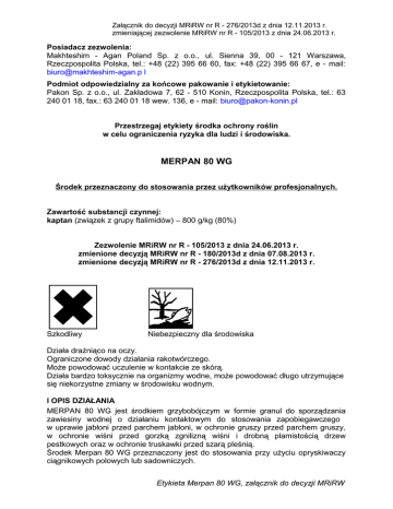 Załącznik do decyzji MRiRW nr R - 276/2013d z dnia 12.11.2013 r. zmieniającej zezwolenie MRiRW nr R - 105/2013 z dnia 24.06.2013 r. Posiadacz zezwolenia: Makhteshim - Agan Poland Sp. z o.o., ul. Sienna 39, 00 - 121 Warszawa, Rzeczpospolita Polska, tel.: +48 (22) 395 66 60, fax: +48 (22) 395 66 67, e - mail: [email protected] l Podmiot odpowiedzialny za końcowe pakowanie i etykietowanie: Pakon Sp. z o.o., ul. Zakładowa 7, 62 - 510 Konin, Rzeczpospolita Polska, tel.: 63 240 01 18, fax.: 63 240 01 18 wew. 136, e - mail: [email protected] Przestrzegaj etykiety środka ochrony roślin w celu ograniczenia ryzyka dla ludzi i środowiska. MERPAN 80 WG Środek przeznaczony do stosowania przez użytkowników profesjonalnych. Zawartość substancji czynnej: kaptan (związek z grupy ftalimidów) – 800 g/kg (80%) Zezwolenie MRiRW nr R - 105/2013 z dnia 24.06.2013 r. zmienione decyzją MRiRW nr R - 180/2013d z dnia 07.08.2013 r. zmienione decyzją MRiRW nr R - 276/2013d z dnia 12.11.2013 r. Szkodliwy Niebezpieczny dla środowiska Działa drażniąco na oczy. Ograniczone dowody działania rakotwórczego. Może powodować uczulenie w kontakcie ze skórą. Działa bardzo toksycznie na organizmy wodne, może powodować długo utrzymujące się niekorzystne zmiany w środowisku wodnym. I OPIS DZIAŁANIA MERPAN 80 WG jest środkiem grzybobójczym w formie granul do sporządzania zawiesiny wodnej o działaniu kontaktowym do stosowania zapobiegawczego w uprawie jabłoni przed parchem jabłoni, w ochronie gruszy przed parchem gruszy, w ochronie wiśni przed gorzką zgnilizną wiśni i drobną plamistością drzew pestkowych oraz w ochronie truskawki przed szarą pleśnią. Środek Merpan 80 WG przeznaczony jest do stosowania przy użyciu opryskiwaczy ciągnikowych polowych lub sadowniczych. Etykieta Merpan 80 WG, załącznik do decyzji MRiRW Załącznik do decyzji MRiRW nr R - 276/2013d z dnia 12.11.2013 r. zmieniającej zezwolenie MRiRW nr R - 105/2013 z dnia 24.06.2013 r. II ZASTOSOWANIE ŚRODKA 1. Jabłoń Parch jabłoni Środek stosować od momentu nabrzmiewania pąków kwiatowych w całym okresie zagrożenia chorobą. Maksymalna dawka dla jednorazowego zastosowania: 1,9 kg/ha. Zalecana dawka dla jednorazowego stosowania: 1,9 kg/ha. Maksymalna liczba zabiegów w sezonie wegetacyjnym: 7. Odstęp między zabiegami: 10 dni. Zalecana ilość wody: 750 l/ha. Zalecane opryskiwanie: średniokropliste. 2.Grusza Parch gruszy Środek stosować od momentu nabrzmiewania pąków kwiatowych w całym okresie zagrożenia chorobą. Maksymalna dawka dla jednorazowego zastosowania: 1,9 kg/ha. Zalecana dawka dla jednorazowego stosowania: 1,9 kg/ha. Maksymalna liczba zabiegów w sezonie wegetacyjnym: 7. Odstęp miedzy zabiegami: 10 dni. Zalecana ilość wody: 750 l/ha. Zalecane opryskiwanie: średniokropliste. 3. Wiśnia Gorzka zgnilizna wiśni, drobna plamistość drzew pestkowych. Środek stosować od końca fazy kwitnienia. Maksymalna dawka dla jednorazowego zastosowania: 1,9 kg/ha. Zalecana dawka dla jednorazowego stosowania: 1,9 kg/ha. Maksymalna liczba zabiegów w sezonie wegetacyjnym: 3. Odstęp miedzy zabiegami: 10 dni. Zalecana ilość wody: 1000 l/ha. Zalecane opryskiwanie: średniokropliste. UWAGI: W okresie kwitnienia drzew środek stosować tylko wieczorem, po zakończeniu dziennego oblotu pszczół. STOSOWANIE ŚRODKA OCHRONY ROŚLIN W UPRAWACH I ZASTOSOWANIACH MAŁOOBSZAROWYCH Odpowiedzialność za skuteczność działania i fitotoksyczność środka ochrony roślin stosowanego w uprawach małoobszarowych ponosi wyłącznie jego użytkownik. Truskawka Szara pleśń Maksymalna dawka dla jednorazowego zastosowania: 1,9 kg/ha. Zalecana dawka dla jednorazowego zastosowania: 1,9 kg/ha. Etykieta Merpan 80 WG, załącznik do decyzji MRiRW Załącznik do decyzji MRiRW nr R - 276/2013d z dnia 12.11.2013 r. zmieniającej zezwolenie MRiRW nr R - 105/2013 z dnia 24.06.2013 r. Maksymalna liczba zabiegów w sezonie wegetacyjnym: 2. Minimalny odstęp pomiędzy zabiegami: 10 dni. Środek stosować od fazy gdy kwiatostany pogrubiają się a kwiaty są mocno ściśnięte ze sobą aż do pełni fazy kwitnienia. Zalecana ilość wody: 1000-1200 l/ha. Zalecane opryskiwanie: średnio lub drobnokropliste III SPORZĄDZANIE CIECZY UŻYTKOWEJ Podczas sporządzenia cieczy użytkowej stosować: rękawice ochronne, ochronę dróg oddechowych (półmaska klasy FFP3) i ubranie ochronne . Przed przystąpieniem do sporządzania cieczy użytkowej dokładnie ustalić potrzebną jej ilość. Odważoną ilość środka wsypać do zbiornika opryskiwacza napełnionego częściowo wodą (z włączonym mieszadłem). Opróżnione opakowania przepłukać trzykrotnie wodą a popłuczyny wlać do zbiornika opryskiwacza z cieczą użytkową. Następnie zbiornik opryskiwacza uzupełnić wodą do potrzebnej ilości. Opryskiwać z włączonym mieszadłem. Po wsypaniu środka do zbiornika opryskiwacza niewyposażonego w mieszadło hydrauliczne ciecz w zbiorniku mechanicznie wymieszać. Środek łatwo tworzy zawiesinę i nie wymaga dodatkowego mieszania w osobnym naczyniu. Po pracy aparaturę dokładnie wymyć. IV ŚRODKI OSTROŻNOŚCI 1. OKRES OD ZASTOSOWANIA ŚRODKA DO DNIA, W KTÓRYM NA OBSZAR, NA KTÓRYM ZASTOSOWANO ŚRODEK MOGĄ WEJŚĆ LUDZIE ORAZ ZOSTAĆ WPROWADZONE ZWIERZĘTA. Nie dotyczy. 2. OKRES PREWENCJI DLA PSZCZÓŁ (okres zapobiegający zatruciu) Nie dotyczy. 3. OKRES OD OSTATNIEGO ZASTOSOWANIA ŚRODKA DO DNIA ZBIORU ROŚLINY UPRAWNEJ (okres karencji) Jabłoń, grusza – 28 dni. Wiśnia – 21 dni. Truskawka – 14 dni. 4. OKRES OD OSTATNIEGO ZASTOSOWANIA ŚRODKA NA ROŚLINY PRZEZNACZONE NA PASZĘ DO DNIA, W KTÓRYM ZWIERZĘTA MOGĄ BYĆ KARMIONE TYMI ROŚLINAMI (okres karencji dla pasz) Nie dotyczy. 5. OKRES OD OSTATNIEGO ZASTOSOWANIA ŚRODKA NA ROŚLINY DO DNIA, W KTÓRYM MOŻNA SIAĆ LUB SADZIĆ ROŚLINY UPRAWIANE NASTĘPCZO Nie dotyczy. 6. OCHRONA STOSUJĄCEGO ŚRODEK OCHRONY ROŚLIN Nie jeść i nie pić oraz nie palić tytoniu podcza