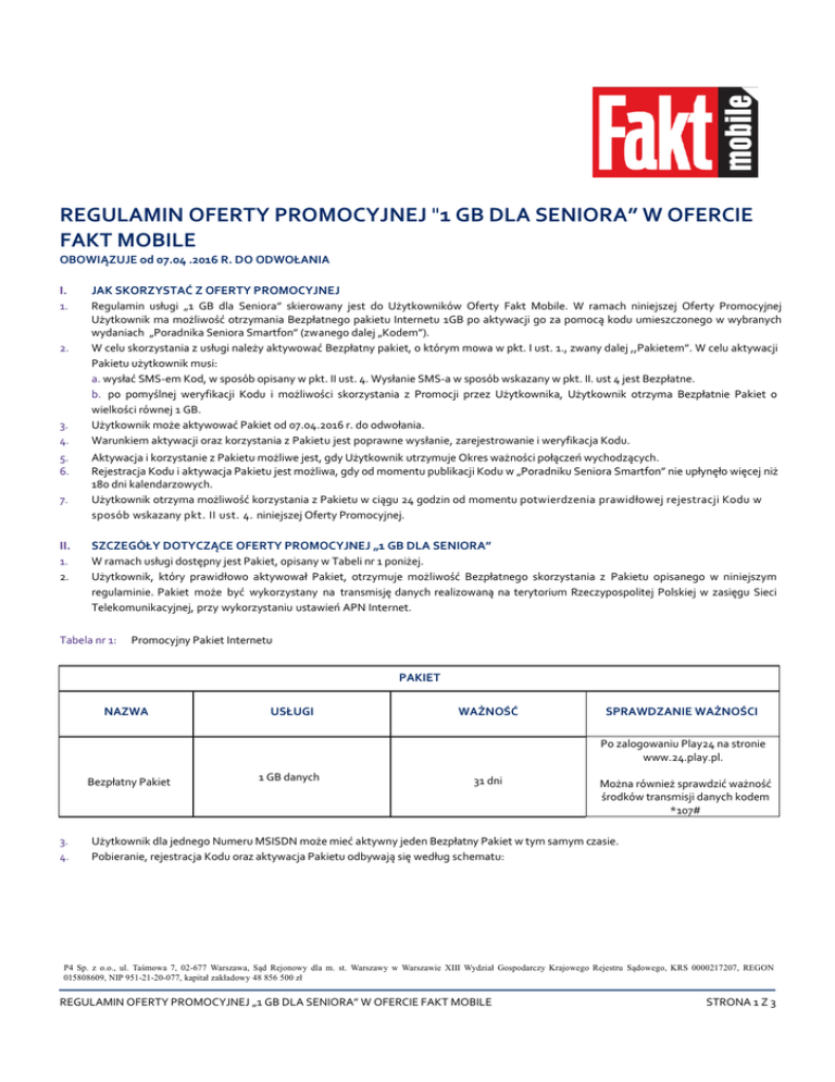 REGULAMIN OFERTY PROMOCYJNEJ "1 GB DLA SENIORA” W OFERCIE FAKT MOBILE OBOWIĄZUJE od 07.04 .2016 R. DO ODWOŁANIA I. JAK SKORZYSTAĆ Z OFERTY PROMOCYJNEJ 1. Regulamin usługi „1 GB dla Seniora” skierowany jest do Użytkowników Oferty Fakt Mobile. W ramach niniejszej Oferty Promocyjnej Użytkownik ma możliwość otrzymania Bezpłatnego pakietu Internetu 1GB po aktywacji go za pomocą kodu umieszczonego w wybranych wydaniach „Poradnika Seniora Smartfon” (zwanego dalej „Kodem”). W celu skorzystania z usługi należy aktywować Bezpłatny pakiet, o którym mowa w pkt. I ust. 1., zwany dalej ,,Pakietem”. W celu aktywacji Pakietu użytkownik musi: a. wysłać SMS-em Kod, w sposób opisany w pkt. II ust. 4. Wysłanie SMS-a w sposób wskazany w pkt. II. ust 4 jest Bezpłatne. b. po pomyślnej weryfikacji Kodu i możliwości skorzystania z Promocji przez Użytkownika, Użytkownik otrzyma Bezpłatnie Pakiet o wielkości równej 1 GB. Użytkownik może aktywować Pakiet od 07.04.2016 r. do odwołania. Warunkiem aktywacji oraz korzystania z Pakietu jest poprawne wysłanie, zarejestrowanie i weryfikacja Kodu. 2. 3. 4. 5. 6. 7. Aktywacja i korzystanie z Pakietu możliwe jest, gdy Użytkownik utrzymuje Okres ważności połączeń wychodzących. Rejestracja Kodu i aktywacja Pakietu jest możliwa, gdy od momentu publikacji Kodu w „Poradniku Seniora Smartfon” nie upłynęło więcej niż 180 dni kalendarzowych. Użytkownik otrzyma możliwość korzystania z Pakietu w ciągu 24 godzin od momentu potwierdzenia prawidłowej rejestracji Kodu w sposób wskazany pkt. II ust. 4. niniejszej Oferty Promocyjnej. II. SZCZEGÓŁY DOTYCZĄCE OFERTY PROMOCYJNEJ „1 GB DLA SENIORA” 1. 2. W ramach usługi dostępny jest Pakiet, opisany w Tabeli nr 1 poniżej. Użytkownik, który prawidłowo aktywował Pakiet, otrzymuje możliwość Bezpłatnego skorzystania z Pakietu opisanego w niniejszym regulaminie. Pakiet może być wykorzystany na transmisję danych realizowaną na terytorium Rzeczypospolitej Polskiej w zasięgu Sieci Telekomunikacyjnej, przy wykorzystaniu ustawień APN Internet. Tabela nr 1: Promocyjny Pakiet Internetu PAKIET NAZWA USŁUGI WAŻNOŚĆ SPRAWDZANIE WAŻNOŚCI Po zalogowaniu Play24 na stronie www.24.play.pl. Bezpłatny Pakiet 3. 4. 1 GB danych 31 dni Można również sprawdzić ważność środków transmisji danych kodem *107# Użytkownik dla jednego Numeru MSISDN może mieć aktywny jeden Bezpłatny Pakiet w tym samym czasie. Pobieranie, rejestracja Kodu oraz aktywacja Pakietu odbywają się według schematu: P4 Sp. z o.o., ul. Taśmowa 7, 02-677 Warszawa, Sąd Rejonowy dla m. st. Warszawy w Warszawie XIII Wydział Gospodarczy Krajowego Rejestru Sądowego, KRS 0000217207, REGON 015808609, NIP 951-21-20-077, kapitał zakładowy 48 856 500 zł REGULAMIN OFERTY PROMOCYJNEJ „1 GB DLA SENIORA” W OFERCIE FAKT MOBILE STRONA 1 Z 3 a. Sposób pobierania Kodu W celu uzyskania Kodu należy zakupić „Poradnik Seniora Smartfon”. Kod został umieszczony w poradniku na tylnej okładce od strony wewnętrznej. b. Sposób Rejestracji Kodu W celu rejestracji Kodu należy wysłać go w treści wiadomości SMS pod numer 4949. Użytkownik otrzyma potwierdzenie zgłoszenia SMSem. c. Aktywacja Pakietu Jeśli weryfikacja Kodu będzie pozytywna, Bezpłatny Pakiet Internetu zostanie aktywowany automatycznie w ciągu 24 godzin. 5. 6. 7. 8. 9. 10. 11. W przypadku gdy Użytkownik nie korzysta z innych pakietów internetowych, po wykorzystaniu Pakietu opłata za transmisję danych nie jest naliczana, a Użytkownik korzysta z transmisji danych ze zmniejszoną prędkością – do 32 kb/s. Ważność pakietu została opisana w Tabeli nr 1. W przypadku utraty Okresu ważności połączeń wychodzących w trakcie okresu ważności Pakietu, korzystanie z Pakietu możliwe będzie pod warunkiem dokonania Doładowania konta przed upływem okresu ważności Pakietu. W przypadku aktywowania Pakietu, transmisja danych rozliczana jest w pierwszej kolejności z Pakietu, a po jego wyczerpaniu zgodnie z zasadami wymienionymi w punkcie II ust. 5. niniejszego regulaminu. Korzystanie z Internetu w ramach Pakietu odbywa się z prędkością do 70 Mb/s dla pobierania danych oraz do 20 Mb/s dla wysyłania danych. Rzeczywista prędkość przesyłania danych zależy od szeregu czynników takich jak m.in. obciążenie stacji bazowej, rodzaj technologii wspieranej przez telekomunikacyjne urządzenie końcowe, z którego korzysta Użytkownik, siła odbieranego sygnału, ukształtowanie terenu oraz warunki atmosferyczne. Operator informuje, że ze względów technologicznych może czasowo lub na stałe znieść ograniczenie prędkości transmisji. W takim przypadku maksymalną możliwą prędkość przesyłania danych wyznacza dostępna w danej lokalizacji technologia transmisji mobilnej wykorzystywana przez Operatora, przy czym rzeczywista prędkość przesyłania danych zależy od szeregu czynników, w tym wymienionych w ust. 9 powyżej. Za wyjątkiem punktu II ust. 3 skorzystanie z niniejszej usługi nie wyklucza korzystania z innych Ofert Promocyjnych dostępnych łącznie z Ofertą, z której korzysta Użytkownik, chyba że warunki innych Ofert Promocyjnych stanowią inaczej. III. POSTANOWIENIA KOŃCOWE 1. Operator zastrzega sobie prawo do zmiany lub odwołania niniejszego regulaminu w każdym czasie bez podawania przyczyny, z zastrzeżeniem, że zmiana lub odwołanie nie wpływa na prawa i obowiązki uprzednio nabyte przez Użytkownika, co oznacza, że Użytkownik może korzystać ze środków przyznanych przed zmianą lub odwołaniem, ale nie będzie miał możliwości aktywowania Pakietu na nowo. Informacja o zmianie lub odwołaniu usługi zostanie opublikowana na stronie internetowej www.play.pl lub www.faktmobile.pl lub w inny sposób podana do wiadomości publicznej. Wszelkie wyrazy lub wyrażenia pisane w treści niniejszego regulaminu dużą literą należy rozumieć zgodnie z ich definicją zawartą odpowiedni
