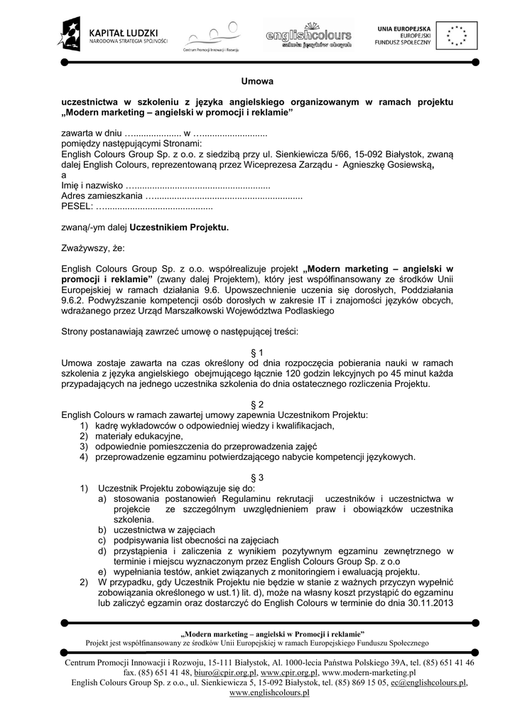 Umowa uczestnictwa w szkoleniu z języka angielskiego organizowanym w ramach projektu „Modern marketing – angielski w promocji i reklamie” zawarta w dniu …................... w ….......................... pomiędzy następującymi Stronami: English Colours Group Sp. z o.o. z siedzibą przy ul. Sienkiewicza 5/66, 15-092 Białystok, zwaną dalej English Colours, reprezentowaną przez Wiceprezesa Zarządu - Agnieszkę Gosiewską, a Imię i nazwisko …...................................................... Adres zamieszkania …........................................................... PESEL: …........................................... zwaną/-ym dalej Uczestnikiem Projektu. Zważywszy, że: English Colours Group Sp. z o.o. współrealizuje projekt „Modern marketing – angielski w promocji i reklamie” (zwany dalej Projektem), który jest współfinansowany ze środków Unii Europejskiej w ramach działania 9.6. Upowszechnienie uczenia się dorosłych, Poddziałania 9.6.2. Podwyższanie kompetencji osób dorosłych w zakresie IT i znajomości języków obcych, wdrażanego przez Urząd Marszałkowski Województwa Podlaskiego Strony postanawiają zawrzeć umowę o następującej treści: §1 Umowa zostaje zawarta na czas określony od dnia rozpoczęcia pobierania nauki w ramach szkolenia z języka angielskiego obejmującego łącznie 120 godzin lekcyjnych po 45 minut każda przypadających na jednego uczestnika szkolenia do dnia ostatecznego rozliczenia Projektu. §2 English Colours w ramach zawartej umowy zapewnia Uczestnikom Projektu: 1) kadrę wykładowców o odpowiedniej wiedzy i kwalifikacjach, 2) materiały edukacyjne, 3) odpowiednie pomieszczenia do przeprowadzenia zajęć 4) przeprowadzenie egzaminu potwierdzającego nabycie kompetencji językowych. 1) 2) §3 Uczestnik Projektu zobowiązuje się do: a) stosowania postanowień Regulaminu rekrutacji uczestników i uczestnictwa w projekcie ze szczególnym uwzględnieniem praw i obowiązków uczestnika szkolenia. b) uczestnictwa w zajęciach c) podpisywania list obecności na zajęciach d) przystąpienia i zaliczenia z wynikiem pozytywnym egzaminu zewnętrznego w terminie i miejscu wyznaczonym przez English Colours Group Sp. z o.o e) wypełniania testów, ankiet związanych z monitoringiem i ewaluacją projektu. W przypadku, gdy Uczestnik Projektu nie będzie w stanie z ważnych przyczyn wypełnić zobowiązania określonego w ust.1) lit. d), może na własny koszt przystąpić do egzaminu lub zaliczyć egzamin oraz dostarczyć do English Colours w terminie do dnia 30.11.2013 „Modern marketing – angielski w Promocji i reklamie” Projekt jest współfinansowany ze środków Unii Europejskiej w ramach Europejskiego Funduszu Społecznego Centrum Promocji Innowacji i Rozwoju, 15-111 Białystok, Al. 1000-lecia Państwa Polskiego 39A, tel. (85) 651 41 46 fax. (85) 651 41 48, [email protected], www.cpir.org.pl, www.modern-marketing.pl English Colours Group Sp. z o.o., ul. Sienkiewicza 5, 15-092 Białystok, tel. (85) 869 15 05, [email protected], www.englishcolours.pl r. dokumenty potwierdzające odbycie i zaliczenie egzaminu. §4 1) Uczestnik Projektu ma prawo opuścić 20% godzin zajęć lekcyjnych w ramach całego szkolenia. Opuszczenie większej ilości godzin skutkuje koniecznością usprawiedliwienia każdej godziny ponad przewidziany limit. Brak należytego usprawiedliwienia powoduje skreślenie z listy Uczestników Projektu, powodując konsekwencje zawarte w § 5 niniejszej umowy 2) Skreślenie z listy Uczestników Projektu nastąpi również w przypadku rażącego naruszenia innych postanowień niniejszej umowy lub regulaminu rekrutacji uczestników i uczestnictwa w projekcie. 1) 2) 3) 4) 5) §5 Całkowity koszt uczestnictwa w projekcie w przeliczeniu na jednego Uczestnika Projektu wynosi 3.470,99 zł brutto ( słownie: trzy tysiące czterysta siedemdziesiąt złotych 99/100). W przypadku, gdy English Colours poniesie straty finansowe spowodowane skreśleniem, nieuzasadnioną ważnymi przyczynami (których nie można było przewidzieć w momencie podpisania umowy) rezygnacją Uczestnika Projektu z udziału Projekcie lub niezaliczeniem egzaminu potwierdzającego nabyte kompetencje językowe, Uczestnik Projektu wpłaci na rachunek bankowy English Colours kwotę określoną w ust.1 w terminie 14 dni kalendarzowych licząc od dnia doręczenia mu wezwania do zapłaty. W przypadku naruszenia terminu płatności Uczestnik Projektu jest zobowiązany do uiszczenia odsetek w wysokości ustawowej za każdy dzień zwłoki. W przypadku rezygnacji z uczestnictwa w projekcie Uczestnik Projektu zobowiązuje się do pisemnego poinformowania o tym fakcie English Colours w terminie nie późniejszym niż 7 dni od zaprzestania uczestnictwa w zajęciach. W przypadku skreślenia bądź rezygnacji z uczestnictwa w projekcie Uczestnik Projektu zobowiązuje się do niezwłocznego zwrotu przekazanego mu kompletu materiałów edukacyjnych. §6 Zmiana warunków niniejszej umowy wymaga formy pisemnej pod rygorem nieważności. §7 W sprawach nieuregulowanych niniejszą umową zastosowanie mają przepisy Kodeksu Cywilnego. Sprawy wynikłe na tle niniejszej umowy rozstrzygał będzie Sąd właściwy dla siedziby English Colours. §8 Umowę sporządzono w dwóch jednobrzmiących egzemplarzach, po jednym dla każdej ze stron. Uczestnik Projektu English Colours „Modern marketing – angielski w Promocji i reklamie” Projekt jest współfinansowany ze środków Unii Europejskiej w ramach Europejskiego Funduszu Społecznego Centrum Promocji Innowacji i Rozwoju, 15-111 Białystok, Al. 1000-lecia Państwa Polskiego 39A, tel. (85) 651 41 46 fax. (85) 651 41 48, [email protected], www.cpir.org.pl, www.modern-marketing.pl English Colours Group Sp. z o.o., ul. Sienkiewicza 5, 15-092 Białystok, tel. (85) 869 15 05, [email protected], www.englishcolours.pl