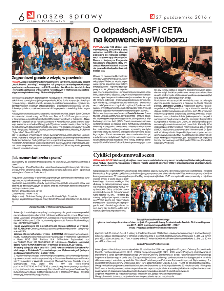 6 nasze sprawy 27 października 2016 r Ziemia Piotrkowska O odpadach, ASF i CETA na konwencie w Wolborzu POWIAT. Liczy 138 stron i jako obowiązujący dokument, z datą ważności do 2030 roku, stanowi podstawę do realizacji nałożonych na samorządy obowiązków. Mowa o Krajowym Programie Gospodarki Odpadami, który wyznacza kierunki działań, w zakresie gospodarki odpadami na najbliższe lata. Zagraniczni goście z wizytą w powiecie POWIAT. Zespół Szkół Ponadgimnazjalnych w Szydłowie, realizujący projekt „Work Based Learning”, wystąpił w roli gospodarza międzynarodowego spotkania, zaplanowanego na 23-29 października. Goście z Austrii, Łotwy i Portugalii spotkali się w Starostwie Powiatowym w Piotrkowie z wicestarostą powiatu piotrkowskiego Piotrem Wojtysiakiem. Wicestarosta przybliżył zagranicznym nauczycielom i młodzieży, funkcjonowanie szkolnictwa ponadgimnazjalnego w powiecie, które ściśle kooperuje z lokalnym rynkiem pracy. – Władze powiatu stawiają na kształcenie zawodowe, zgodne z zapotrzebowaniem lokalnych przedsiębiorców – podkreślał wicestarosta. Taki właśnie cel przyświeca projektowi, w ramach którego powiat odwiedzili goście z zagranicy. Nauczyciele uczestniczący w spotkaniu odwiedzili również Zespół Szkół Centrum Kształcenia Ustawicznego w Wolborzu, Zespół Szkół Ponadgimnazjalnych w Czarnocinie, a dyrektor Zespołu Szkół Ponadgimnazjalnych w Sulejowie – Stanisław Ból – zaprosił ich do Pasieki Zarodowej w Kocierzowych, gdzie praktyki odbywają słuchacze kursów kwalifikacyjnych.Wymiana doświadczeń z polskimi kolegami jest ciekawym doświadczeniem dla obu stron.Tym bardziej, że włączyły się w to firmy i instytucje z Piotrkowa i powiatu piotrkowskiego (Sulimar, Hearing, PUP, hotel „Trybunalski”, GreenFit, MOK). ZSP w Szydłowie wykorzystał tę wizytę, by zorganizować „Dzień Języków Europejskich”. Potrawy z różnych stron Europy przygotowali uczniowie polscy i łotewscy. Zadanie młodzieży z Portugalii to pomoc w organizacji wydarzenia i dokumentowanie działań. Organizacja takiego spotkania to duże wyzwanie organizacyjne, jednak praca zespołowa i wsparcie lokalnych partnerów ZSP w Szydłowie, pozwoliły pokonać wszelkie trudności. Jak rozmawiać trzeba z psem? Zapraszamy do Biblioteki Pedagogicznej na warsztaty: „Jak rozmawiać trzeba z psem?”. Prowadzący: Ewa Pawlikowska - absolwentka zoologii Uniwersytetu Wrocławskiego, trener szkolenia psów, założycielka ośrodka szkolenia psów i opieki nad zwierzętami Grzeczni Podopieczni. Regularnie uczestniczy w polskich i zagranicznych seminariach o tematyce kynologicznej, wciąż udoskonalając swój warsztat pracy. Spotkanie ma charakter otwarty i przeznaczone jest dla właścicieli psów, jak i osób na co dzień zajmujących się psami, oraz dla wszystkich zainteresowanych tematyką szkolenia psów. Termin: 29 października 2016 r. Czas trwania: 10.00-11.30 Miejsce sesji: Biblioteka Pedagogiczna w Piotrkowie Tryb., Czytelnia Zapisy: Wydział Wspomagania Pracy Szkół i Placówek Oświatowych, tel. 649 50 77 Zarząd Powiatu w Piotrkowie Trybunalskim informuje, iż został ogłoszony drugi przetarg ustny nieograniczony na sprzedaż niezabudowanej nieruchomości, położonej w Czarnocinie przy ul. Reymonta, obręb Czarnocin, gmina Czarnocin, oznaczonej w ewidencji gruntów numerem działki 1790/6 o pow. 0,1064 ha, stanowiącej własność Powiatu Piotrkowskiego, KW NR PT1P/00053647/9. Cena wywoławcza dla nieruchomości została ustalona w wysokości: 42.750,00 zł. Cena wywoławcza zawiera podatek od towarów i usług w wysokości 23%. Wadium dla nieruchomości wynosi – 2.500,00 zł, które należy wnieść w pieniądzu (w złotych) na konto Starostwa Powiatowego w Piotrkowie Trybunalskim – Bank BGŻ BNP Paribas S.A. O/Piotrków Trybunalski, numer 53 2030 0045 1110 0000 0138 0140 z dopiskiem „Wadium – sprzedaż działki numer 1790/6 Czarnocin”, w terminie do dnia 8.11.2016 roku. Przetarg odbędzie się w dniu 15.11.2016 roku w siedzibie Starostwa Powiatowego w Piotrkowie Trybunalskim przy ul. Dąbrowskiego 7 (sala posiedzeń Zarządu Powiatu) o godz. 11.00. Z regulaminem przetargu, warunkami przetargu oraz dokumentacją dotyczącą nieruchomości można zapoznać się w Starostwie Powiatowym w Piotrkowie Trybunalskim w Wydziale Inwestycji, Mienia i Rozwoju Powiatu przy ul. Sienkiewicza 16a, pokój 106 i 107 lub telefonicznie pod nr: 44 732 78 30, 44 732 78 36, a ponadto regulamin przetargu zamieszczony jest na stronie internetowej Starostwa Powiatowego w Piotrkowie Trybunalskim www.powiat-piotrkowski.bip.net.pl. w zakładce Wydziały - Wydział Inwestycji, Mienia i Rozwoju Powiatu. Obecni na Konwencie Burmistrzów i Wójtów Ziemi Piotrkowskiej, który odbył się w Wolborzu, włodarze powiatu i gmin, zapoznali się z celami strategicznymi wprowadzonego programu. W głównej mierze polegają one na zapobieganiu i minimalizacji powstawania odpadów, zapewnieniu odzysku, w tym recyklingu i unieszkodliwianie odpadów (poza składowaniem) oraz na bezpiecznym dla zdrowia ludzkiego i środowiska składowaniu śmieci, których nie da się, z uwagi na warunki techniczno - ekonomiczne, poddać procesom odzysku lub utylizacji. Spotkanie miało na celu przygotowanie jednolitych standardów selektywnego zbierania odpadów komunalnych na terenie gmin powiatu. Na konwent zaproszono również dr Pawła Śpiewaka Powiatowego Lekarza Weterynarii, aby przestrzec i omówić działania zapobiegawcze przeciw zagrożeniu, jakim jest wirus afrykańskiego pomoru świń (ASF). Powiat piotrkowski, na którego terenie hoduje się rocznie blisko 430 tysięcy sztuk trzody chlewnej, w przypadku zawleczenia - niestety z winy człowieka - śmiertelnie zjadliwego wirusa, wywołałby nie tylko ogromne straty dla rolników, ale klęskę ekonomiczną dla całego regionu. Zarażone zwierzęta nie można bowiem leczyć, a jedynie zabić i zutylizować. Są 