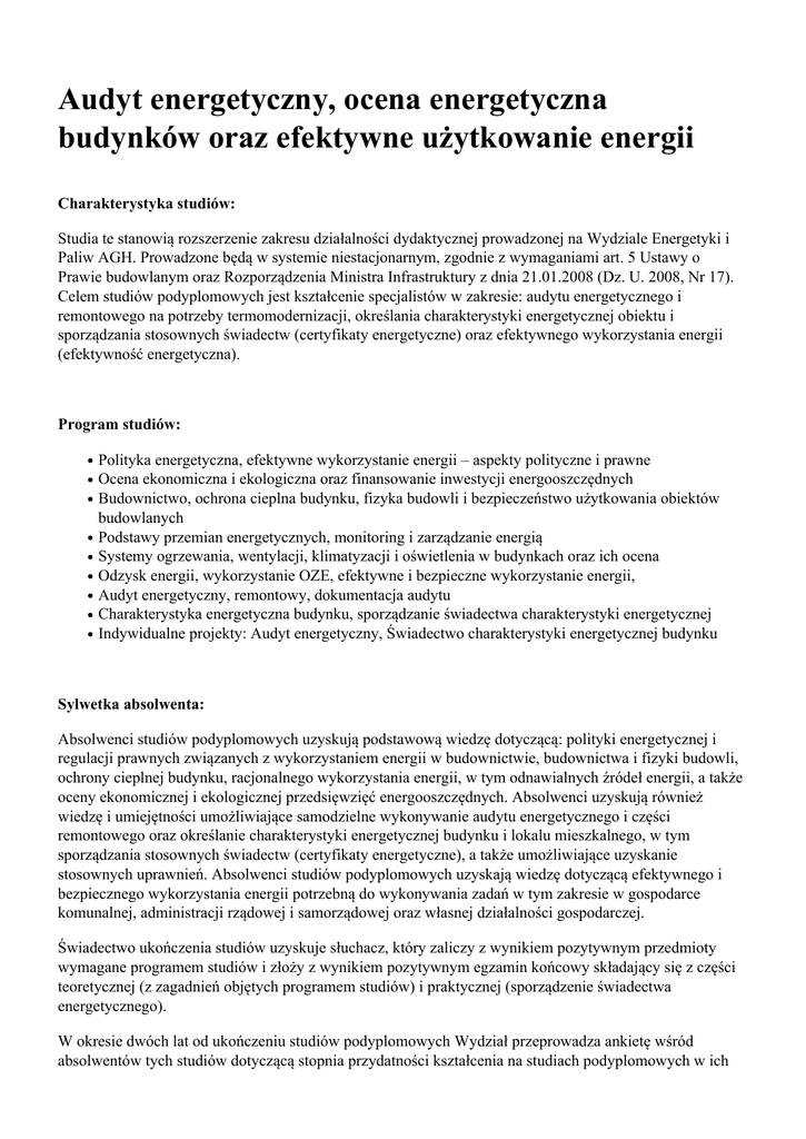 Audyt energetyczny, ocena energetyczna budynków oraz efektywne użytkowanie energii Charakterystyka studiów: Studia te stanowią rozszerzenie zakresu działalności dydaktycznej prowadzonej na Wydziale Energetyki i Paliw AGH. Prowadzone będą w systemie niestacjonarnym, zgodnie z wymaganiami art. 5 Ustawy o Prawie budowlanym oraz Rozporządzenia Ministra Infrastruktury z dnia 21.01.2008 (Dz. U. 2008, Nr 17). Celem studiów podyplomowych jest kształcenie specjalistów w zakresie: audytu energetycznego i remontowego na potrzeby termomodernizacji, określania charakterystyki energetycznej obiektu i sporządzania stosownych świadectw (certyfikaty energetyczne) oraz efektywnego wykorzystania energii (efektywność energetyczna). Program studiów: Polityka energetyczna, efektywne wykorzystanie energii – aspekty polityczne i prawne Ocena ekonomiczna i ekologiczna oraz finansowanie inwestycji energooszczędnych Budownictwo, ochrona cieplna budynku, fizyka budowli i bezpieczeństwo użytkowania obiektów budowlanych Podstawy przemian energetycznych, monitoring i zarządzanie energią Systemy ogrzewania, wentylacji, klimatyzacji i oświetlenia w budynkach oraz ich ocena Odzysk energii, wykorzystanie OZE, efektywne i bezpieczne wykorzystanie energii, Audyt energetyczny, remontowy, dokumentacja audytu Charakterystyka energetyczna budynku, sporządzanie świadectwa charakterystyki energetycznej Indywidualne projekty: Audyt energetyczny, Świadectwo charakterystyki energetycznej budynku Sylwetka absolwenta: Absolwenci studiów podyplomowych uzyskują podstawową wiedzę dotyczącą: polityki energetycznej i regulacji prawnych związanych z wykorzystaniem energii w budownictwie, budownictwa i fizyki budowli, ochrony cieplnej budynku, racjonalnego wykorzystania energii, w tym odnawialnych źródeł energii, a także oceny ekonomicznej i ekologicznej przedsięwzięć energooszczędnych. Absolwenci uzyskują również wiedzę i umiejętności umożliwiające samodzielne wykonywanie audytu energetycznego i części remontowego oraz określanie charakterystyki energetycznej budynku i lokalu mieszkalnego, w tym sporządzania stosownych świadectw (certyfikaty energetyczne), a także umożliwiające uzyskanie stosownych uprawnień. Absolwenci studiów podyplomowych uzyskają wiedzę dotyczącą efektywnego i bezpiecznego wykorzystania energii potrzebną do wykonywania zadań w tym zakresie w gospodarce komunalnej, administracji rządowej i samorządowej oraz własnej działalności gospodarczej. Świadectwo ukończenia studiów uzyskuje słuchacz, który zaliczy z wynikiem pozytywnym przedmioty wymagane programem studiów i złoży z wynikiem pozytywnym egzamin końcowy składający się z części teoretycznej (z zagadnień objętych programem studiów) i praktycznej (sporządzenie świadectwa energetycznego). W okresie dwóch lat od ukończeniu studiów podyplomowych Wydział przeprowadza ankietę wśród absolwentów tych studiów dotyczącą stopnia przydatności kształcenia na studiach podyplomowych w ich W okresie dwóch lat od ukończeniu studiów podyplomowych Wydział przeprowadza ankietę wśród absolwentów tych studiów dotyczącą stopnia przydatności kształcenia na studiach podyplomowych w ich pracy zawodowej. Program studiów podyplomowych, jego realizacja i uzyskane efekty oceniane są przez Wydziałową Komisję ds. Kształcenia w ramach wydziałowego systemu zapewnienia jakości kształcenia. Czas trwania: 2 semestry (od III 2017 r. do II 2018 r.) Termin zgłoszeń: do końca III 2017 r. Wymagane dokumenty: podanie o przyjęcie na studia podyplomowe, odpis dyplomu ukończenia studiów, kserokopia dowodu tożsamości, potwierdzenie wniesienia opłaty za postępowanie kwalifikacyjne. Studia podyplomowe skierowane są do absolwentów, którzy ukończyli, w rozumieniu przepisów o szkolnictwie wyższym, co najmniej studia magisterskie albo studia inżynierskie na kierunkach: architektura, budownictwo, inżynieria środowiska, inżynieria materiałowa, mechanizacja rolnictwa, energetyka lub pokrewnych. Tryb zgłoszeń: kolejność zgłoszeń Liczba miejsc: 30 Miejsce zgłoszeń: AGH, Wydział Energetyki i Paliw al. Mickiewicza 30, 30-059 Kraków pawilon D-4, pokój 18 Osoby przyjmujące zgłoszenia: Małgorzata Kot, Elżbieta Gołdasz Opłaty: 4 800 zł Informacje dodatkowe: Zajęcia na studiach podyplomowych prowadzone będą w systemie niestacjonarnym i odbywać się będą w 16 sesjach dwudniowych (sobota-niedziela) w okresie dwóch semestrów akademickich. Organizator studiów podyplomowych: Wydział Energetyki i Paliw Adres organizatora: al. Mickiewicza 30, 30-059 Kraków pawilon D-4, pokój 18 tel.: 12 617 25 68 fax: 12 617 25 68 e-mail: [email protected] http://www.weip.agh.edu.pl/ Kierownik: dr inż. Leszek Kurcz Osoby do kontaktu: mgr inż. Małgorzata Kot, mgr inż. Elżbieta Gołdasz