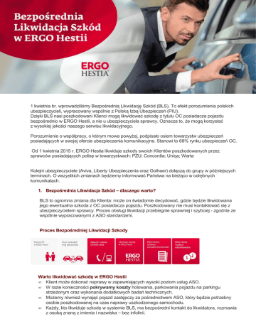 Bezpośrednia Likwidacja Szkód Od kwietnia w ERGO Hestii 1 kwietnia br. wprowadziliśmy Bezpośrednią Likwidację Szkód (BLS). To efekt porozumienia polskich ubezpieczycieli, wypracowany wspólnie z Polską Izbą Ubezpieczeń (PIU). Dzięki BLS nasi poszkodowani Klienci mogą likwidować szkodę z tytułu OC posiadacza pojazdu bezpośrednio w ERGO Hestii, a nie u ubezpieczyciela sprawcy. Oznacza to, że mogą korzystać z wysokiej jakości naszego serwisu likwidacyjnego. Porozumienie o współpracy, o którym mowa powyżej, podpisało osiem towarzystw ubezpieczeń posiadających w swojej ofercie ubezpieczenia komunikacyjne. Stanowi to 68% rynku ubezpieczeń OC. Od 1 kwietnia 2015 r. ERGO Hestia likwiduje szkody swoich Klientów poszkodowanych przez sprawców posiadających polisę w towarzystwach: PZU; Concordia; Uniqa; Warta Kolejni ubezpieczyciele (Aviva, Liberty Ubezpieczenia oraz Gothaer) dołączą do grupy w późniejszych terminach. O wszystkich zmianach będziemy informować Państwa na bieżąco w odrębnych komunikatach. 1. Bezpośrednia Likwidacja Szkód – dlaczego warto? BLS to ogromna zmiana dla Klienta: może on świadomie decydować, gdzie będzie likwidowana jego ewentualna szkoda z OC posiadacza pojazdu. Poszkodowany nie musi kontaktować się z ubezpieczycielem sprawcy. Proces obsługi likwidacji przebiegnie sprawniej i szybciej - zgodnie ze wspólnie wypracowanymi z ASO standardami. Proces Bezpośredniej Likwidacji Szkody Warto likwidować szkodę w ERGO Hestii • Klient może dokonać naprawy w zapewniających wysoki poziom usług ASO. • W razie konieczności pokrywamy koszty holowania, parkowania pojazdu na parkingu strzeżonym oraz wykonania dodatkowych badań technicznych. • Możemy również wynająć pojazd zastępczy za pośrednictwem ASO, który będzie potrzebny osobie poszkodowanej na czas naprawy uszkodzonego samochodu. • Każdy, kto likwiduje szkodę w systemie BLS, ma bezpośredni kontakt do likwidatora, rozmawia z osobą znaną z imienia i nazwiska – bez infolinii. • Zgłoszenie i wypłata odszkodowania nie obciąża historii szkodowej Poszkodowanego. Klient jest obsłużony zgodnie ze sprawdzonymi standardami współpracy z ERGO Hestią. 2. Bezpośrednia Likwidacja Szkód – jak to działa? W realizowanym przez ERGO Hestię procesie Bezpośredniej Likwidacji Szkód mogą Państwo liczyć na stosowanie dotychczasowych procedur, obowiązujących przy likwidacji szkód z OC sprawcy posiadającego ubezpieczenie w ERGO Hestii: • Procedury rozliczeń z ASO – zgodnie z procedurami obowiązującymi dotychczas / zgodnie z podpisanymi umowami likwidacyjnymi. • Ścieżka likwidacji – zgodnie z procedurami obowiązującymi dotychczas / zgodnie z podpisanymi umowami likwidacyjnymi. • W konstrukcji stosowanej przez ERGO Hestię nie ma potrzeby podpisywania żadnych dodatkowych upoważnień w ramach obsługi procesu BLS. • Formularz zgłoszenia szkody – analogiczny jak stosowany dotychczas. • O możliwości zlikwidowania szkody w ramach procesu BLS decyduje ważność polisy OC w dniu zdarzenia oraz data zgłoszenia szkody • Szkoda jest raportowana przez TU sprawcy i obciąża jego konto. Korzystający z usługi BLS nie jest obciążany zwyżką za szkodę, ponieważ na jego koncie szkoda z BLS nie jest widoczna. Usługa BLS jest stosowana, gdy: • W kolizji uczestniczyły maksymalnie 2 pojazdy. • Uszkodzeniu uległ pojazd lub mienie znajdujące się wewnątrz pojazdu, nieprzekraczające wyznaczonego limitu – tj. 30 tys. zł. • Szkoda miała miejsca na terytorium Polski. • Sprawca jest ubezpieczony w towarzystwie, które przystąpiło do porozumienia (od 01.04.2015 r. – PZU, Concordia, Uniqa, Warta). Sposoby zgłaszania szkód: • Przez telefon, za pośrednictwem infolinii pod czynny całą dobę numer 801 107 107* lub +48 58 555 55 55* • Korespondencyjnie, przesyłając zgłoszenie listem/faxem na nr +58 555 60 61 • Przez formularze na stronie internetowej ERGO Hestii *opłata zgodna z cennikiem operatora 3. Najwyższy Standard Ochrony – wysoki poziom likwidacji szkód Likwidacja szkody to moment, w którym Klient przekonuje się, co naprawdę kupił i czy podjął słuszną decyzję. ERGO Hestia od lat spełnia daną Klientowi obietnicę, oferując wysoki poziom likwidacji szkody. • • • Nasz system likwidacji szkód został uhonorowany Godłem Promocyjnym „Teraz Polska”. ASO doceniło współpracę z Ergo Hestią, przyznając w 2014 roku nagrodę „Złoty Zderzak”. Klienci ERGO Hestii polecają naszą likwidację szkód dwukrotnie częściej* niż robią to Klienci w innych towarzystwach ubezpieczeniowych. NPS ERGO Hestia 48 Rynek 22 * Badanie przeprowadzone na 685 Klientach (ERGO Hestia 491 i rynek 194) w obszarach współpracy z ERGO Hestią takich jak doradztwo Agenta, likwidacja szkód, obsługa oraz ogólne polecenie towarzystwa ubezpieczeń.